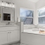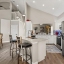 Inside, you are greeted by a dedicated office/den to the left, flowing into a soaring, open-concept living and dining area with high ceilings and abundant natural light. The chef’s kitchen is fully equipped with custom cabinetry, Quartz countertops, a central island, farmhouse sink, breakfast nook, and plenty of room for gatherings, making it ideal for family meals or entertaining friends. Tile flooring throughout the main living area ensures low maintenance and a modern, polished look.