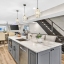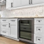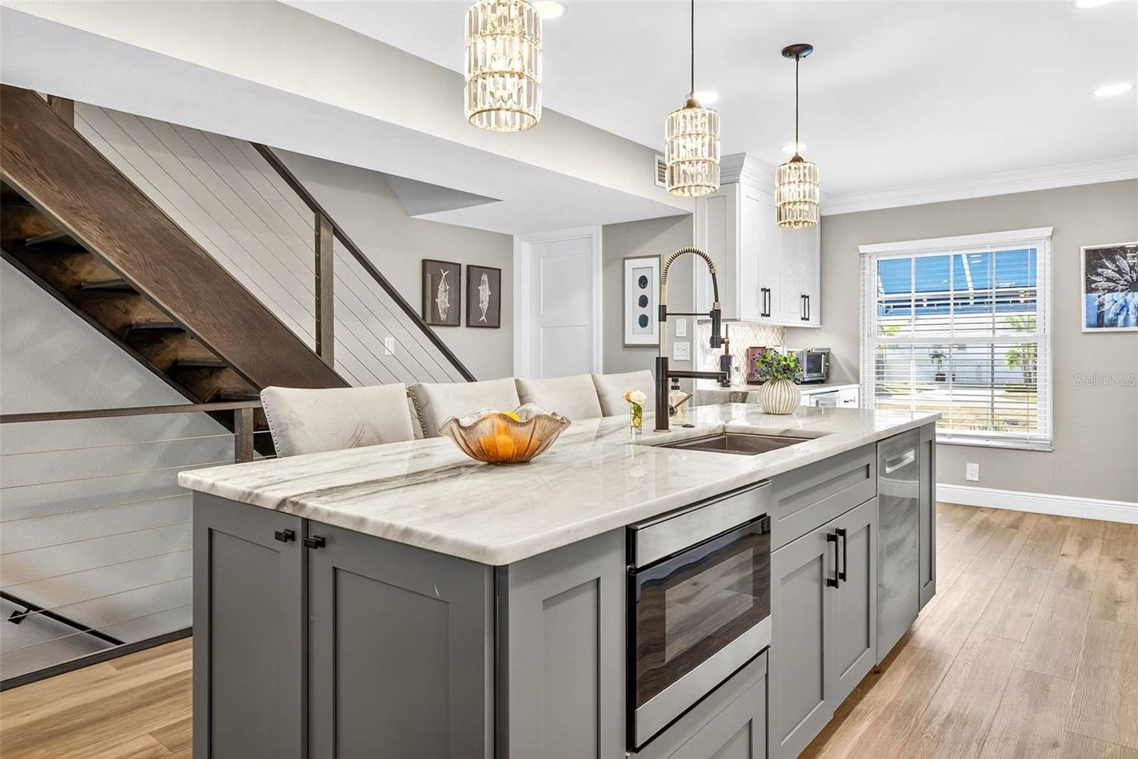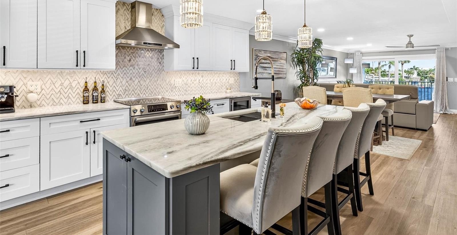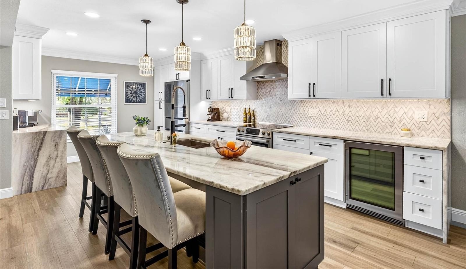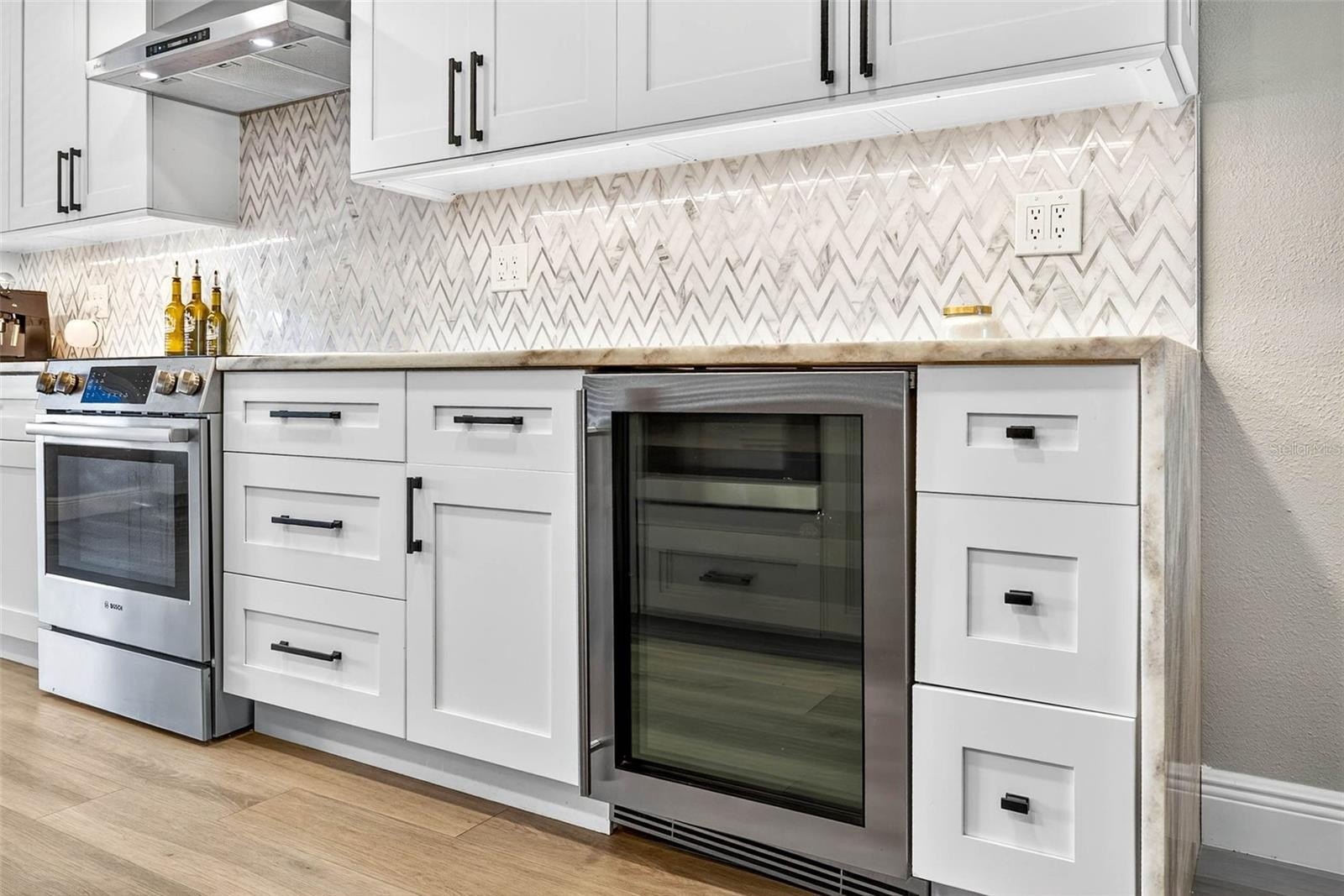 Gourmet Kitchen includes Custom shaker cabinets, marble countertops with dual waterfall edges, Bosch stainless steel appliance ensemble, large wine cooler, and separate beverage center.