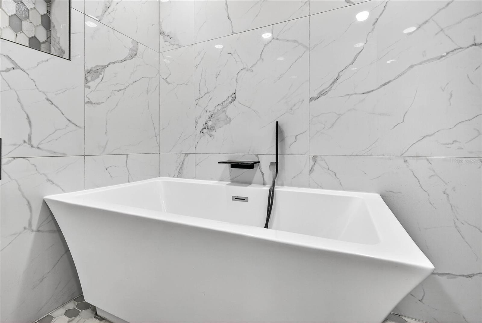 Primary Suite Oasis: Quartz countertops, dual vanities, walk-in shower with dual rainfall heads and bench, high-end soaking tub, and instant hot water in just 20 seconds.