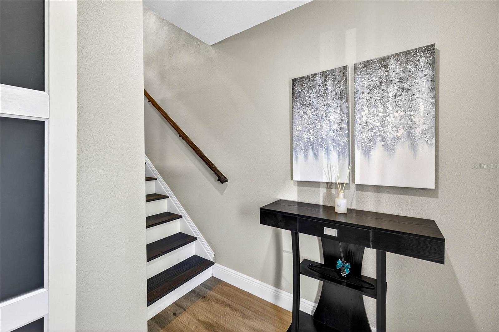 Luxury Interiors: Impact-rated windows and doors, custom-fabricated modern wood and steel cable staircase railing, designer lighting, crown molding, and a custom electric fireplace for everyday ambiance.