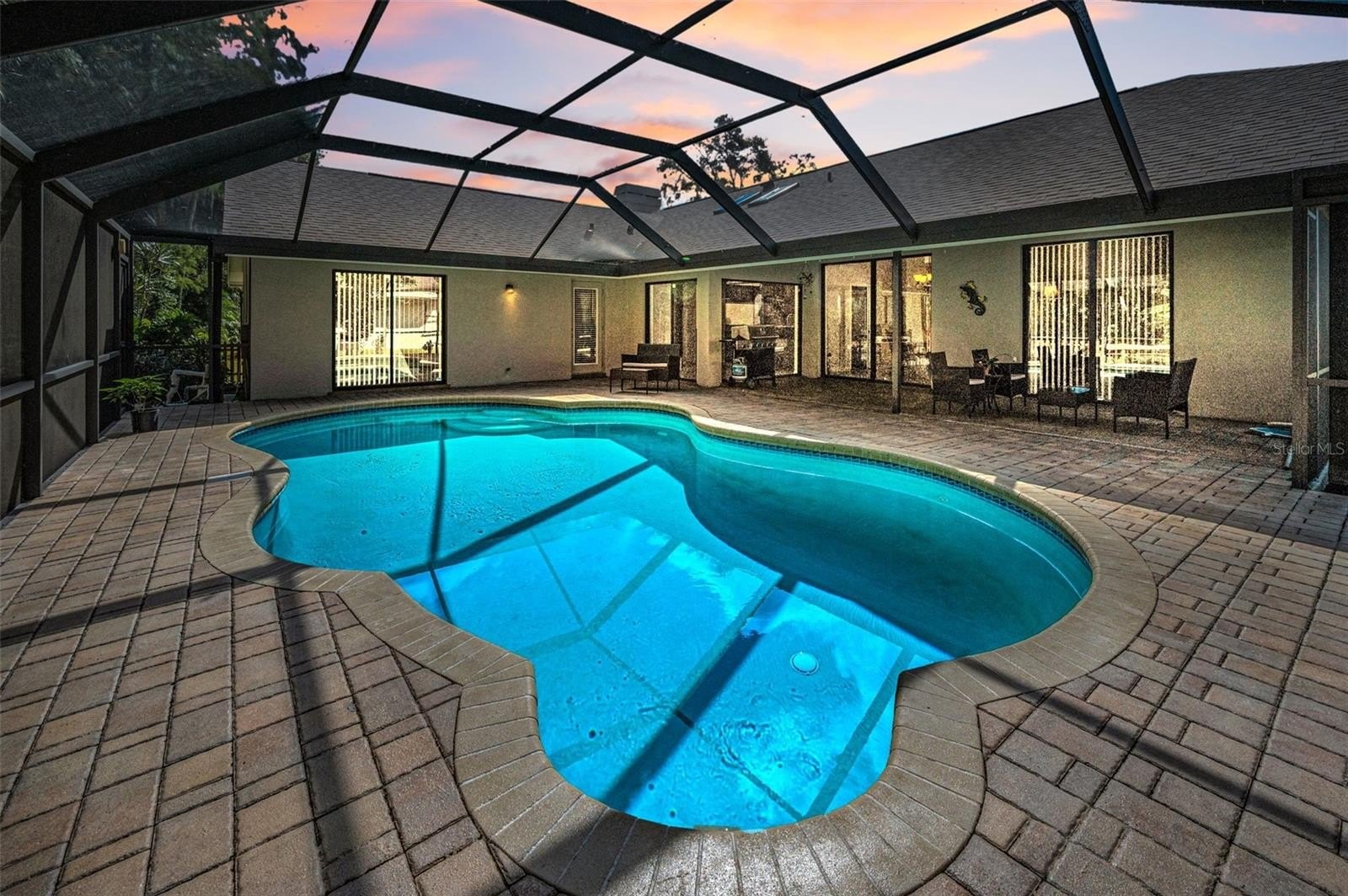 WELCOME TO WOODFIELD LAKESHORE VILLAGE AN EASTLAKE PREMIER COMMUNITY. NESTELED IN A GEM OF A CUL-DE-SAC WITH TOTAL PRIVACY THAT BACKS TO CONSERVATION, THIS POOL HOME HAS GREAT CURB APPEAL WITH 4 BEDROOMS, 2 BATHS, 2CAR GARAGE. ENTER THROUGH A WELCOMING BEVELED GLASS DOOR ENTRY INTO A LARGE FORYER WITH COAT CLOSET. FRENCH DOORS LEADS TO AN OVERSIZED LIVING ROOM WITH CLOSET THAT CAN ALSO BE USED AS OFFIC/DEN. VAULTED CEILINGS IN THE FAMILY ROOM WITH WOOD BURNING FIREPLACE. KITCHEN WITH WARM WOOD CABINETRY THAT OVERLOOKS THE FAMILY ROOM AND DINETTE. NEWER STAINLESS APPLIANCES WITH GRANITE COUNTER TOPS AND BREAKFAST BAR. RELAX IN THE DINETTE WITH MORNING COFFEE TAKING IN VIEWS OF THE POOL AND LANAI. SEPARATE FORMAL DINNING ROOM. PRIMARY BEDROOM HAS WALK-IN CLOSETS, EN SUITE BATH WITH DOUBLE VANITY, GRANTE COUNTER TOPS, WALK-IN SHOWER AND PRIVATE TOILET CLOSET. THREE LARGE GUEST BEDROOMS ARE LOCATED ON THE OPPOSITE SIDE OF THE HOME WITH SECOND BATH WHICH ALSO GIVES CONVENIENT ACCCESS TO THE POOL. INSIDE LAUNDRY ROOM WITH FULL SIZE WASHER/DRYER AND UTILITY SINK FOR EASY CLEAN UPS. THE HOME IS CARPET FREE WITH CERAMIC TILE AND LAMINATE FLOORING THROUGHOUT. GLASS SLIDERS GIVE EASY ACCESS FROM THE PRIMARY BEDROOM, DINNING ROOM AND KITCHEN TO THE EXTRA LARGE COVERED AND SCREENED LANAI WHICH GIVES AMPLE SPACE TO RELAX POOLSIDE. FENCED OPEN AIR PATIO SITS AT THE FOOT OF THE CONSERVATION AREA. ADDITIONAL FEATURES OF THE HOME ARE RESCREENED BIRDCAGE 2024, WATER HEATER, WATER SOFTENER, ROOF AND SKYLIGHTS REPLACED 2023. THE A/C IS 5 YRS OLD. CLOSE TO BOTH TAMPA INTERNATIONAL & ST. PETE/CLEARWATER AIRPORTS, TARPON SPRINGS BEACHES, SHOPPING AND ZONED WITH TOP RATED SCHOOLS. THIS HOUSE IS A MOST SEE!