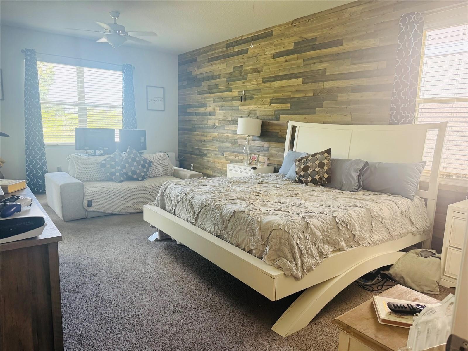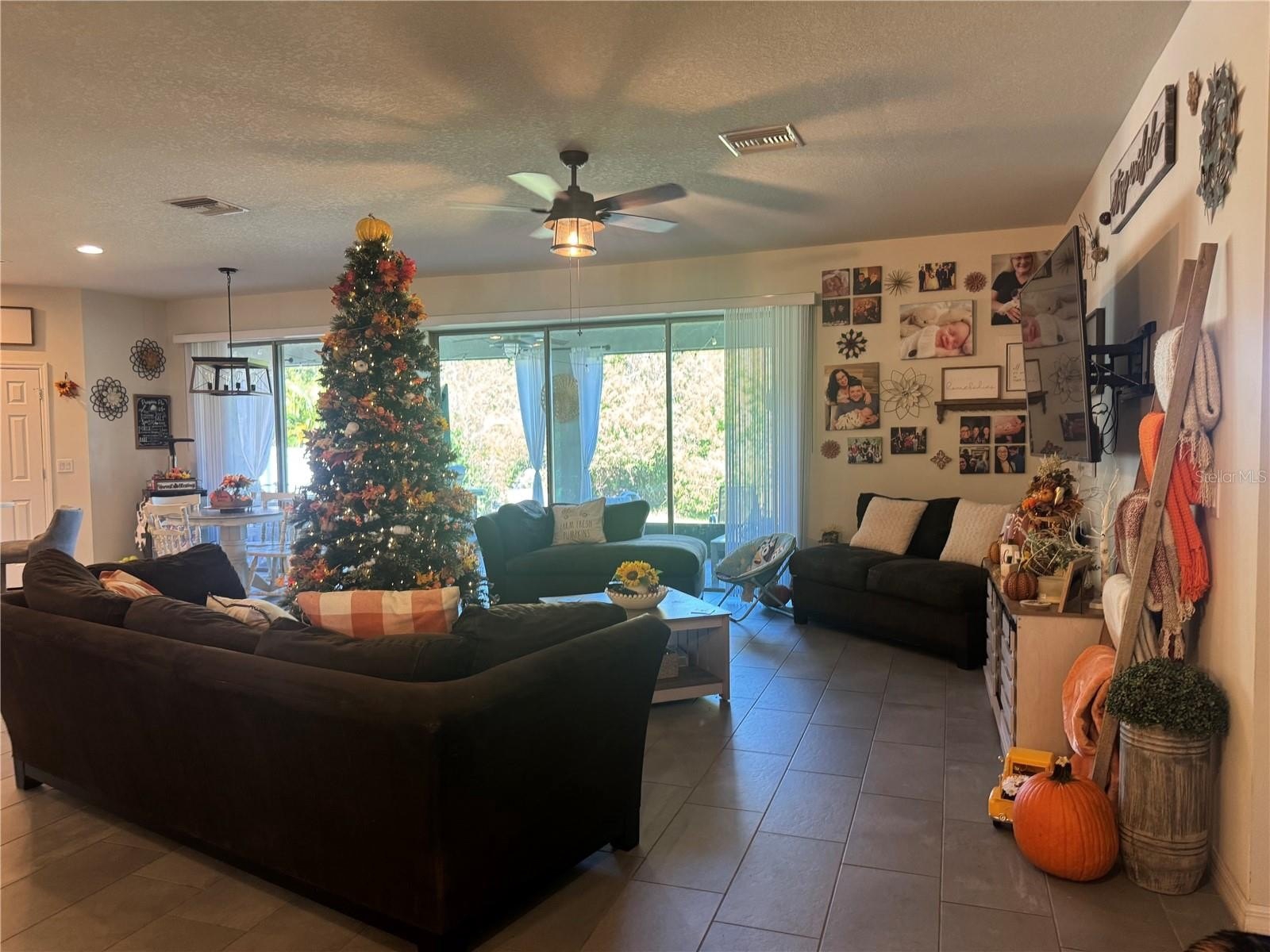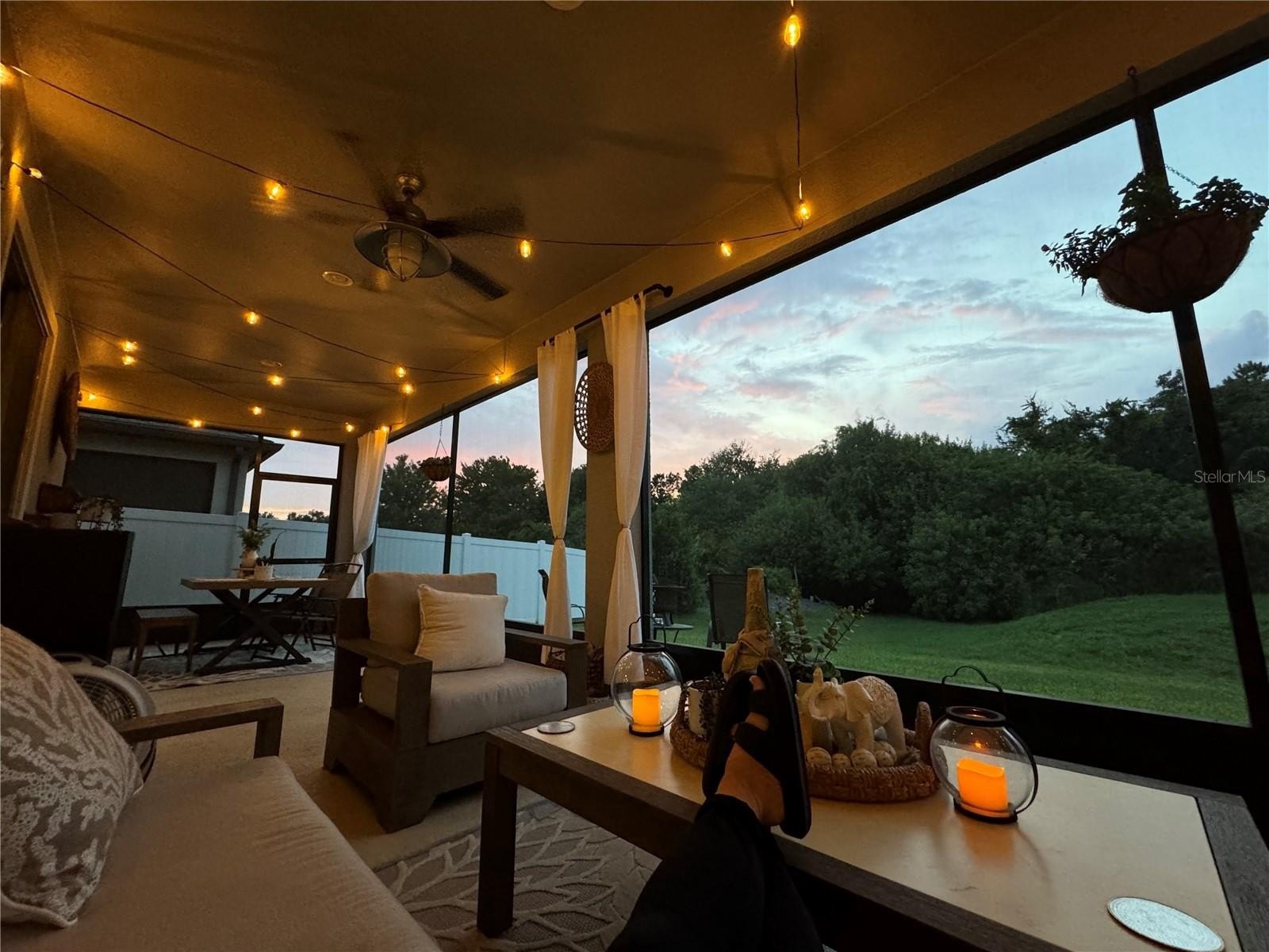 In the heart of South Fork III, this beautifully maintained 2018 home offers the perfect blend of space, warmth, and modern comfort. With 3 bedrooms, 2.5 baths, and a flexible bonus room, it is designed for both relaxation and everyday living. The open floor plan flows through tile-lined spaces into a bright living area where a three-panel pocket sliding door opens fully to an extended screened lanai. Evening light fills the home as sunsets paint the sky, creating a calm and inviting atmosphere.