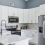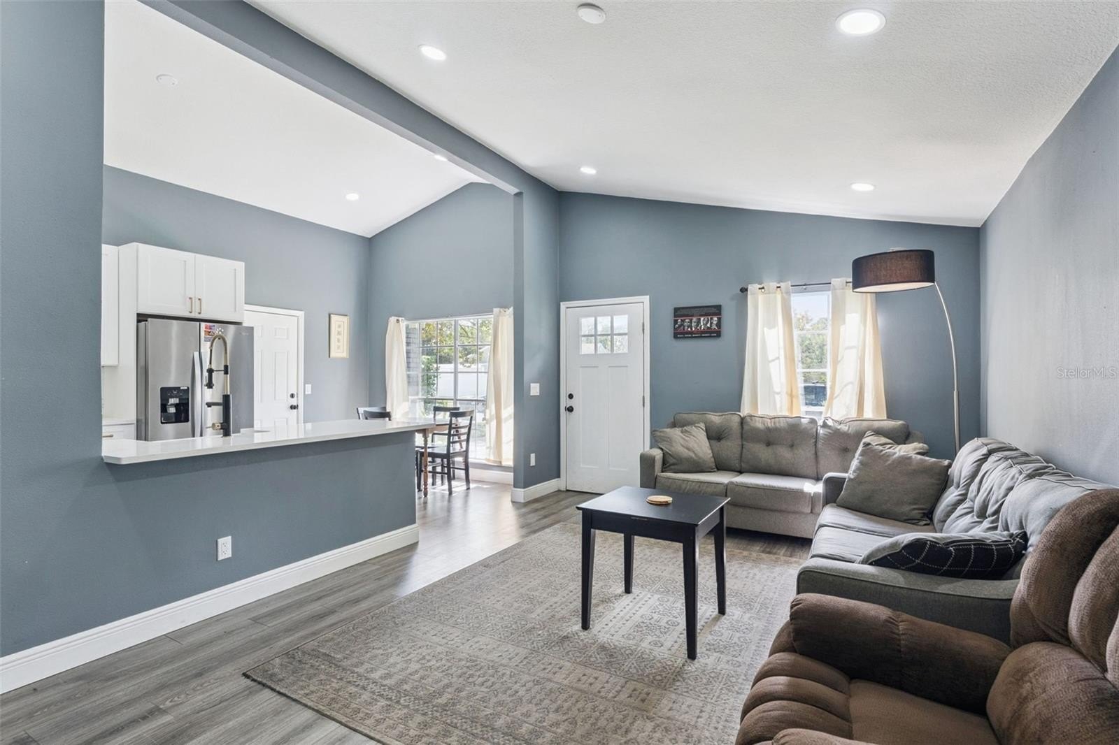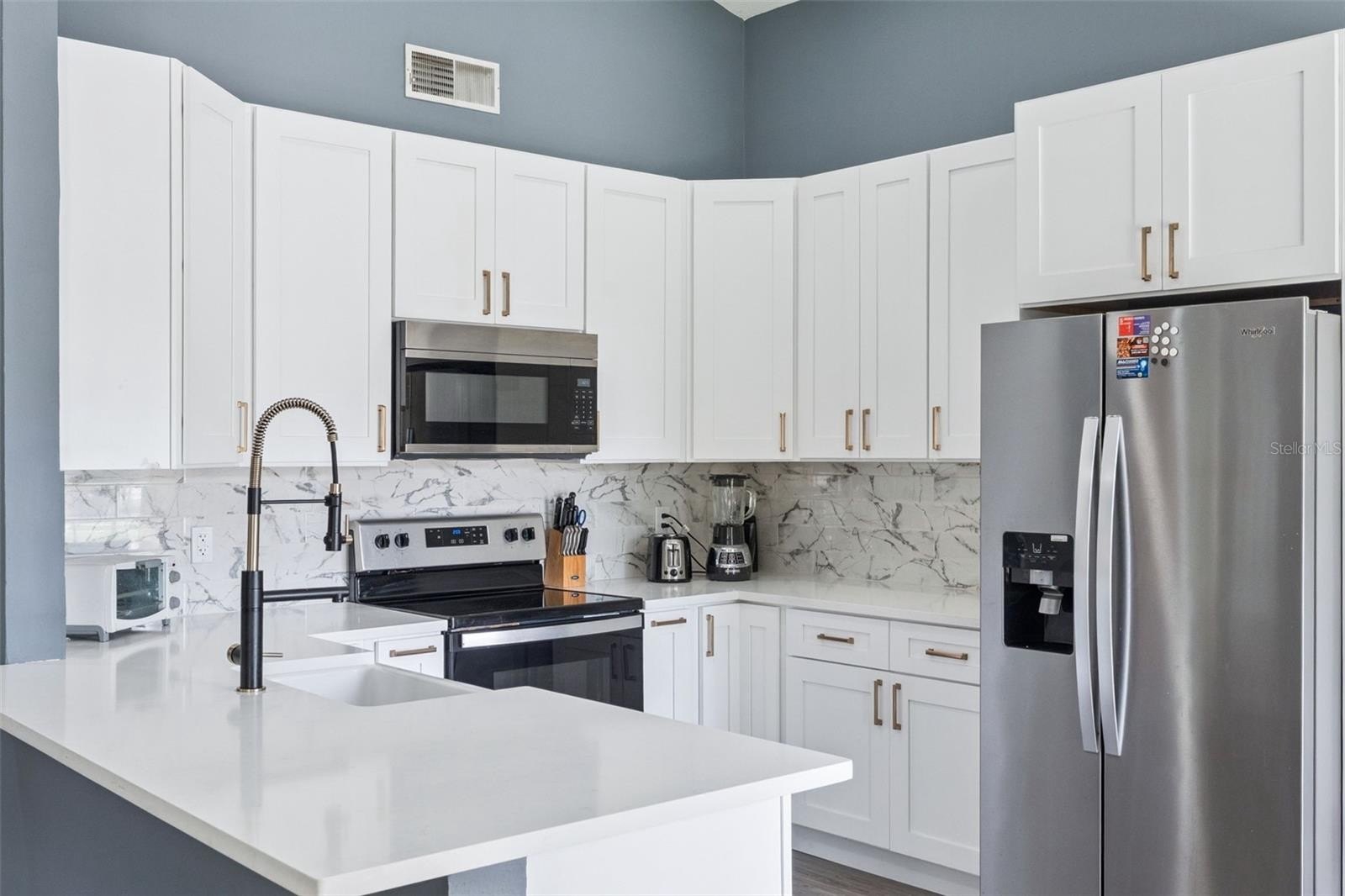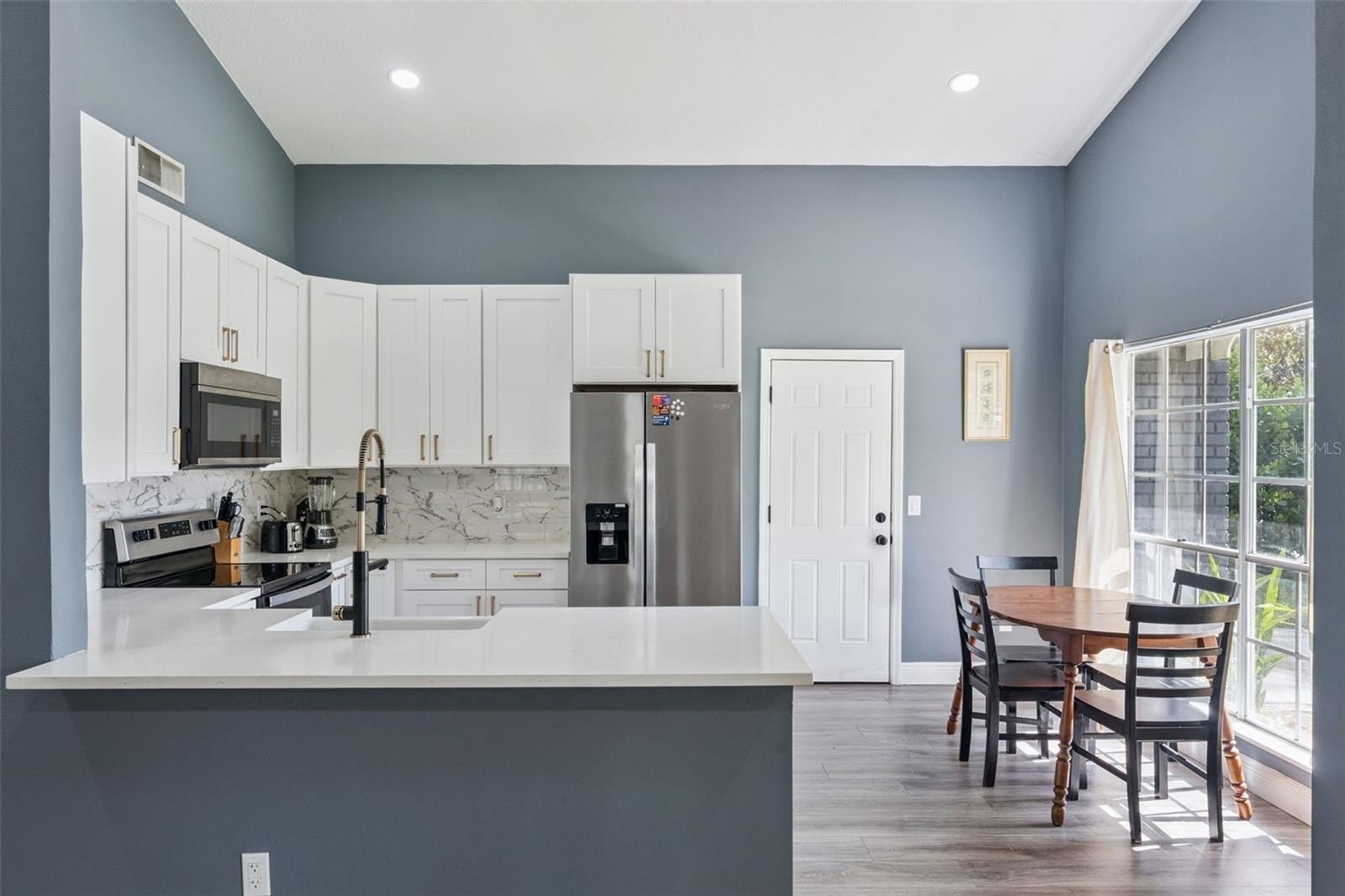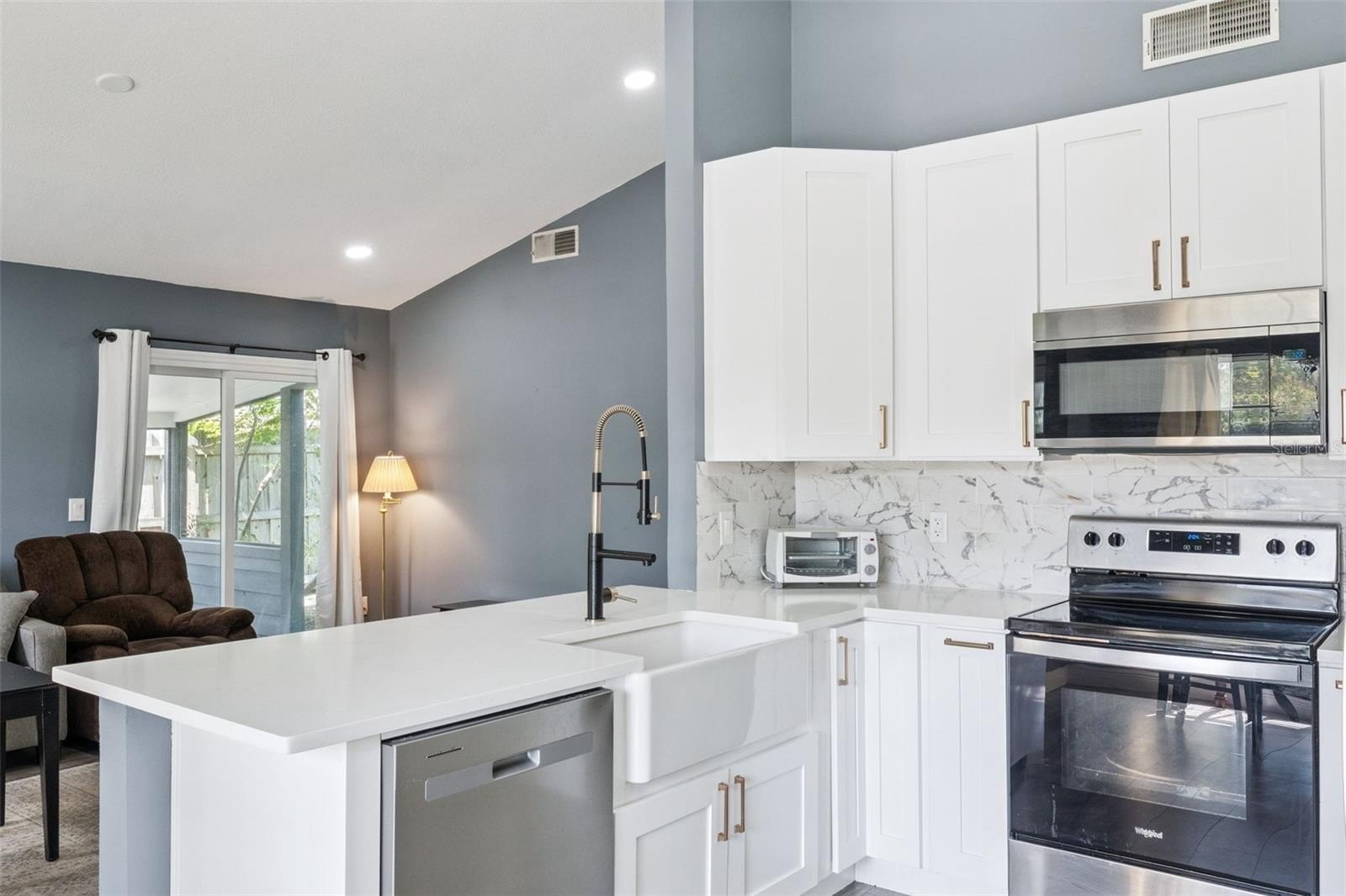 As you enter, the bright and inviting kitchen stands out with newer stainless steel appliances, quartz countertops, and champagne hardware. White shaker cabinets with soft-close drawers provide generous storage, while LED recessed lighting adds warmth and ambiance.