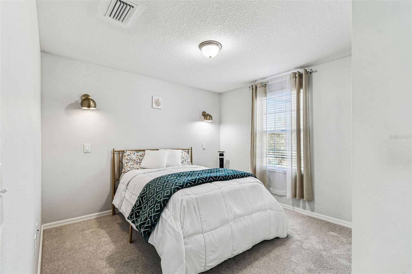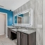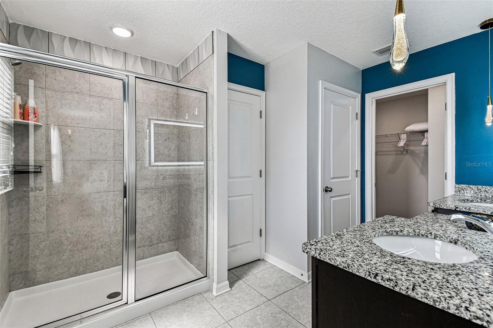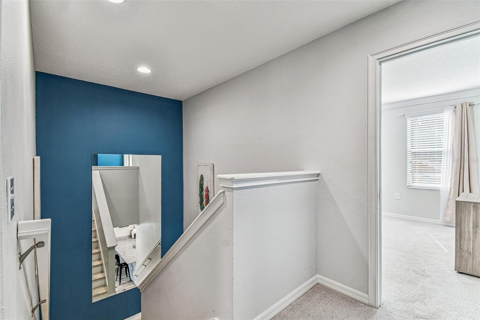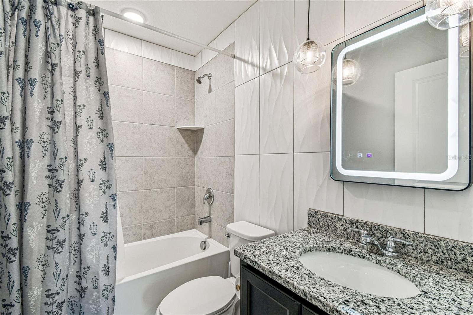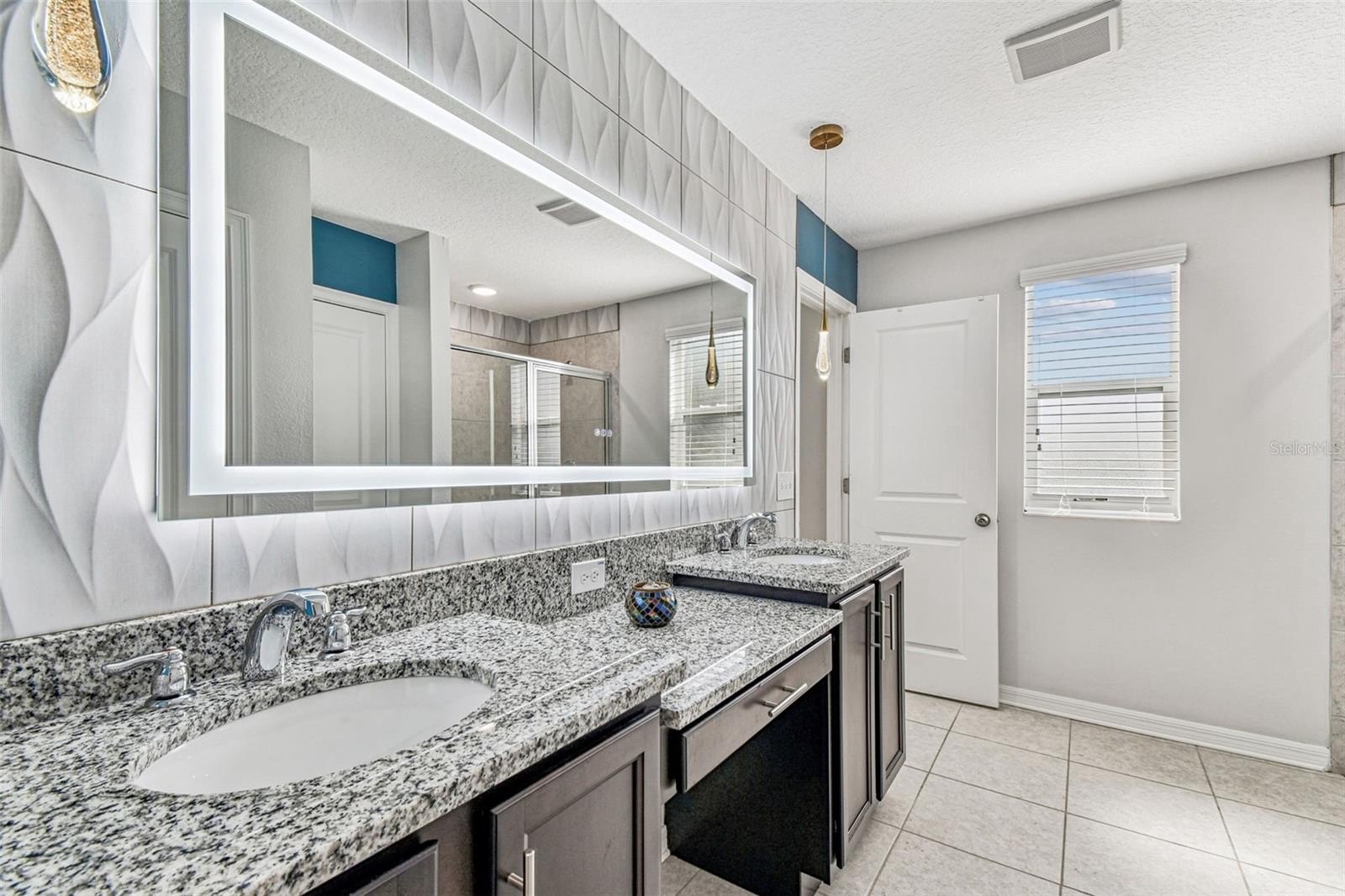 All bathrooms have been UPGRADED with new 3D tile, upgraded LED mirrors, and DESIGNER PENDANT LIGHTING. The staircase has been enhanced with a 15-foot decorative mirror and CUSTOM-BUILT SOLID RED OAK WOOD, replacing the original carpet.