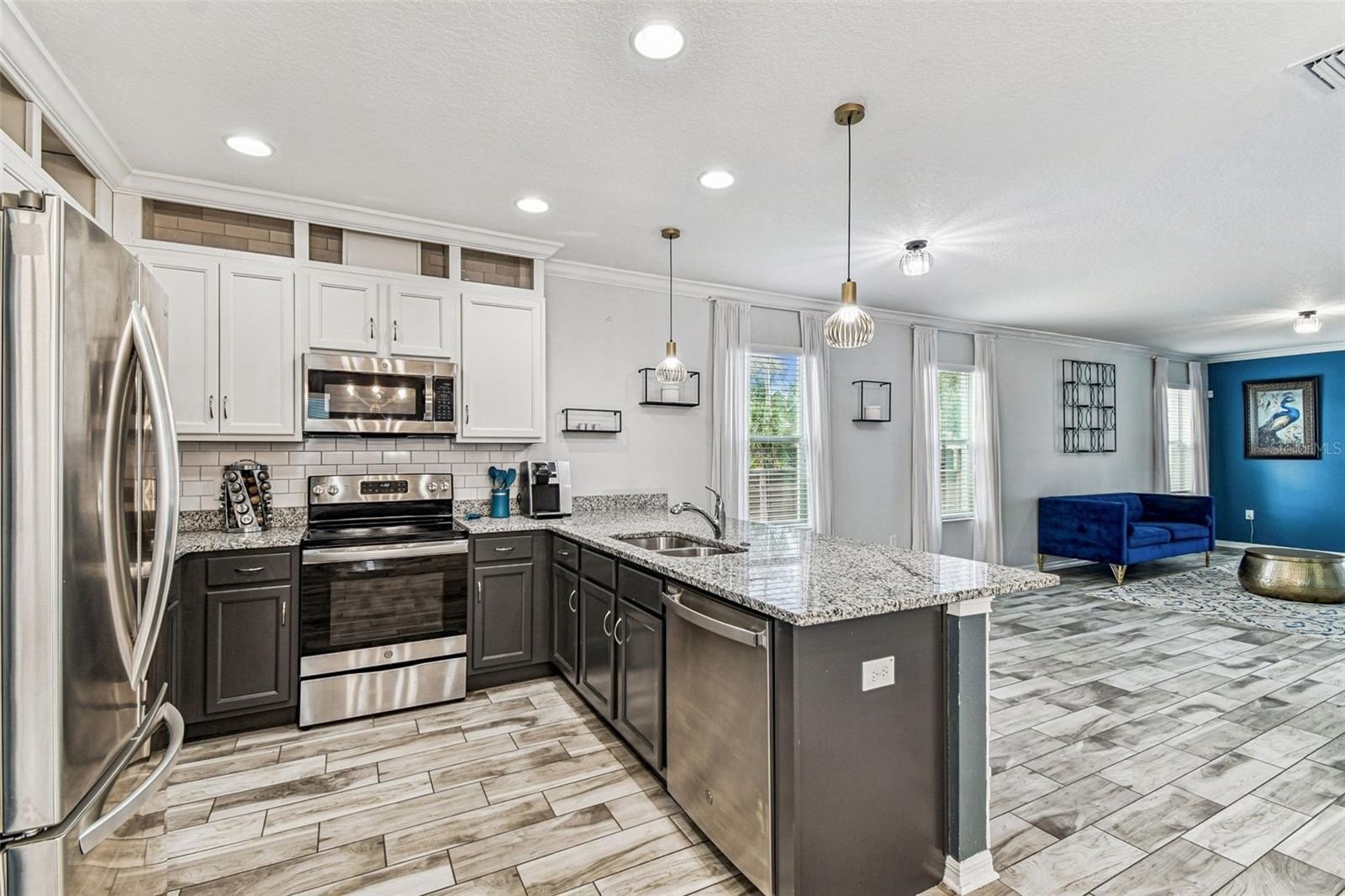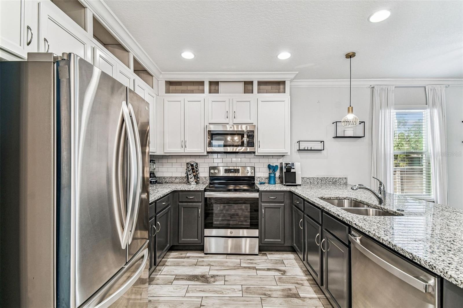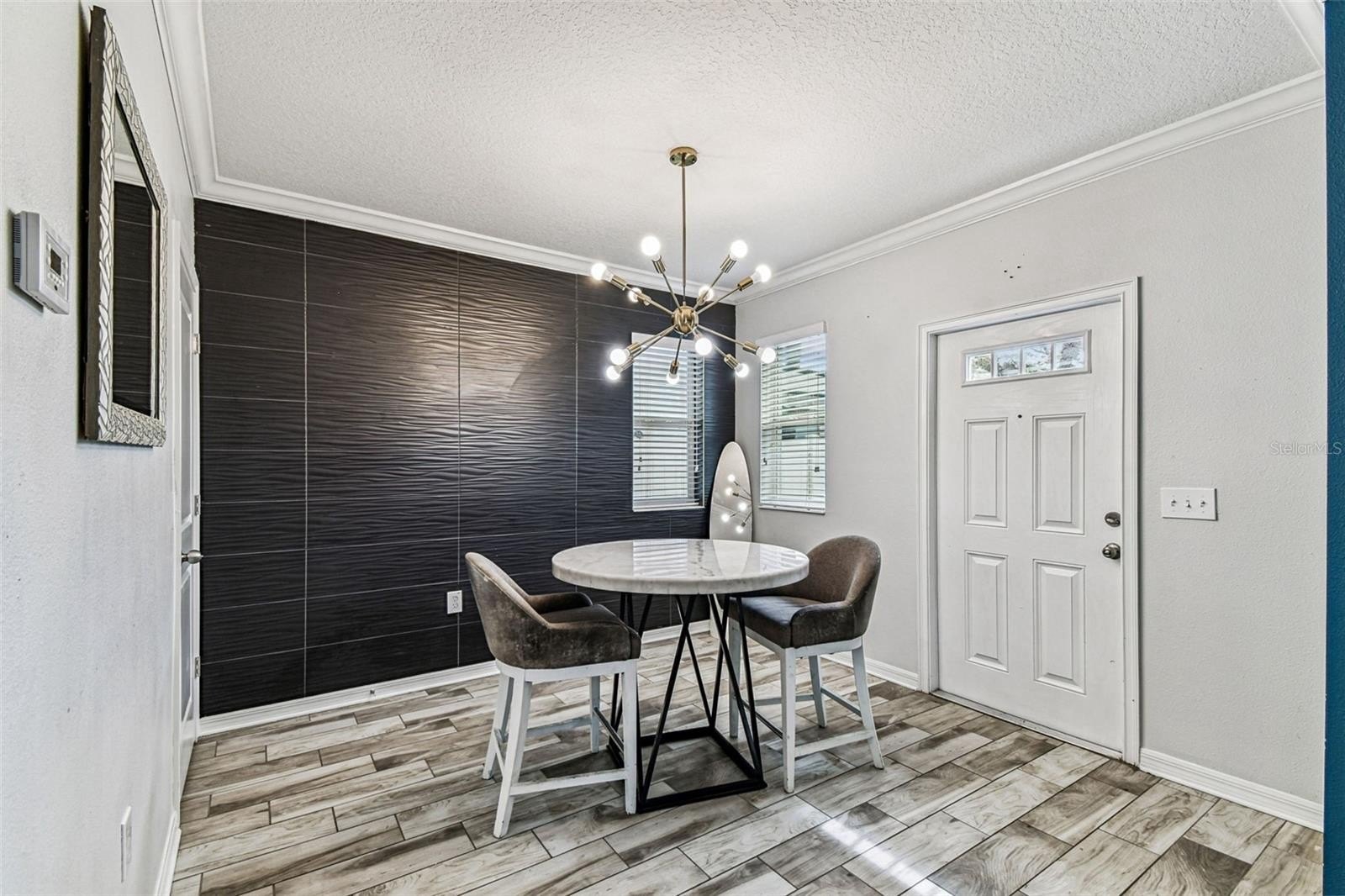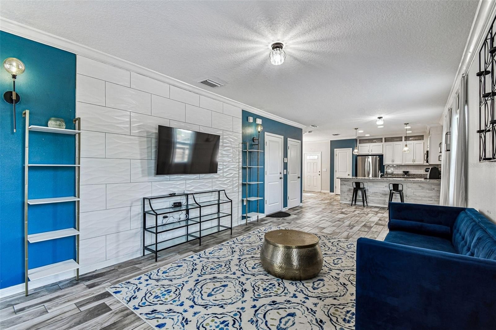 Recent upgrades include CROWN MOLDING throughout the first floor and primary suite, CUSTOM BUILT KITCHEN CABINETS with a coordinating backsplash, and built-in storage cabinetry for added functionality. The living and dining rooms feature decorative 3D porcelain ACCENT WALLS, while the kitchen includes added pendant lighting and UPGRADED WIRING.