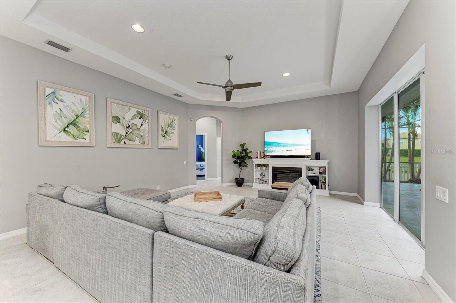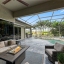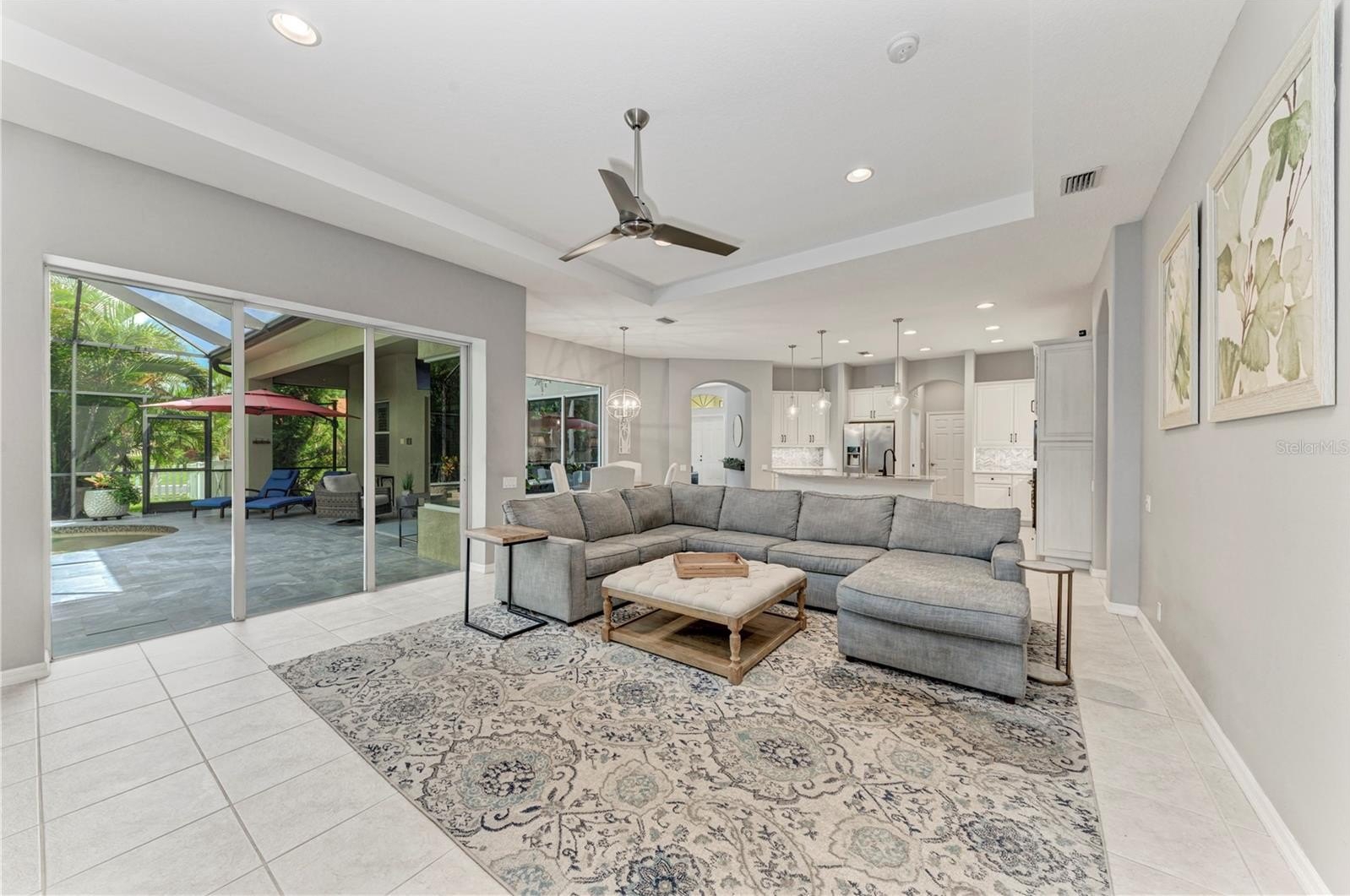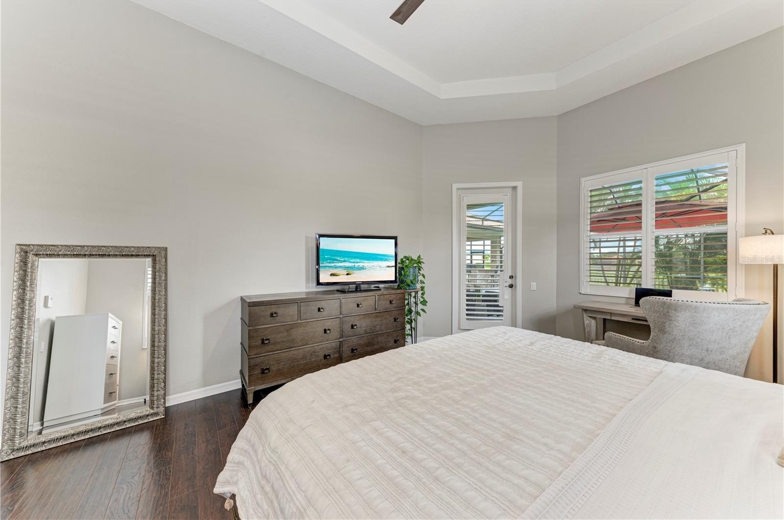 The expansive primary suite feels like a private retreat with pool access, a gorgeous en-suite bath featuring custom vanities, a frameless shower with hand-held and rain fixtures, travertine flooring, and dual sinks with granite counters and LED lighting. The split floor plan provides privacy, with three additional spacious bedrooms located on the opposite side of the home—ideal for family or guests.