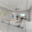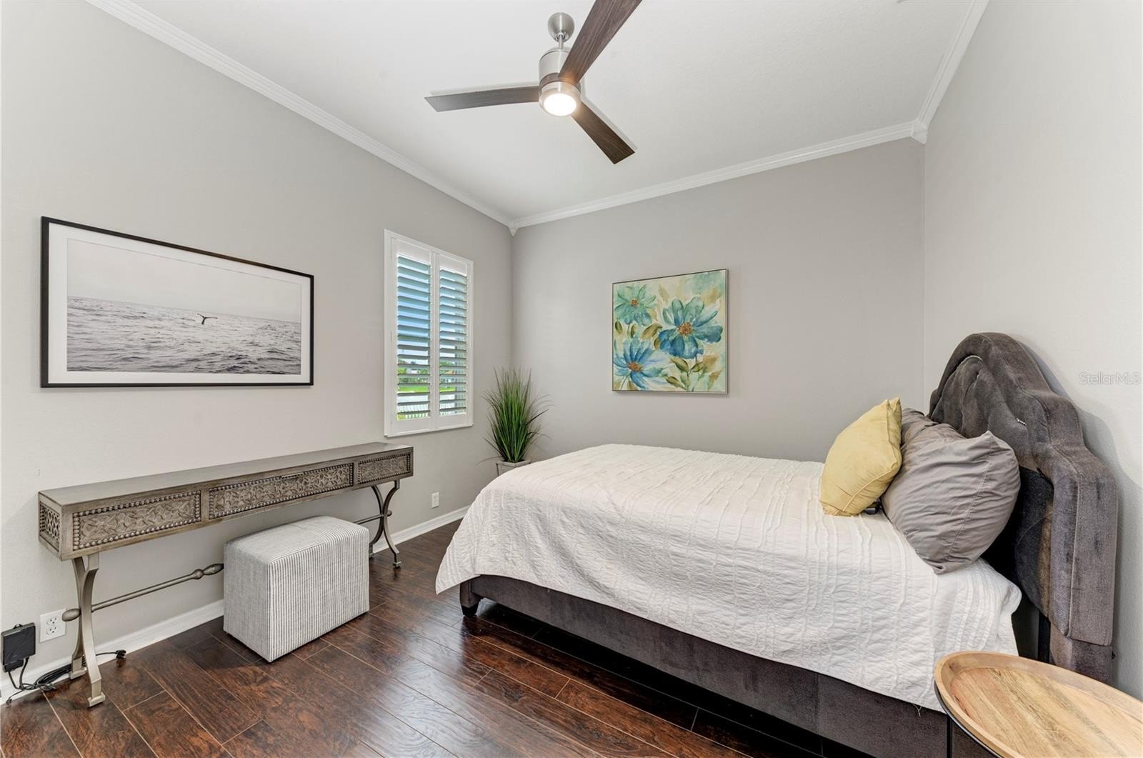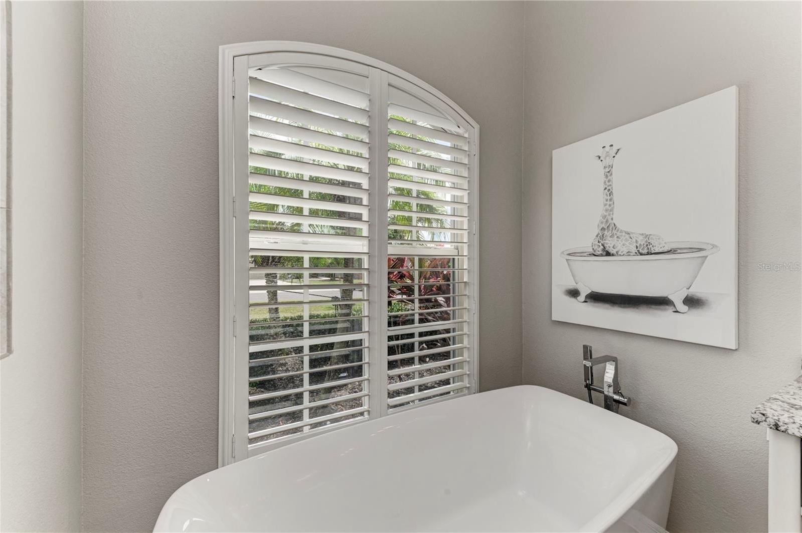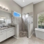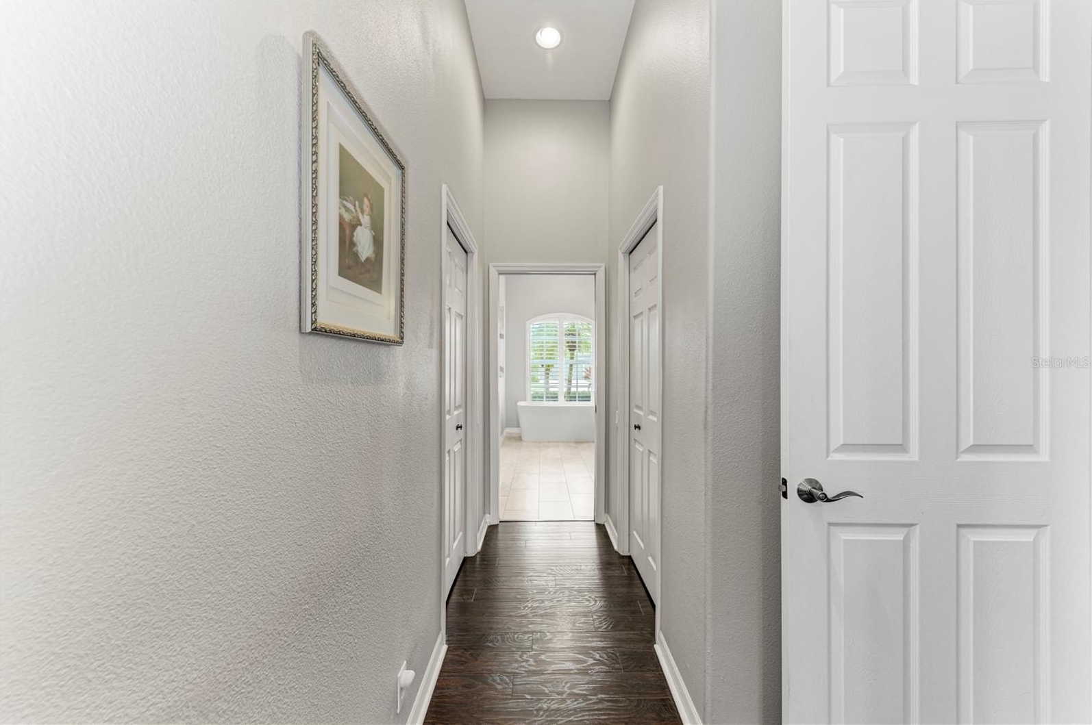 The expansive primary suite feels like a private retreat with pool access, a gorgeous en-suite bath featuring custom vanities, a frameless shower with hand-held and rain fixtures, travertine flooring, and dual sinks with granite counters and LED lighting. The split floor plan provides privacy, with three additional spacious bedrooms located on the opposite side of the home—ideal for family or guests.