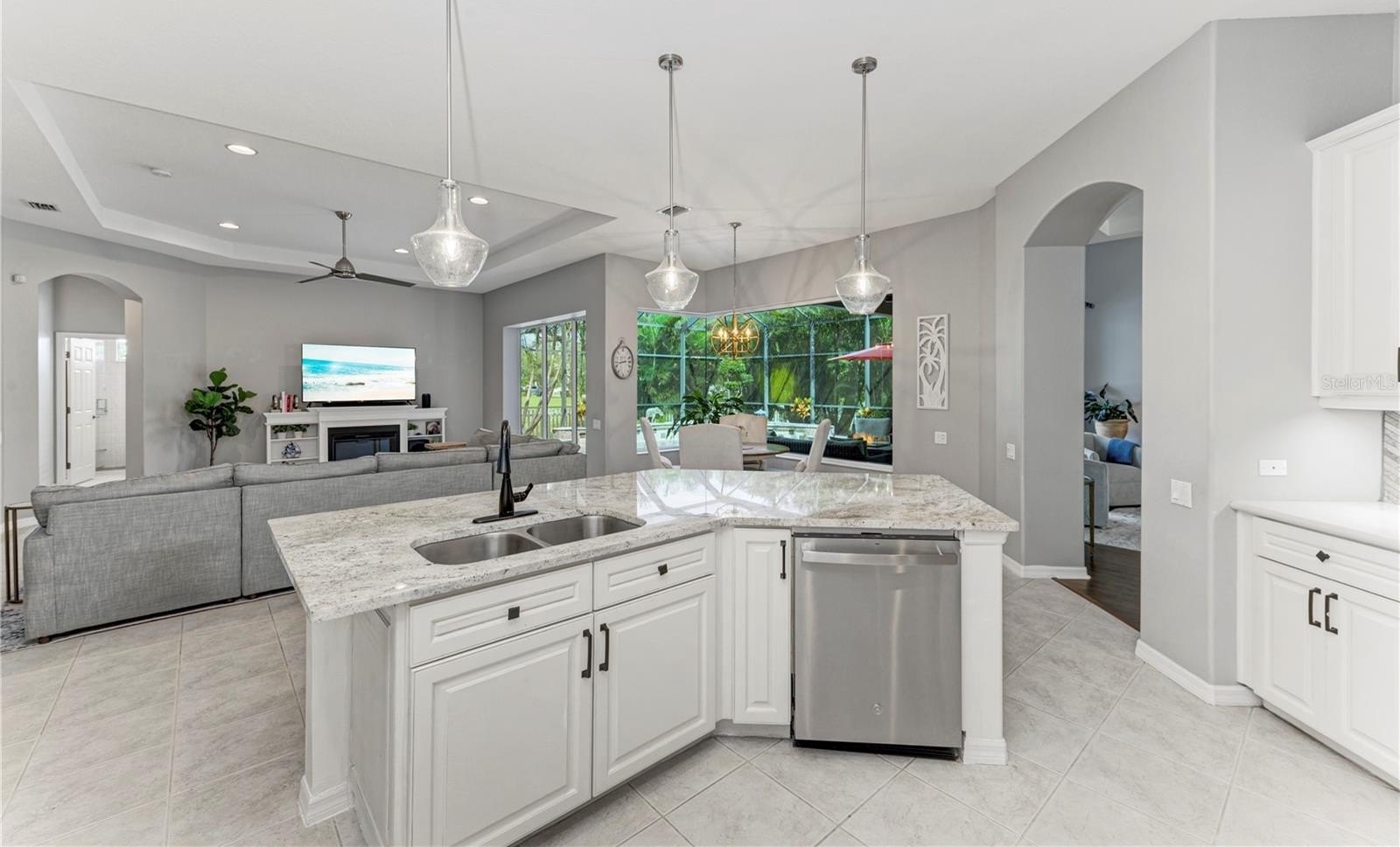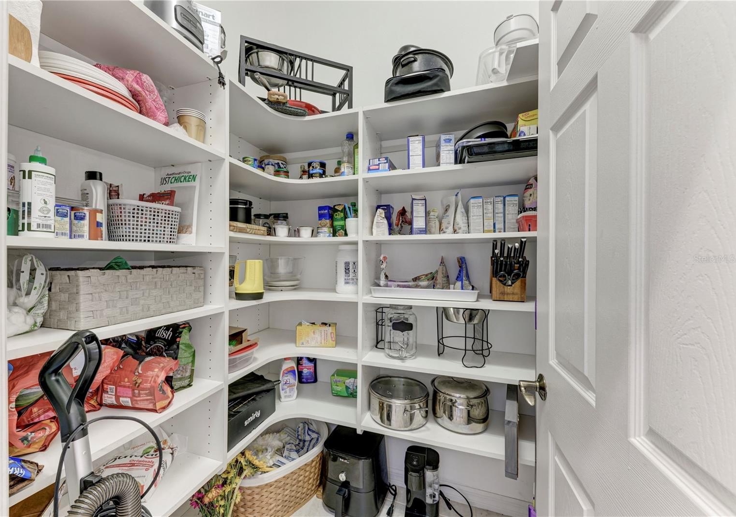 The elevated kitchen is a showstopper with stainless steel appliances, double oven, gas range, oversized island with sink, and a dishwasher tucked conveniently out of view. A walk-in pantry with wood shelving and a generous laundry room with custom cabinetry, granite folding station, ironing area, and laundry sink add both function and style. The spotless three-car garage includes a tankless water heater, water softener, two storage racks, and a Generac generator.
