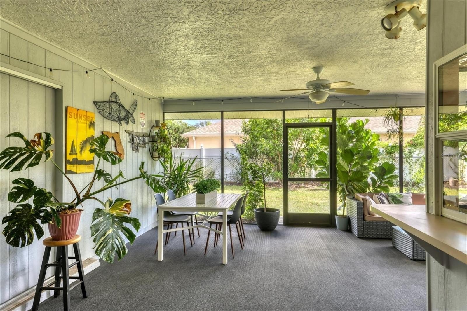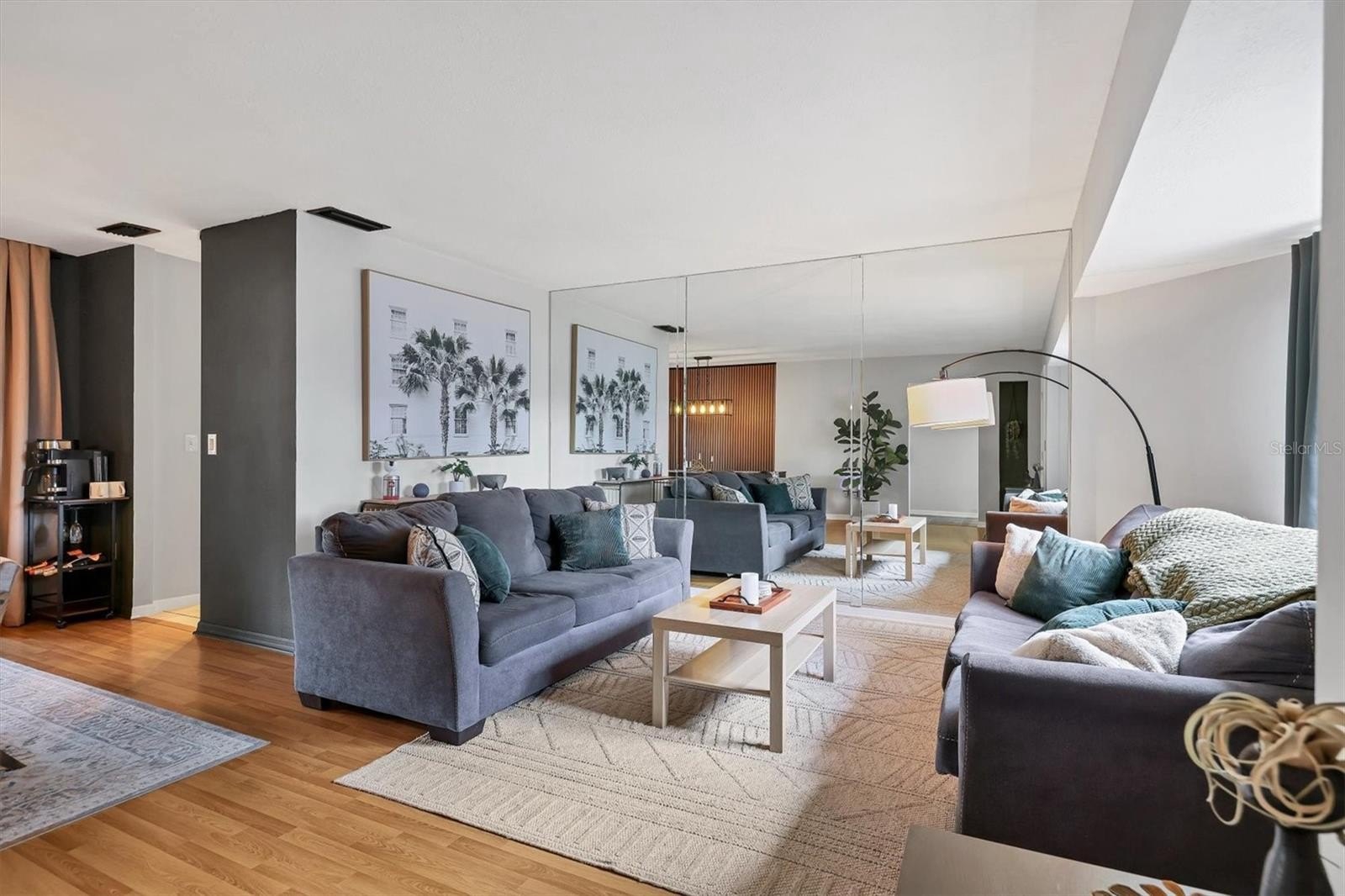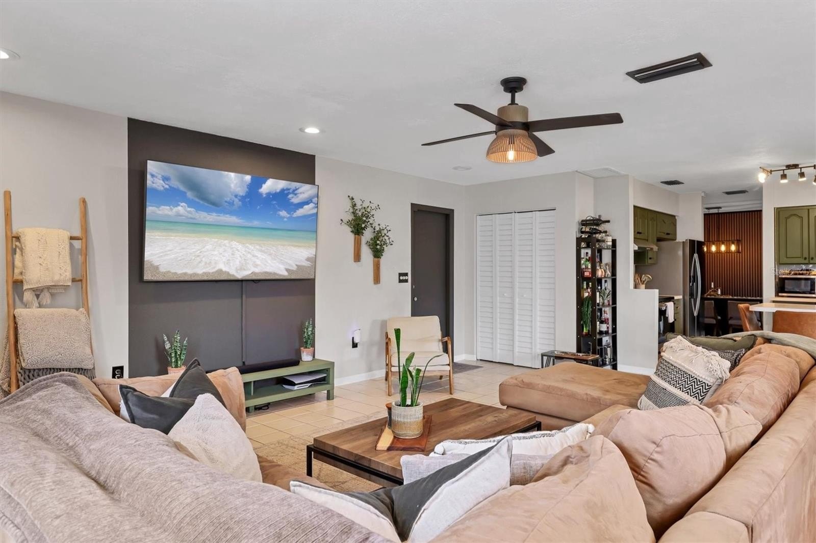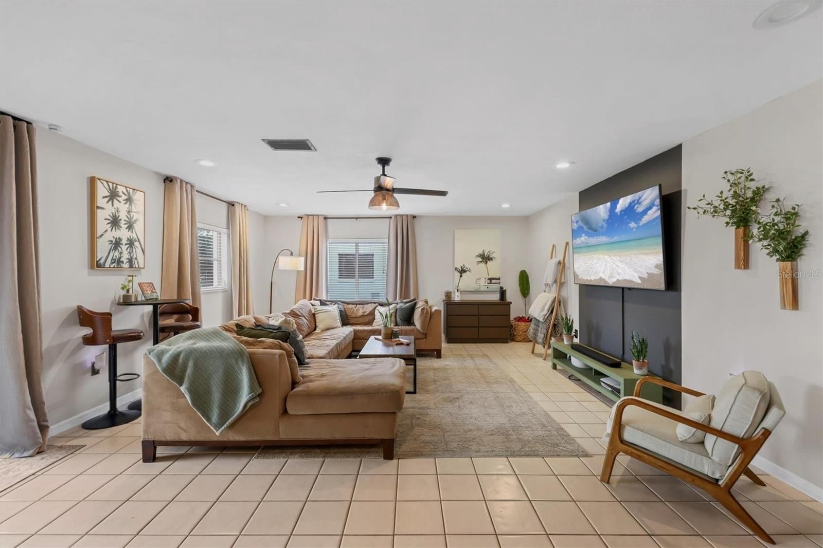 From the moment you step through the door, you’ll notice the meticulous care and attention this home has received. The inviting living and dining areas feature continuous laminate flooring and a stylish modern boho-inspired accent wall. The open great room design includes pocket sliding glass doors that lead to the lanai, seamlessly blending indoor and outdoor living.
