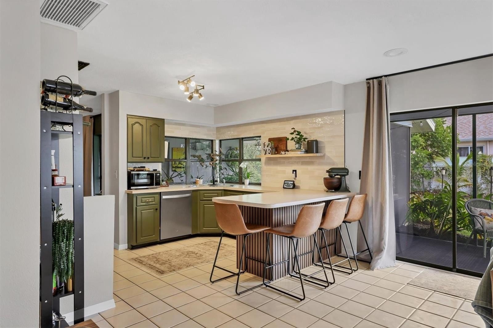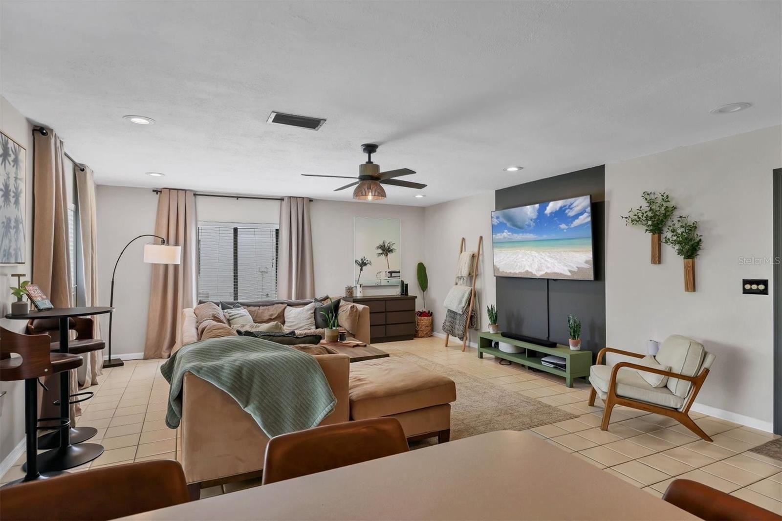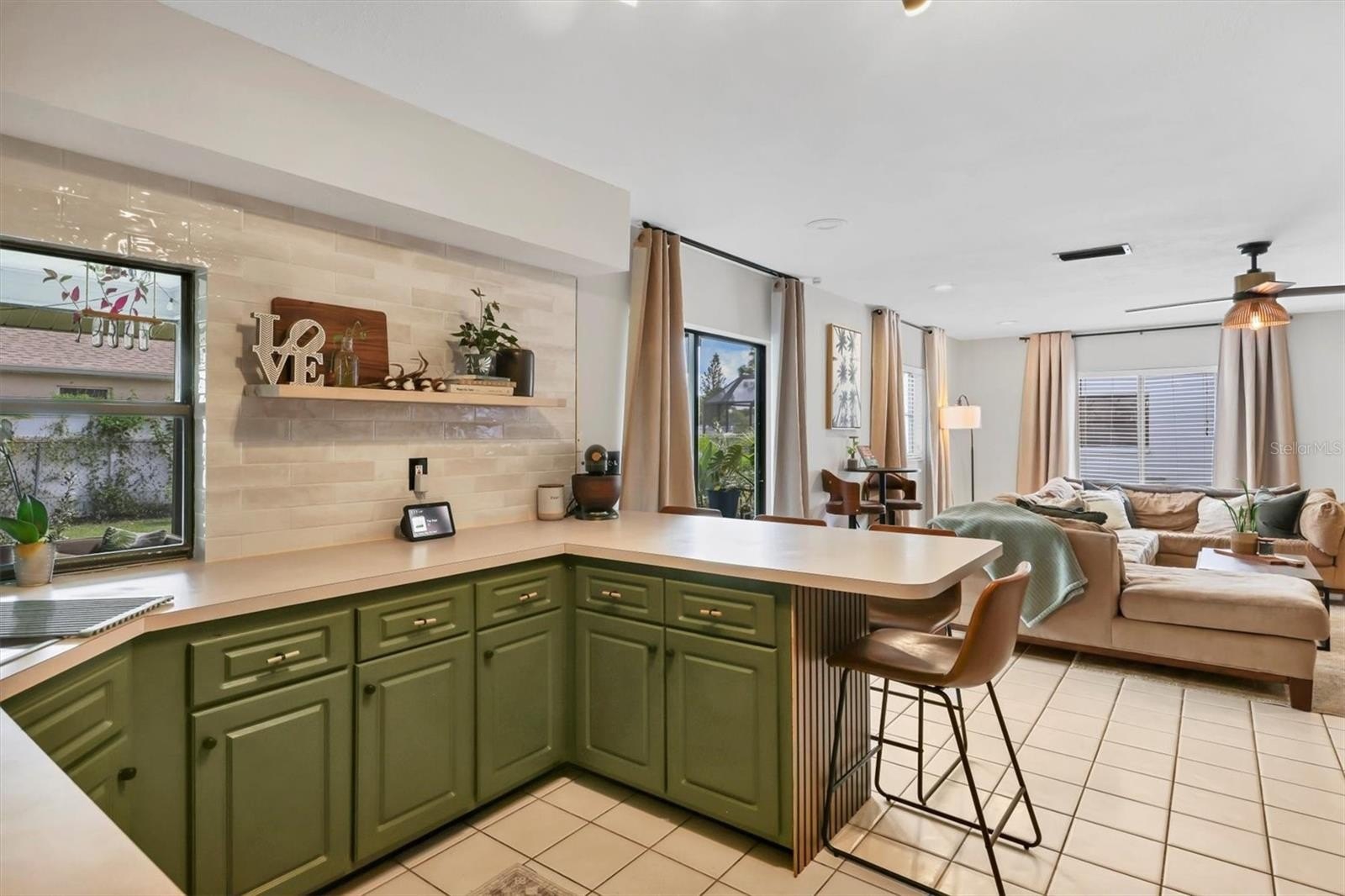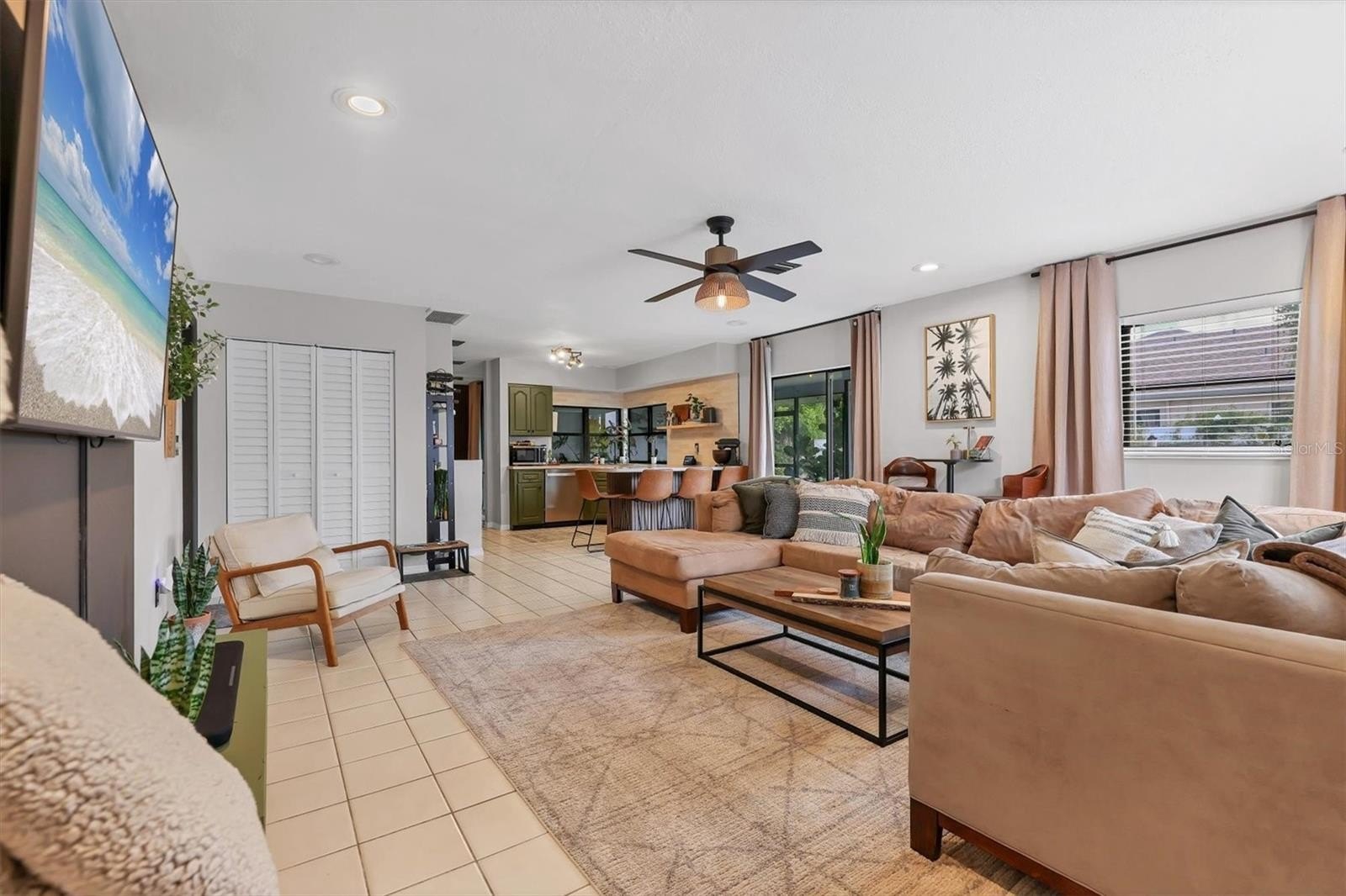 The kitchen and family room create a spacious open-concept layout—perfect for entertaining. The kitchen showcases newer cabinets, a subway tile backsplash, laminate countertops, updated lighting and fixtures, and newer appliances. The family room features recessed lighting, tile flooring, and pocket sliding glass doors that open to a beautiful enclosed, screened lanai overlooking a lush, fenced backyard with mature landscaping.