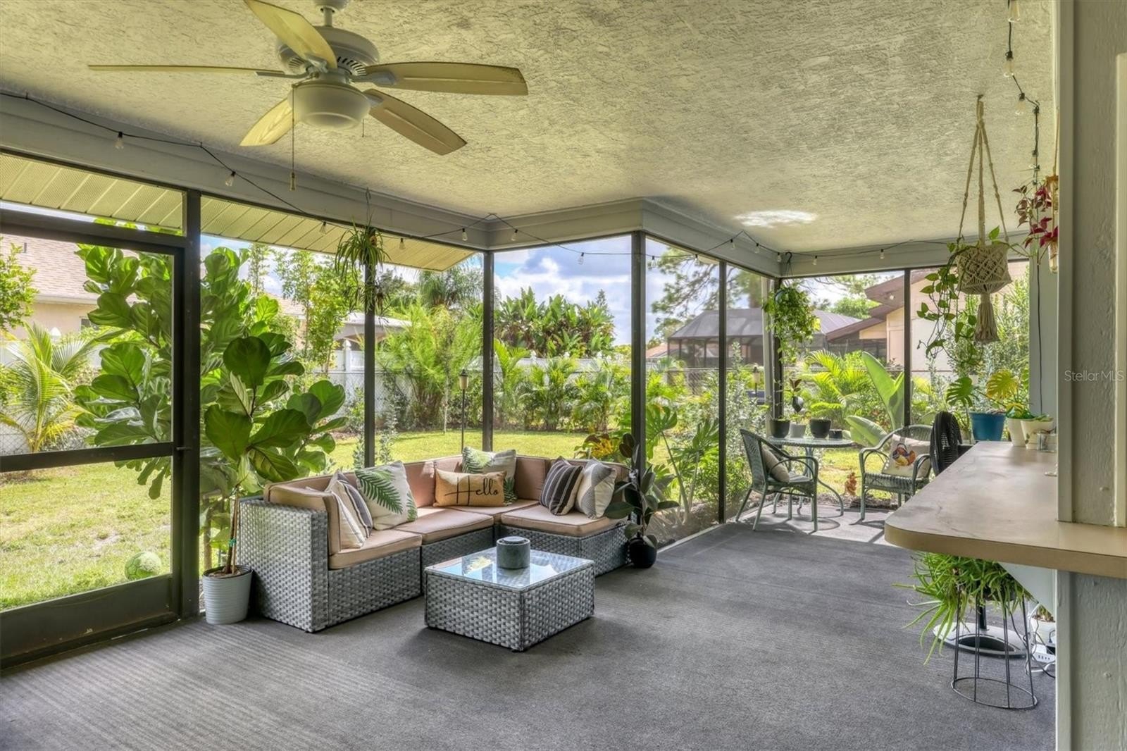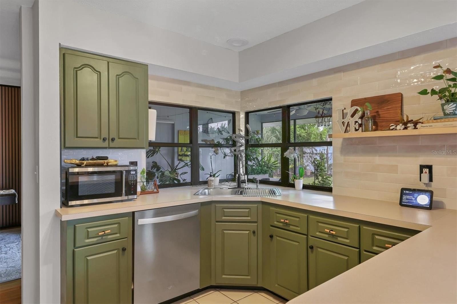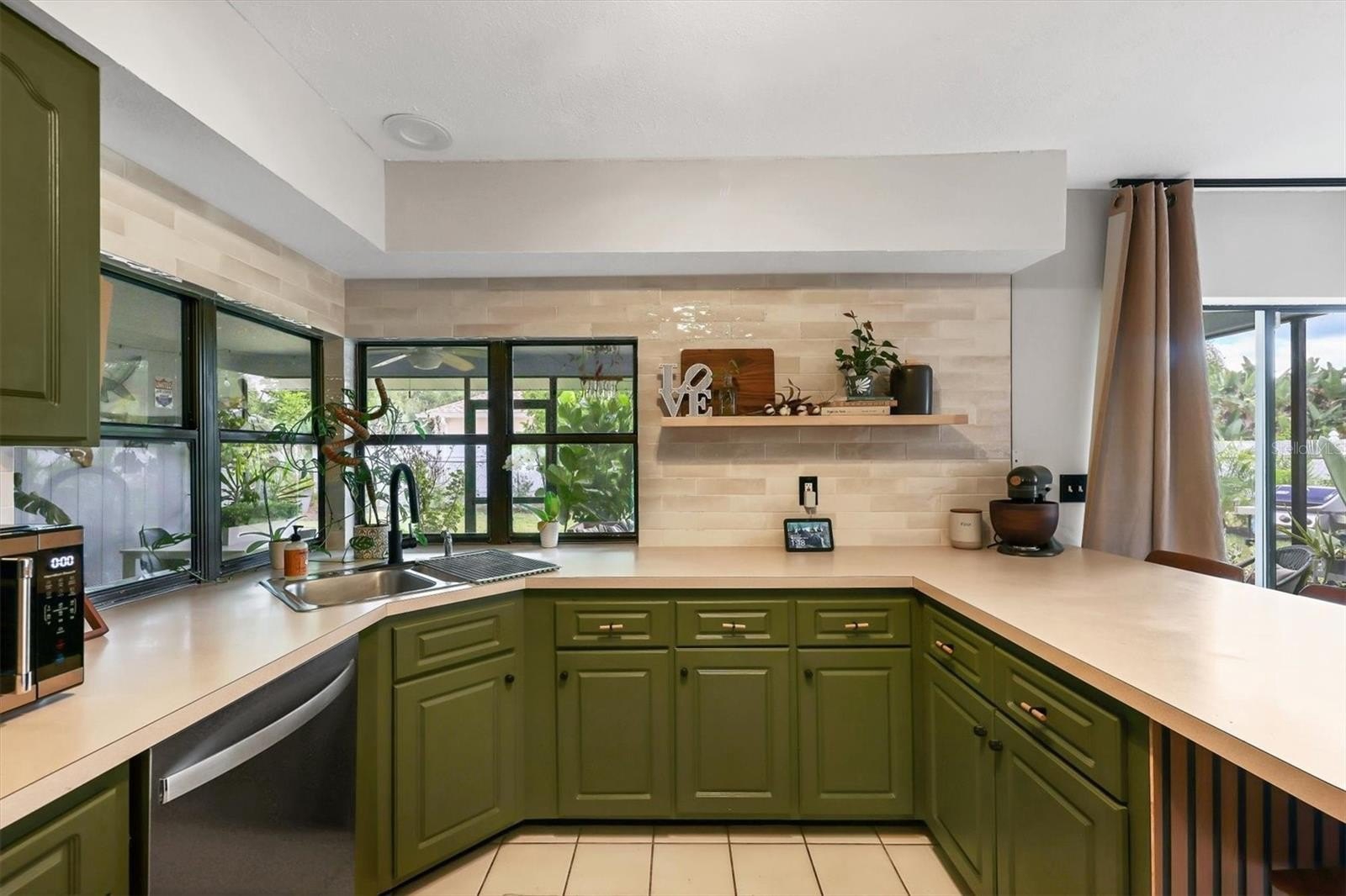 The kitchen and family room create a spacious open-concept layout—perfect for entertaining. The kitchen showcases newer cabinets, a subway tile backsplash, laminate countertops, updated lighting and fixtures, and newer appliances. The family room features recessed lighting, tile flooring, and pocket sliding glass doors that open to a beautiful enclosed, screened lanai overlooking a lush, fenced backyard with mature landscaping.
