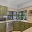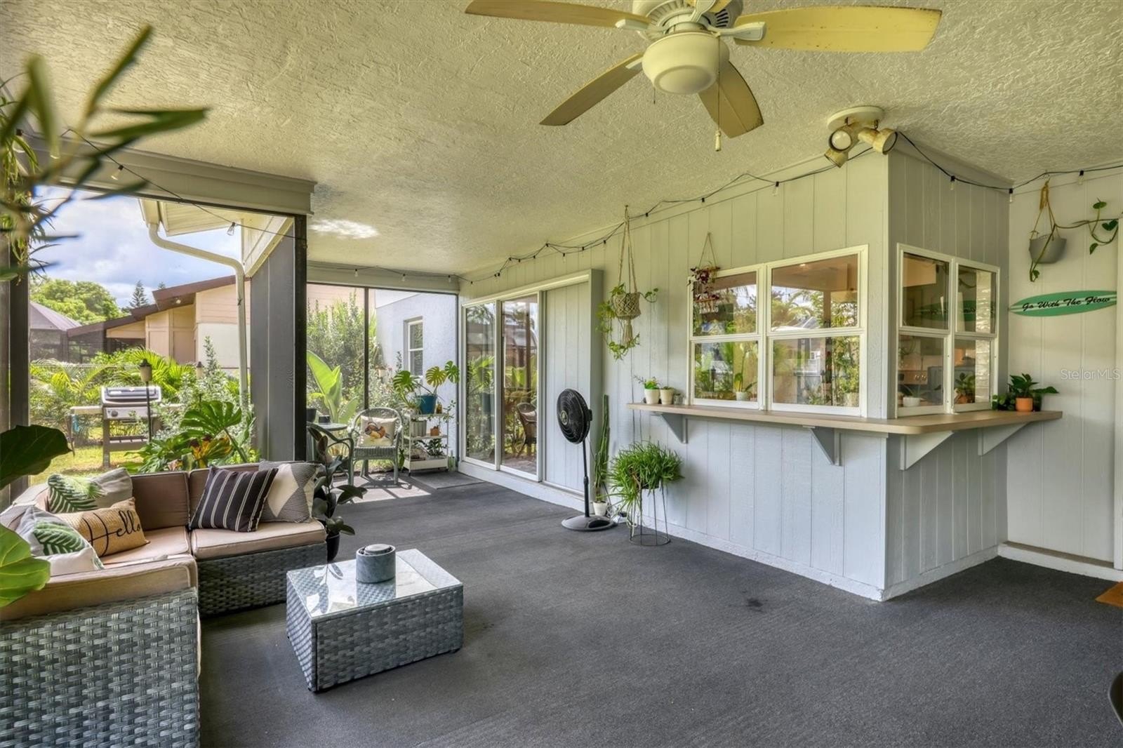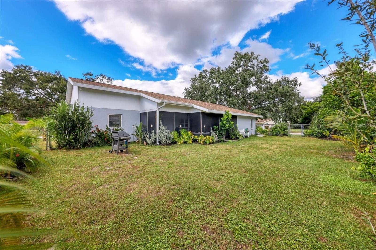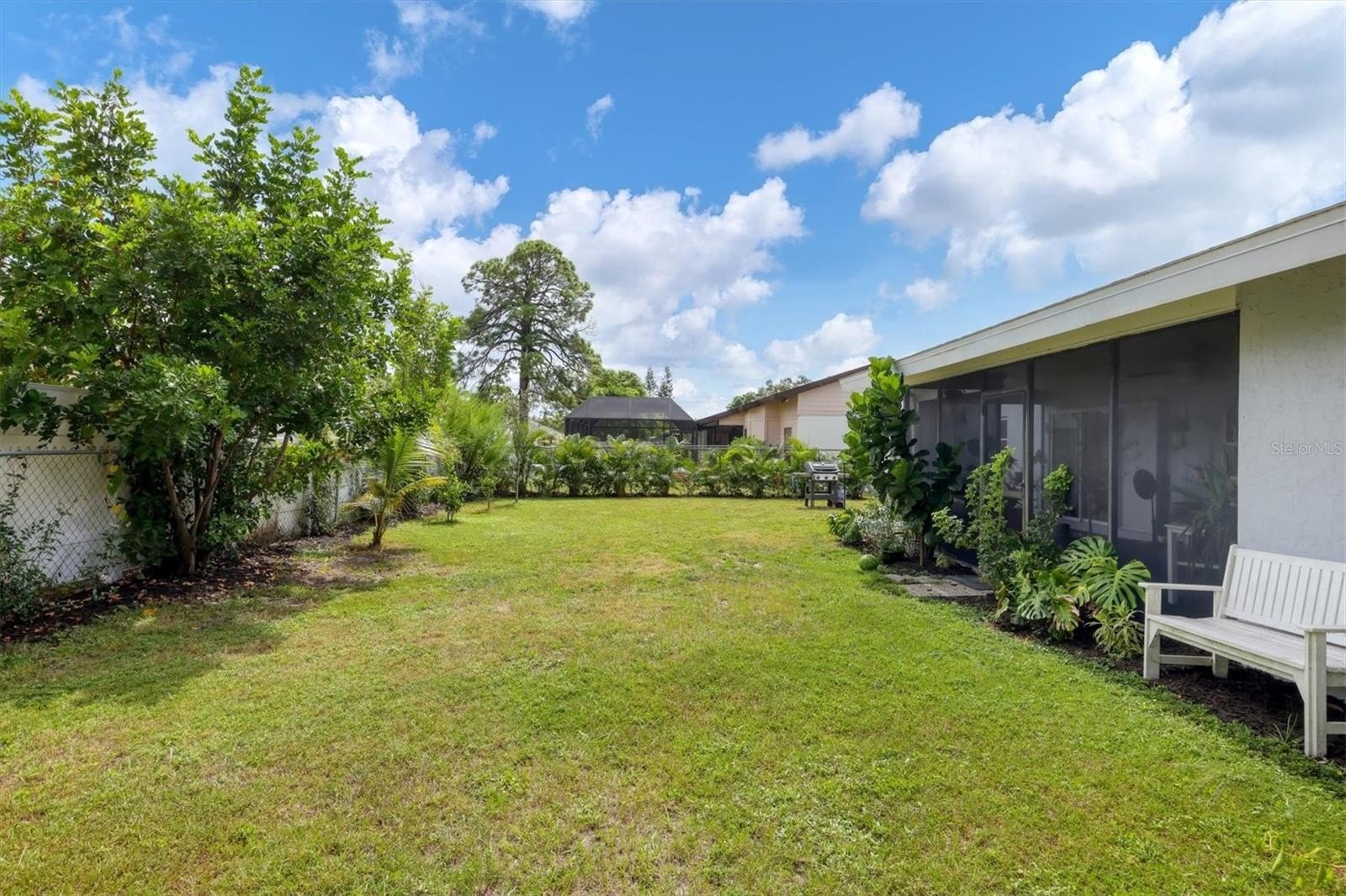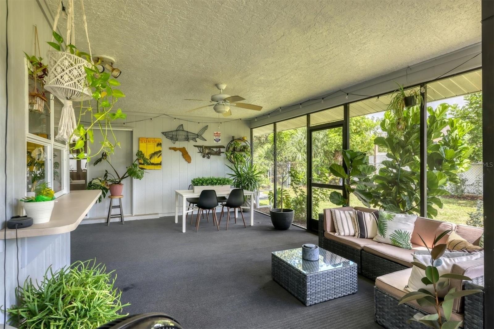 The kitchen and family room create a spacious open-concept layout—perfect for entertaining. The kitchen showcases newer cabinets, a subway tile backsplash, laminate countertops, updated lighting and fixtures, and newer appliances. The family room features recessed lighting, tile flooring, and pocket sliding glass doors that open to a beautiful enclosed, screened lanai overlooking a lush, fenced backyard with mature landscaping.