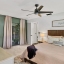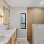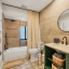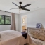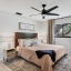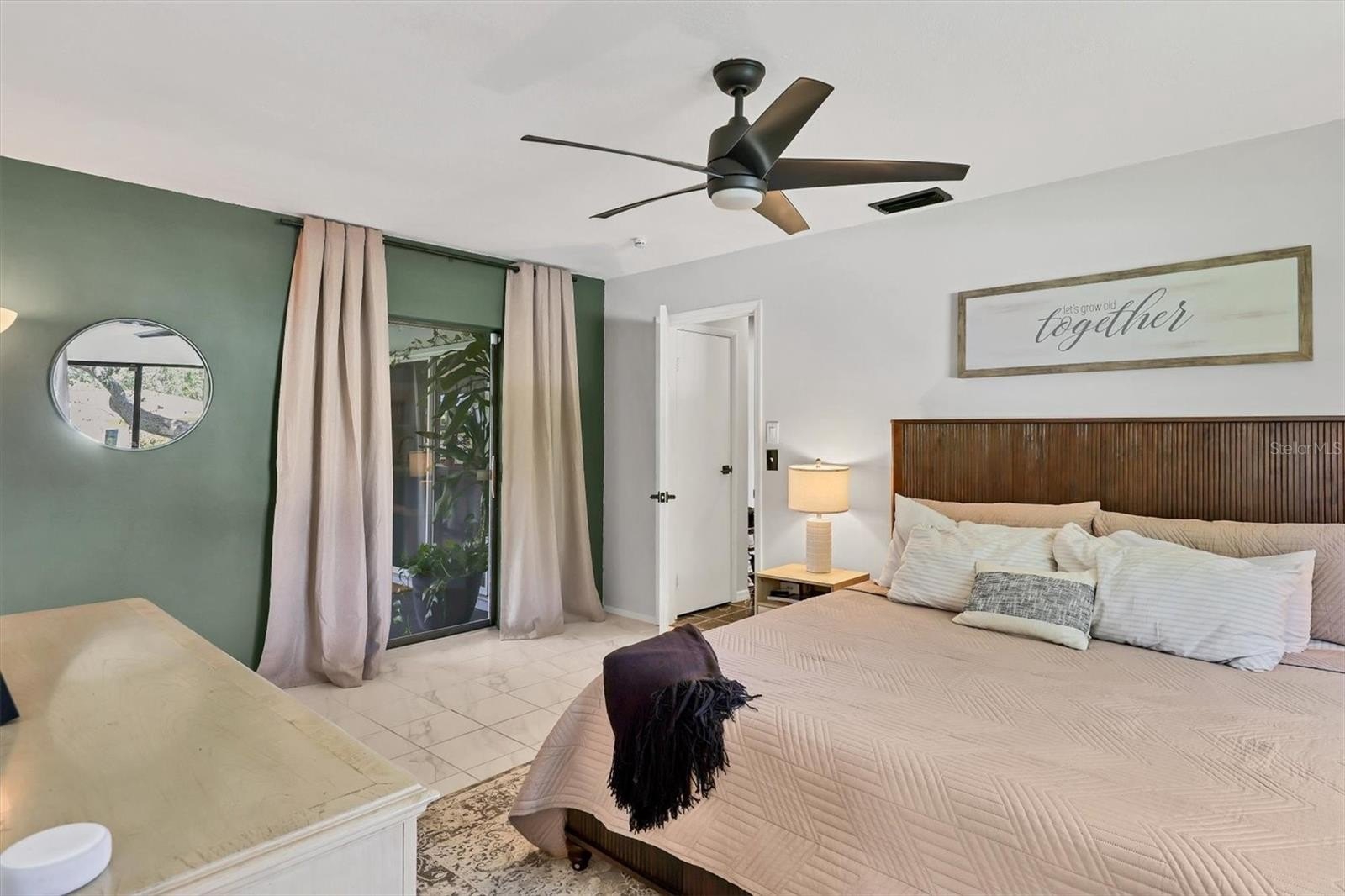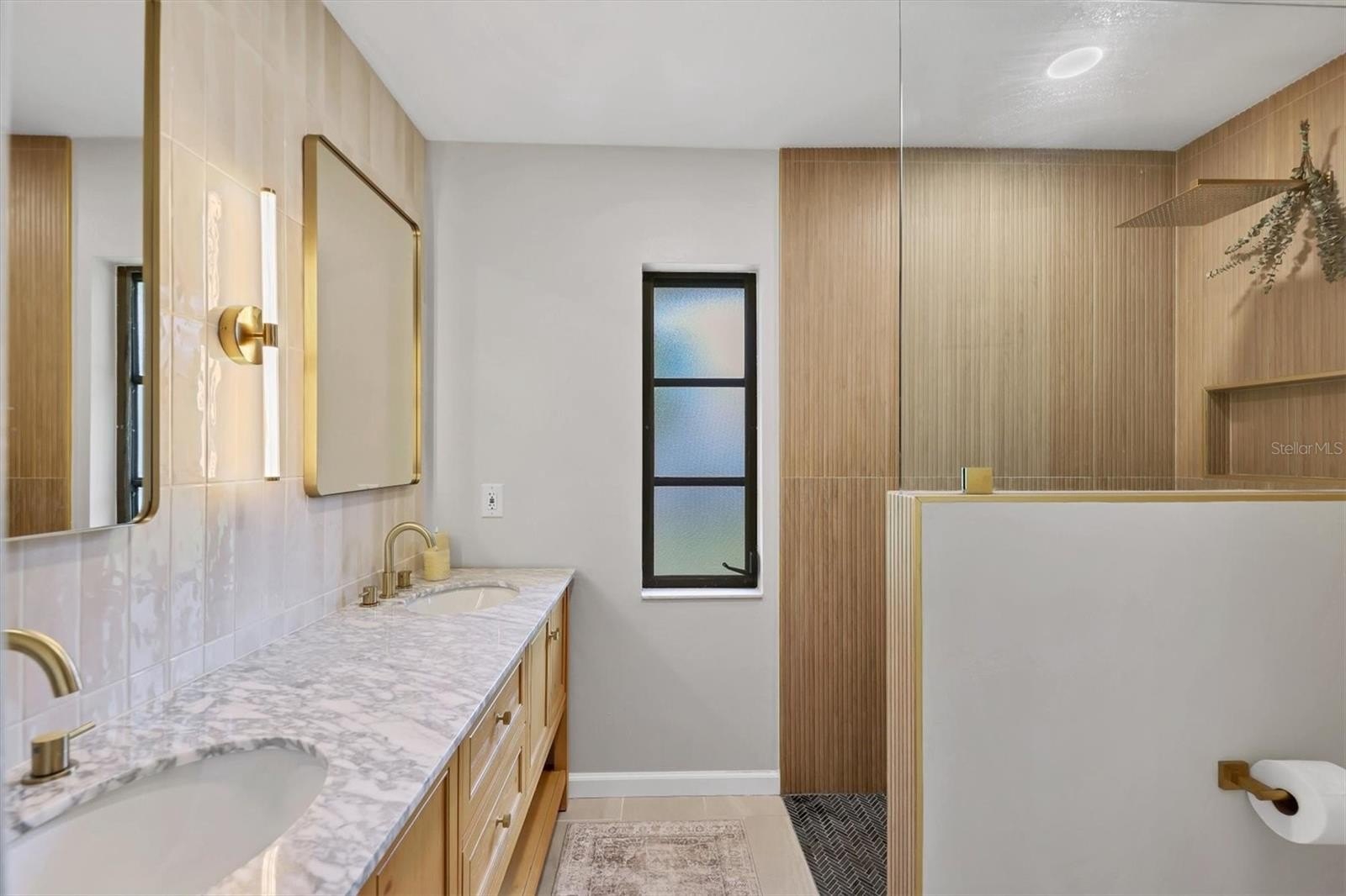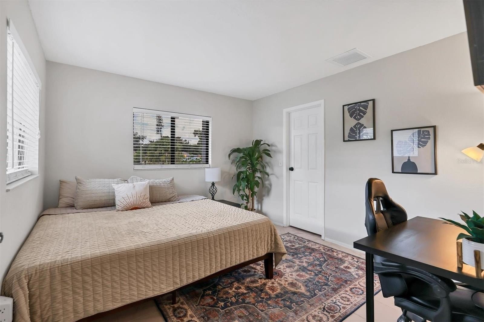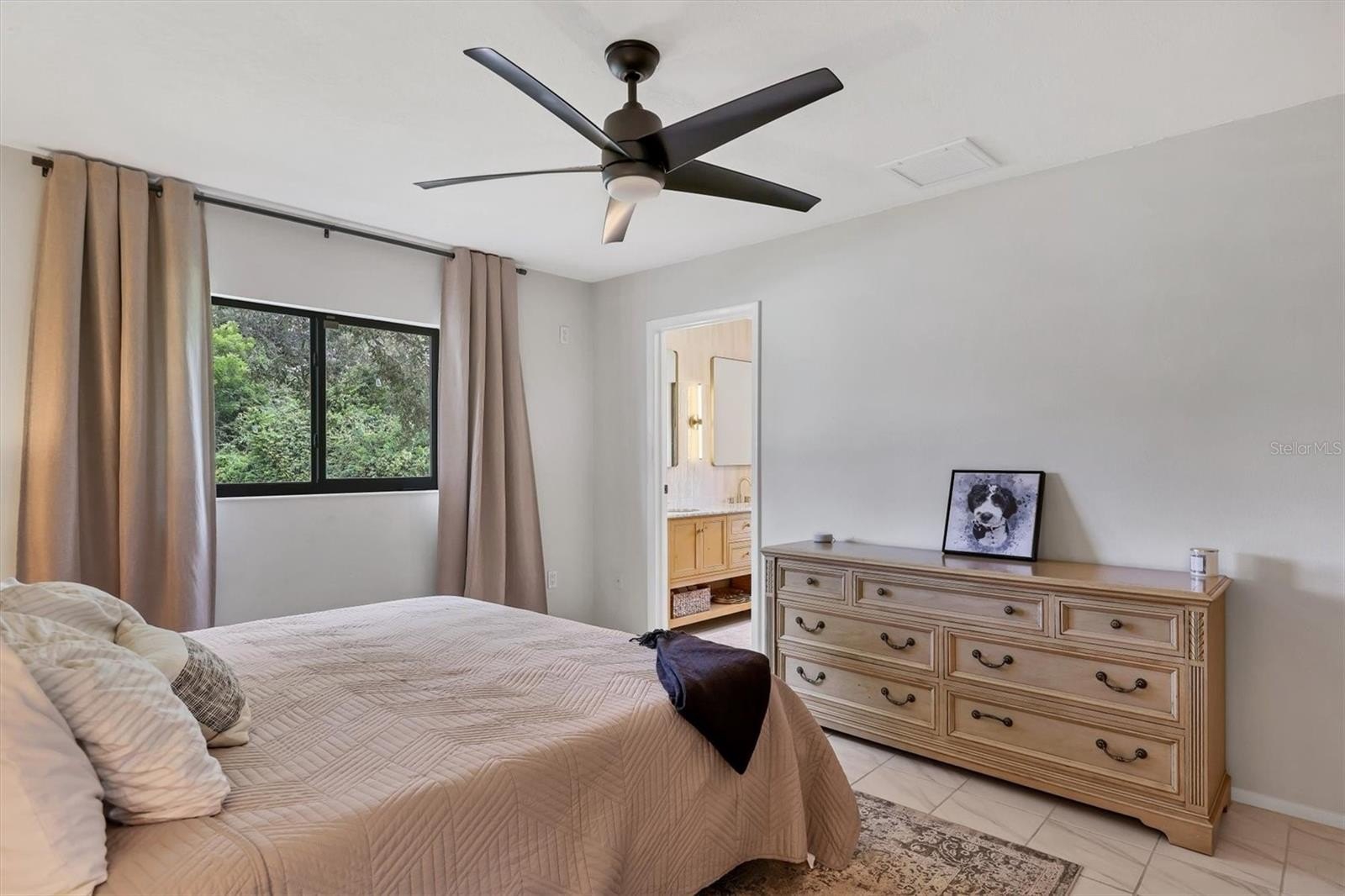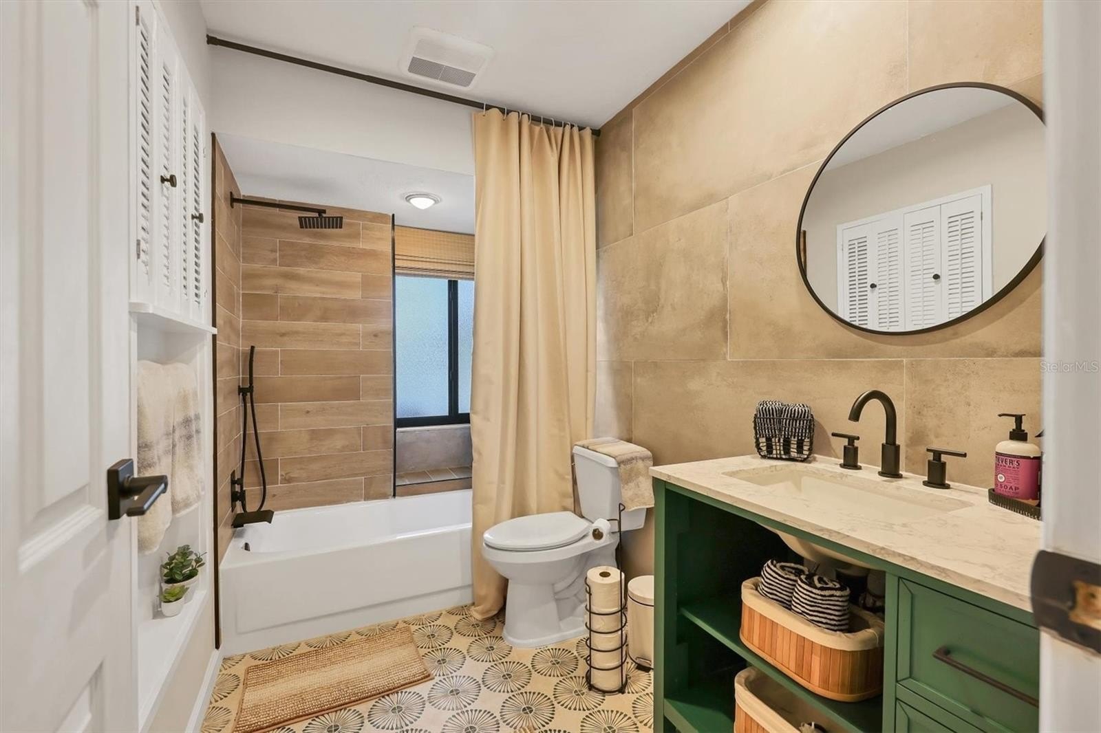 The primary suite offers tile flooring, a large walk-in closet, and a tastefully updated en-suite bathroom complete with dual sinks, quartz countertops, and a walk-in shower with wood-look tile in a chic boho style. The additional bedrooms also feature tile flooring and walk-in closets and share a well-appointed hall bath with a tub and shower combination.