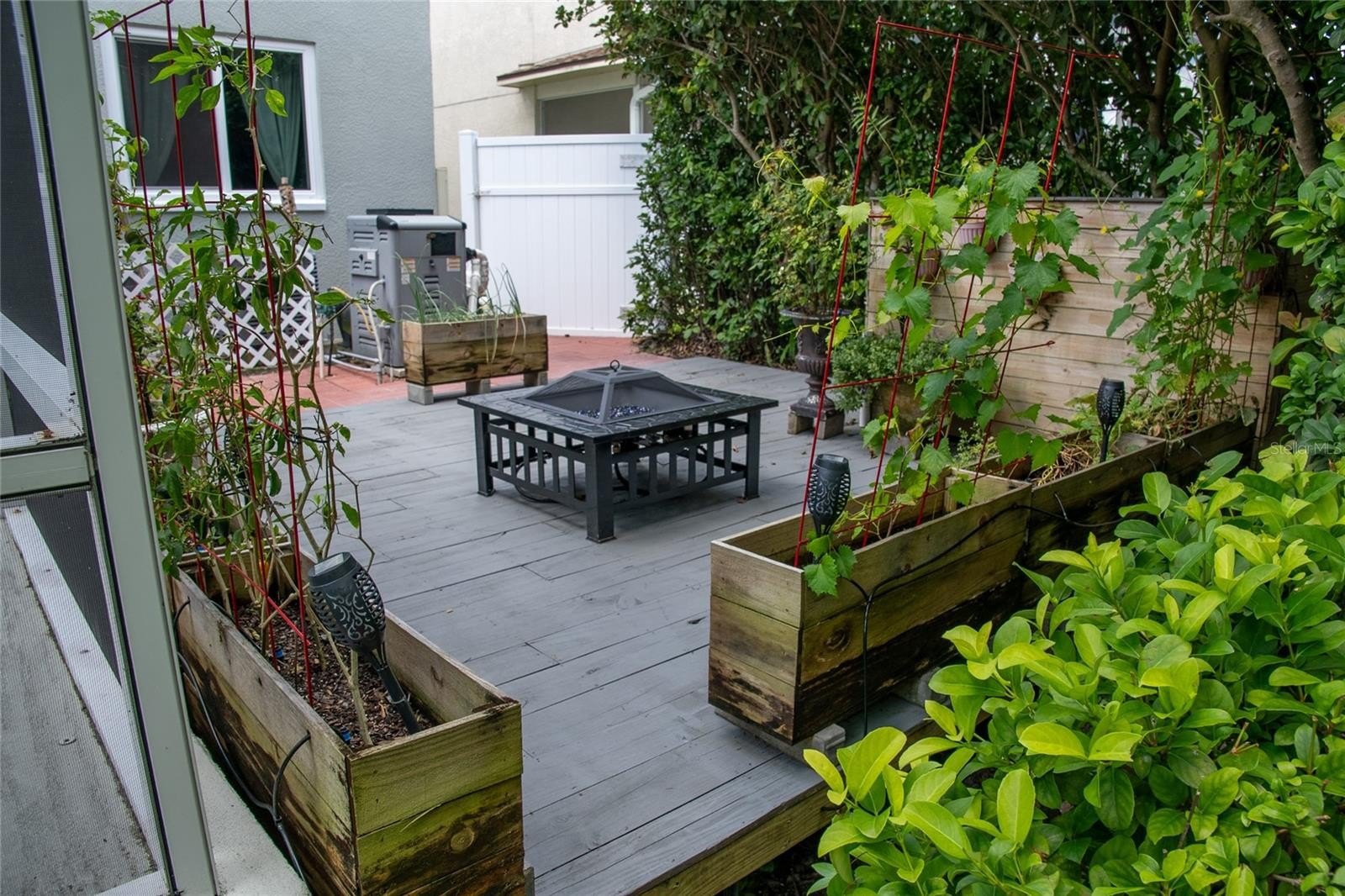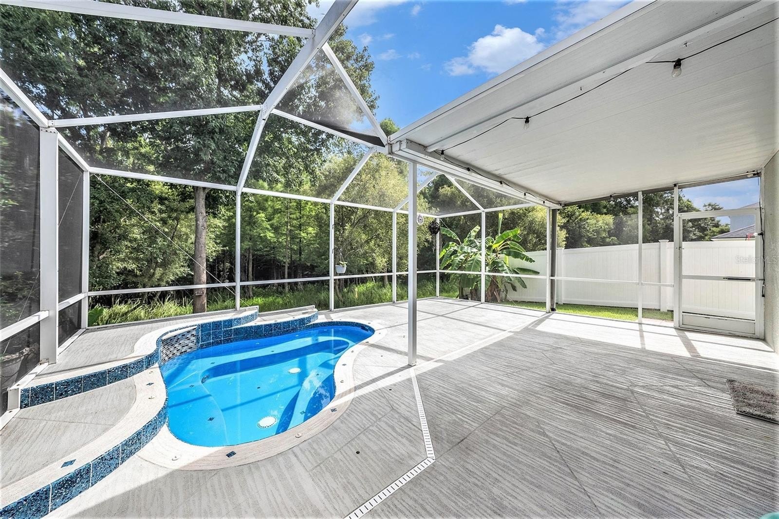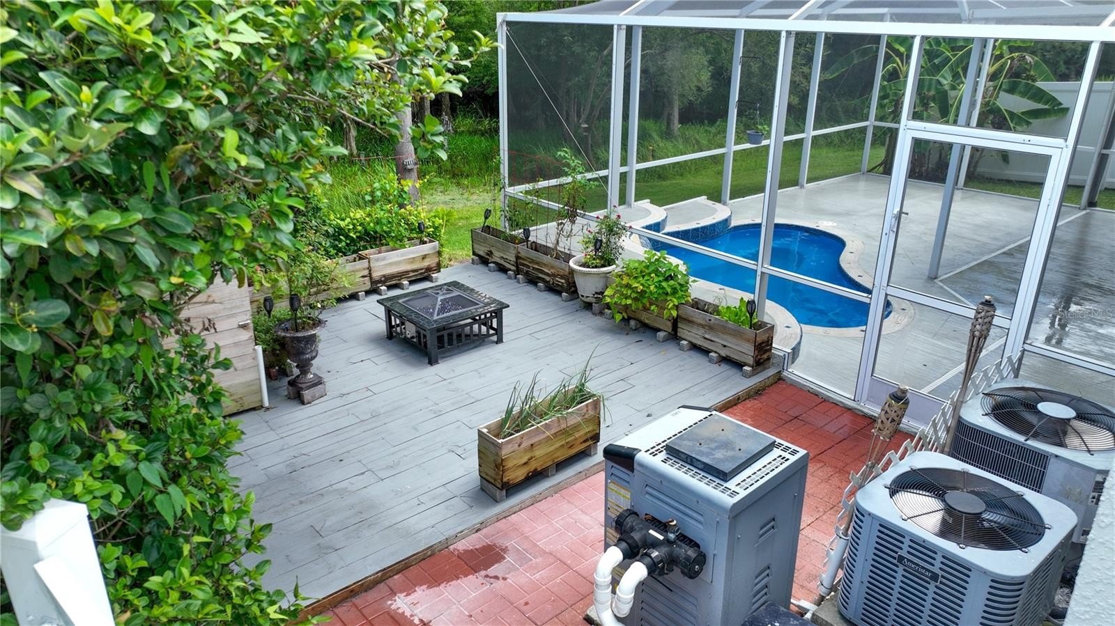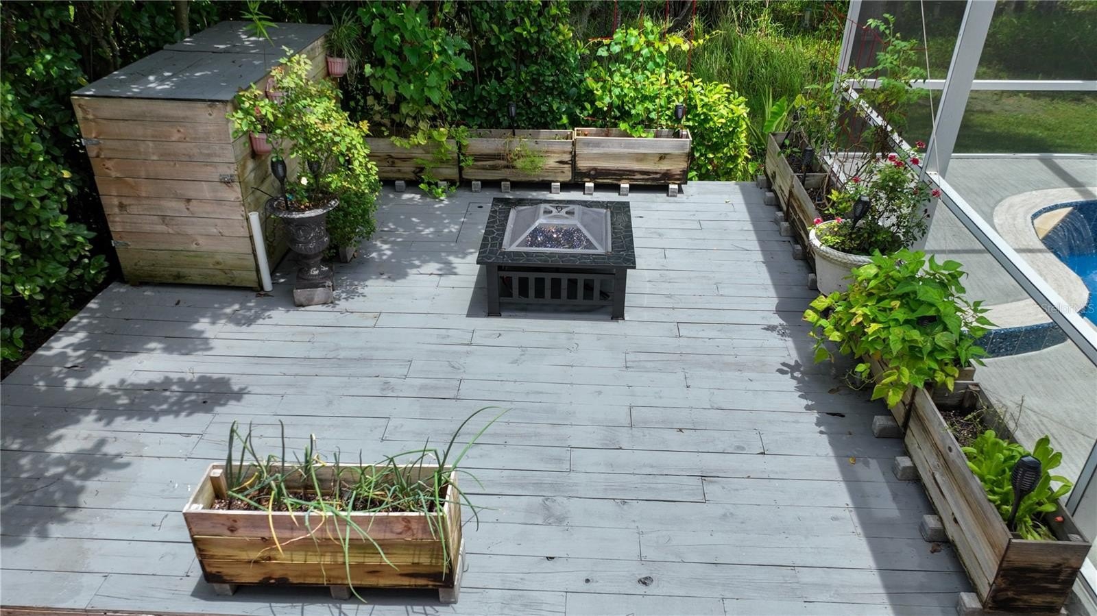 Outdoor living shines here: a screened lanai with pool/spa (Spool) offers a peaceful view of the conservation area. Beyond the pool cage, enjoy your own wood deck with fire pit—an inviting spot for stargazing, gardening, or hosting friends on warm Florida evenings.