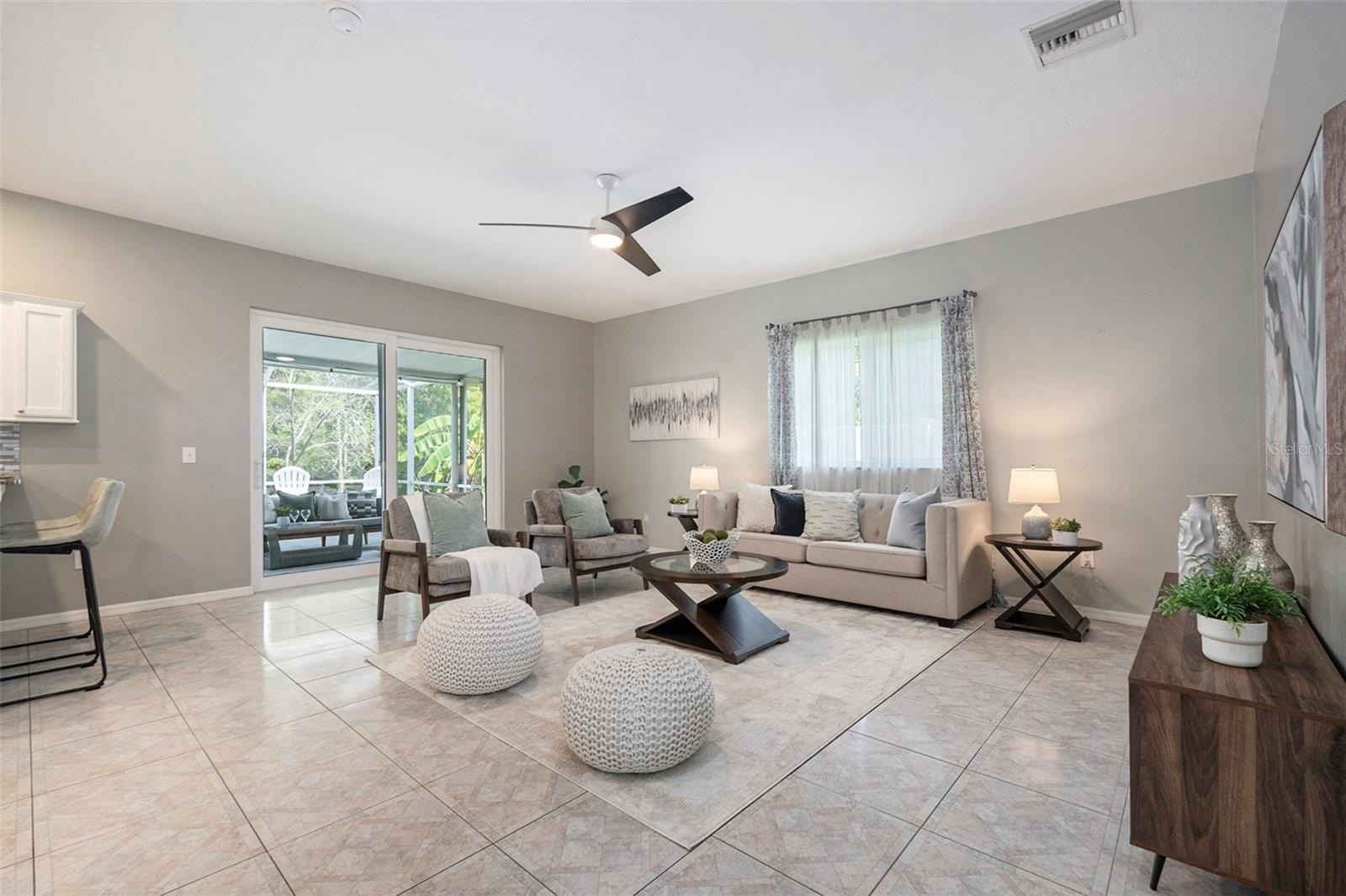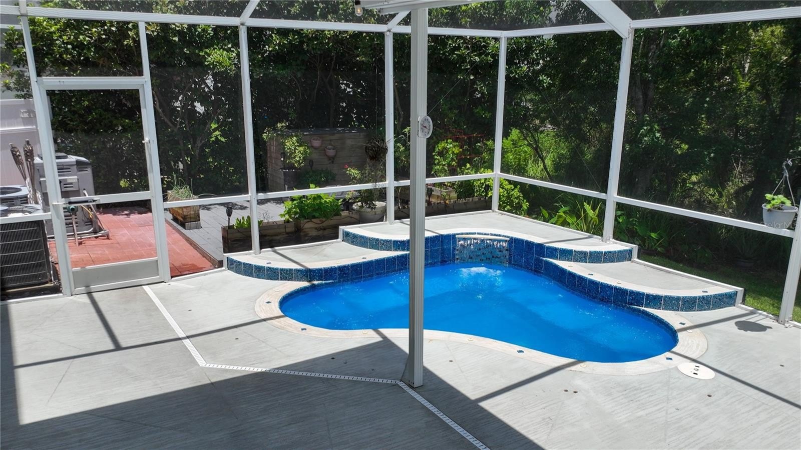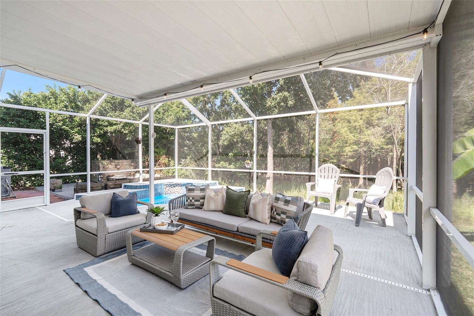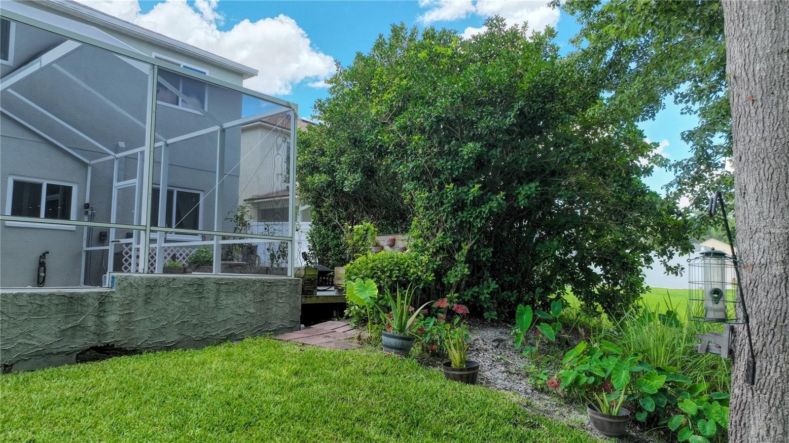 Outdoor living shines here: a screened lanai with pool/spa (Spool) offers a peaceful view of the conservation area. Beyond the pool cage, enjoy your own wood deck with fire pit—an inviting spot for stargazing, gardening, or hosting friends on warm Florida evenings.