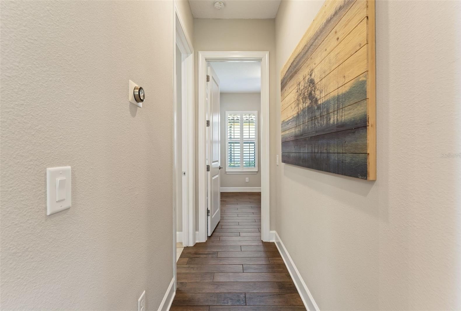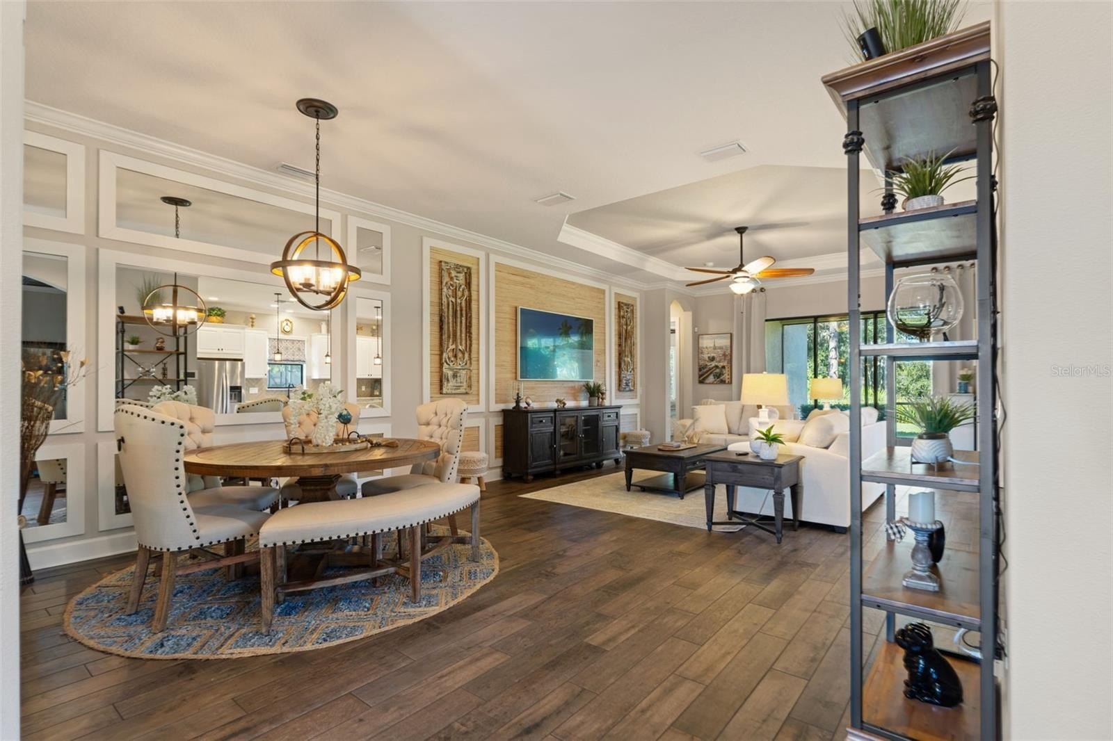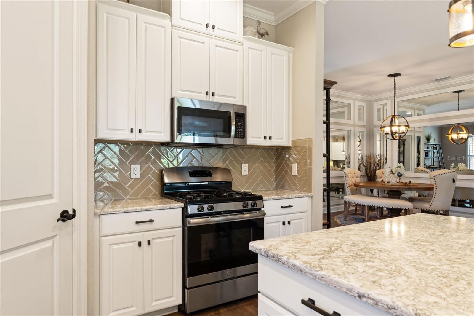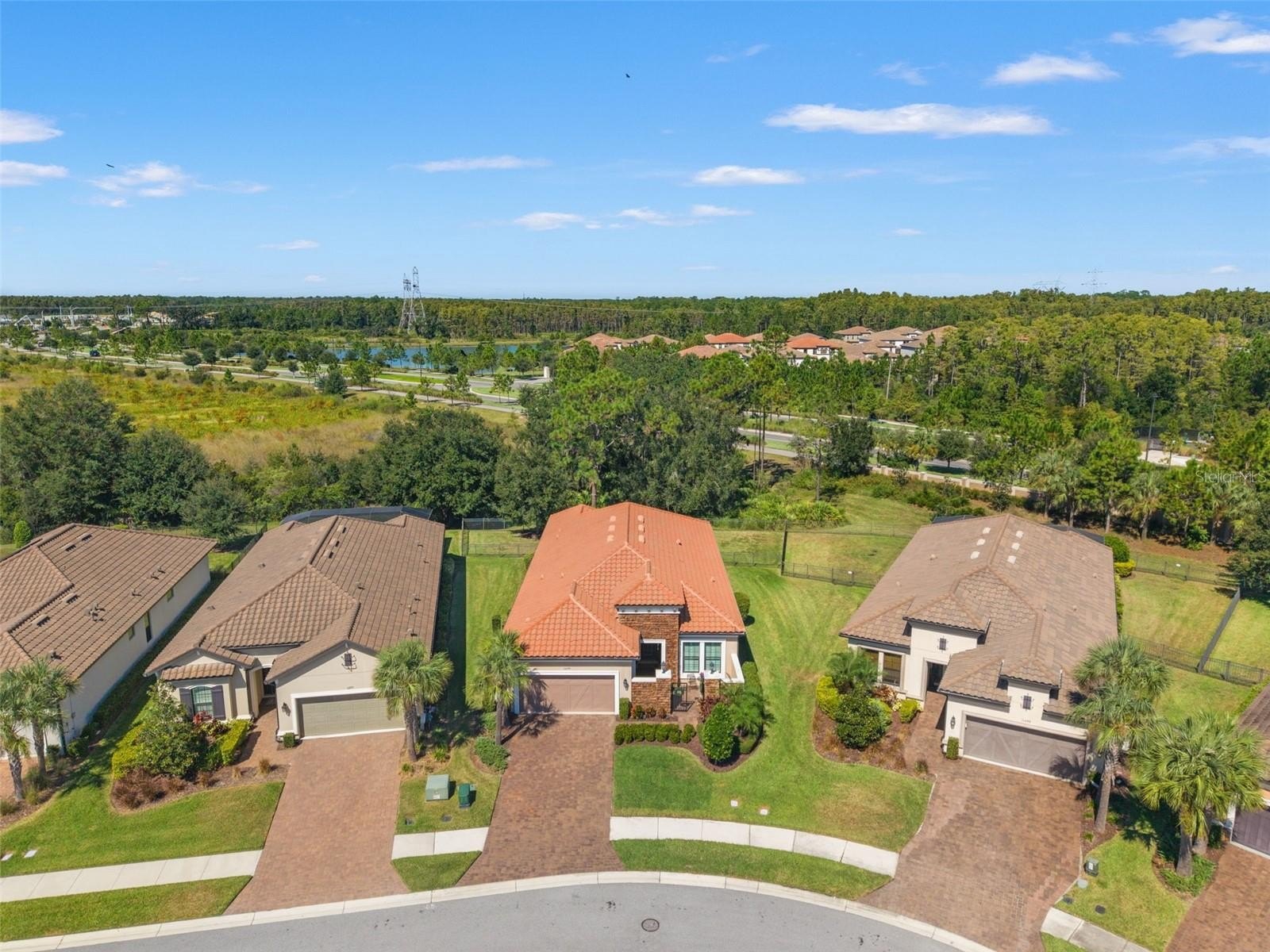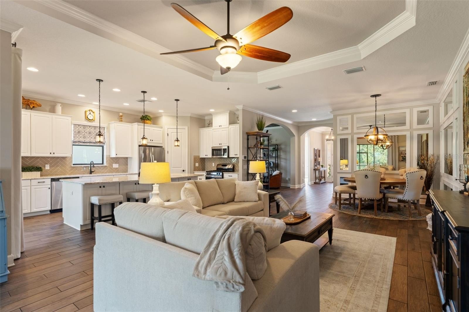 A DEDICATED HOME OFFICE sits at the heart of the home, followed by an OPEN-CONCEPT GREAT ROOM combining the FAMILY ROOM, DINING AREA, and GOURMET KITCHEN. HIGH CEILINGS, CROWN MOLDING, 8-FOOT DOORS, and CUSTOM MILLWORK add elegance throughout. The CHEF’S KITCHEN features 42” WHITE CABINETS, PREMIUM QUARTZ COUNTERS, HERRINGBONE GLASS BACKSPLASH, PENDANT LIGHTING, and STAINLESS APPLIANCES including a GAS RANGE. The PRIVATE PRIMARY SUITE is tucked at the rear with a BAY WINDOW EXTENSION, TRAY CEILINGS, and PEACEFUL CONSERVATION VIEWS. The LUXURY PRIMARY BATH includes DUAL QUARTZ VANITIES, LARGE WALK-IN SHOWER, and SPACIOUS CLOSET. Enjoy the FLORIDA LIFESTYLE outdoors on the EXTENDED SCREENED LANAI and FULLY FENCED BACKYARD with NO REAR NEIGHBORS. Additional features include a TANKLESS WATER HEATER, WHOLE-HOME GENERATOR, and WATER SOFTENER.