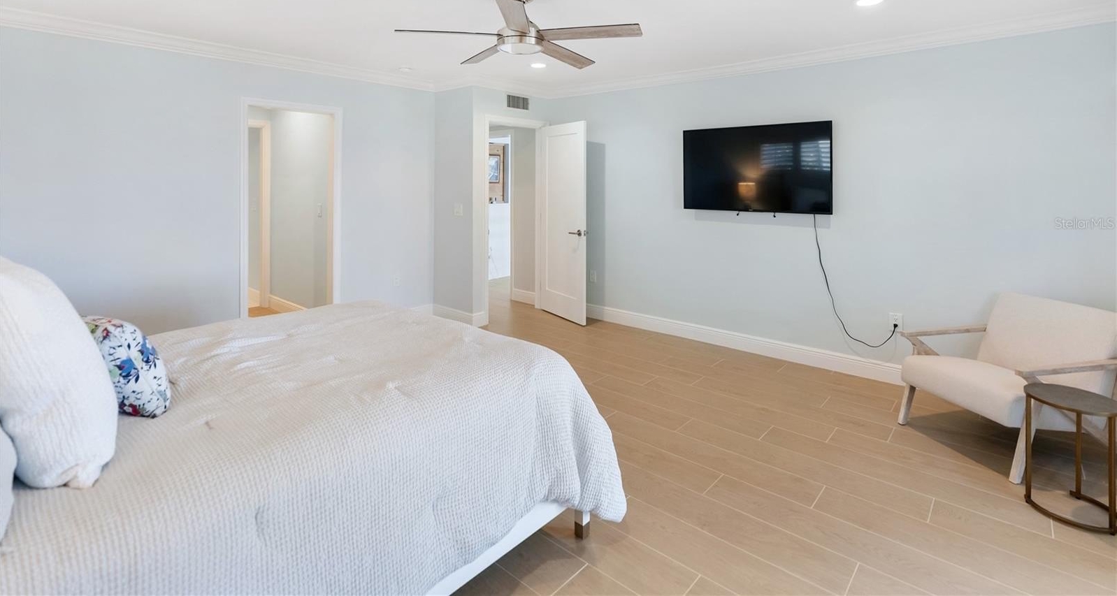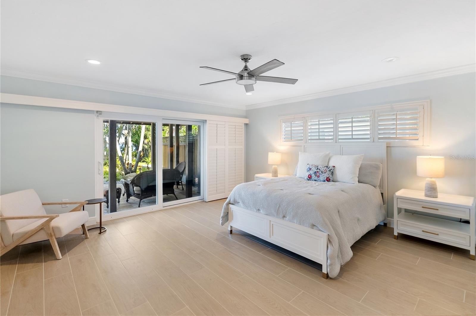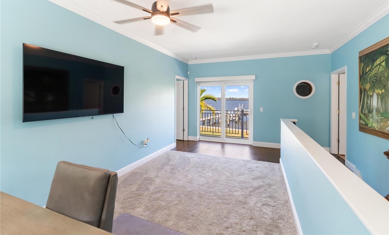 The home’s interiors have been beautifully refreshed with brand new tile floors, baseboards, and doors, along with elegant plantation shutters throughout. Two bedrooms and 2.5 baths are conveniently located on the main level, while the luxurious primary suite upstairs offers sweeping water views and a spa-like ensuite bathroom. An additional bedroom doubles as a guest or flex space with a built-in Murphy bed. The laundry room is outfitted with a dedicated split AC unit, and the features new stove washer and dryer for modern convenience.