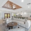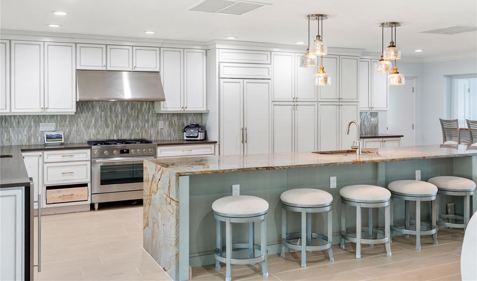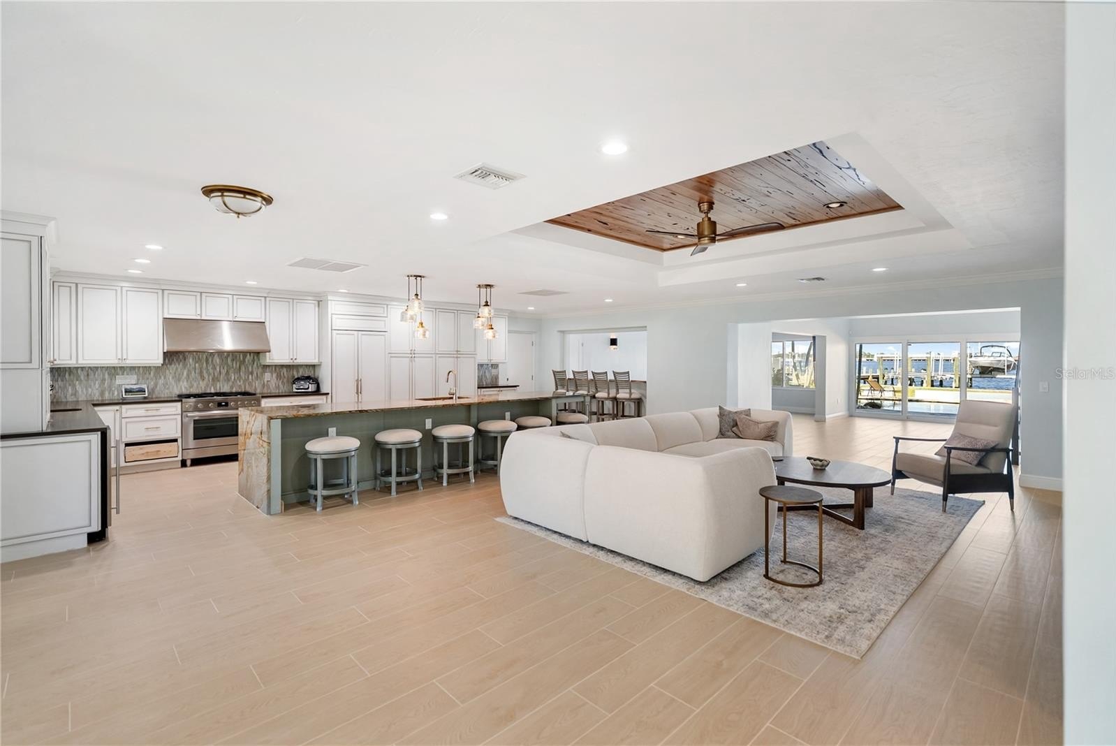 The gourmet kitchen is a chef’s dream, featuring 42-inch wood cabinetry, a stunning 15-foot granite island, brand new stainless steel gas stove and dishwasher, under-mount single-bowl sink, and ample space for multiple cooks. Just off the kitchen, the spacious living and dining areas boast coffered ceilings and expansive water views, creating a seamless flow perfect for entertaining.