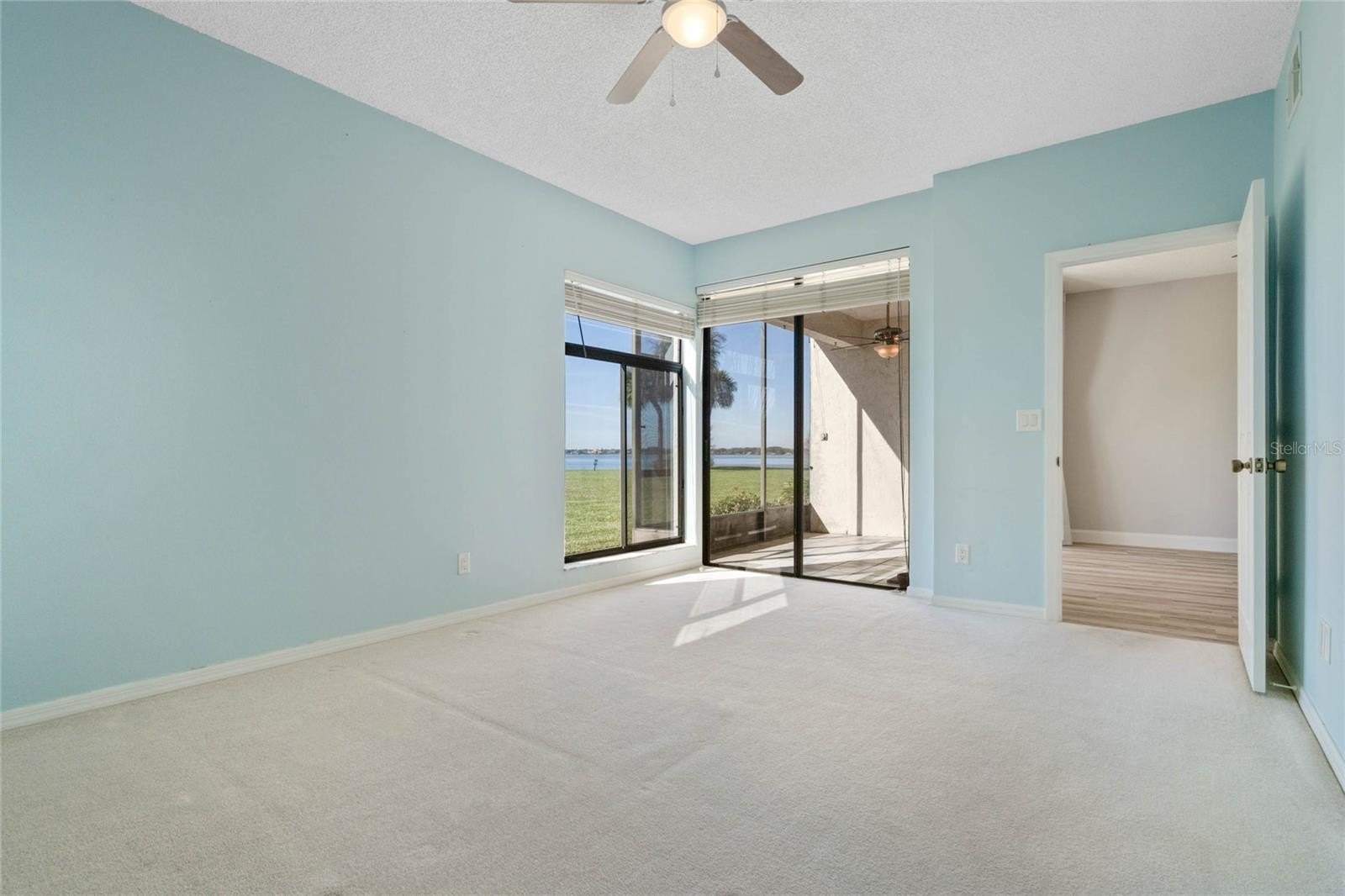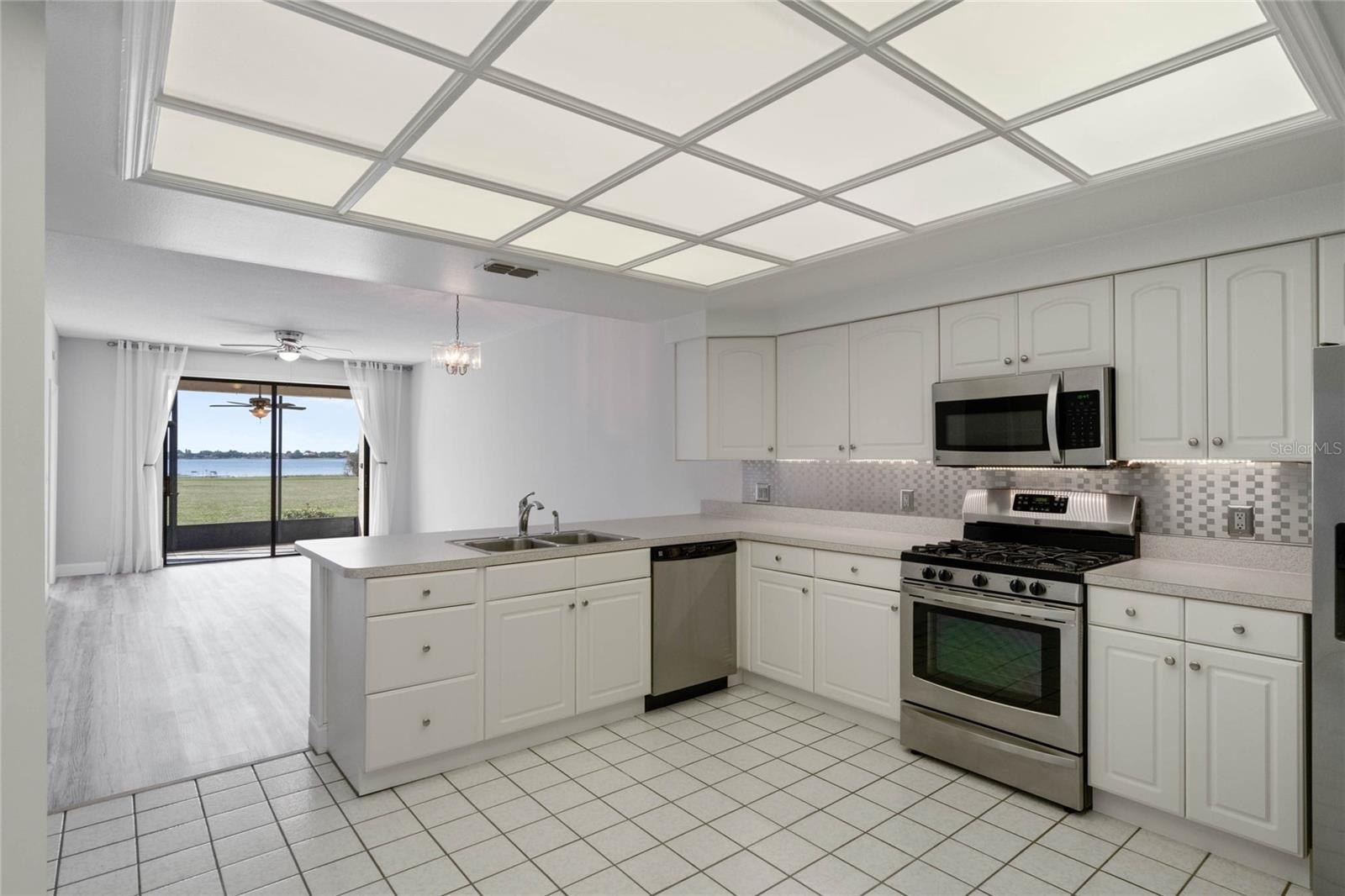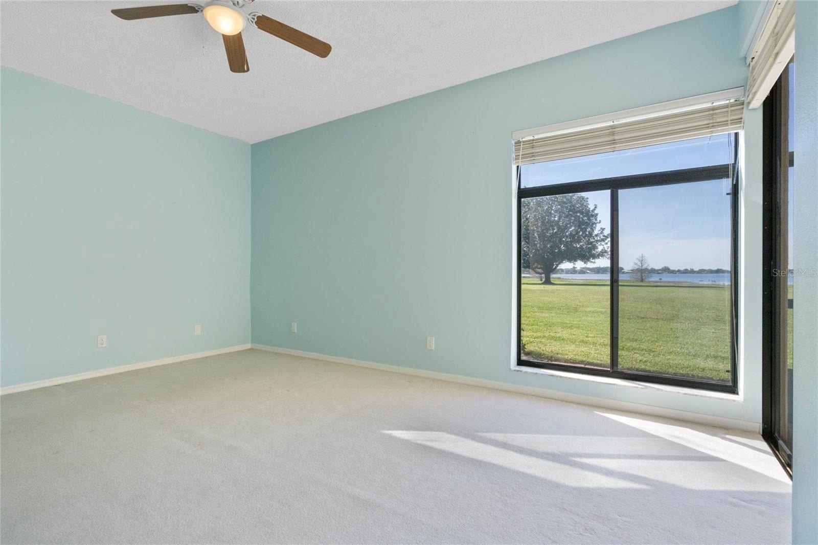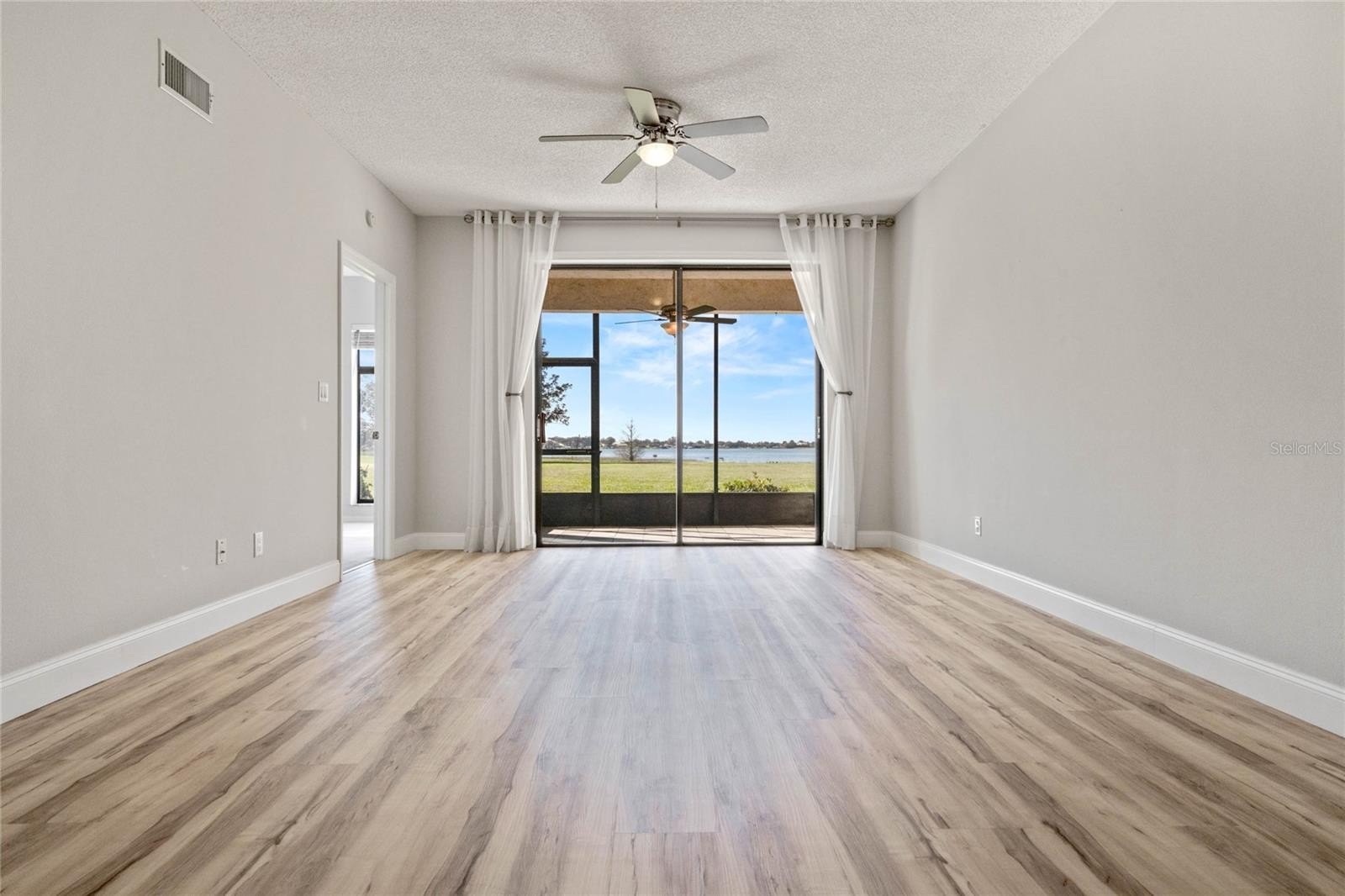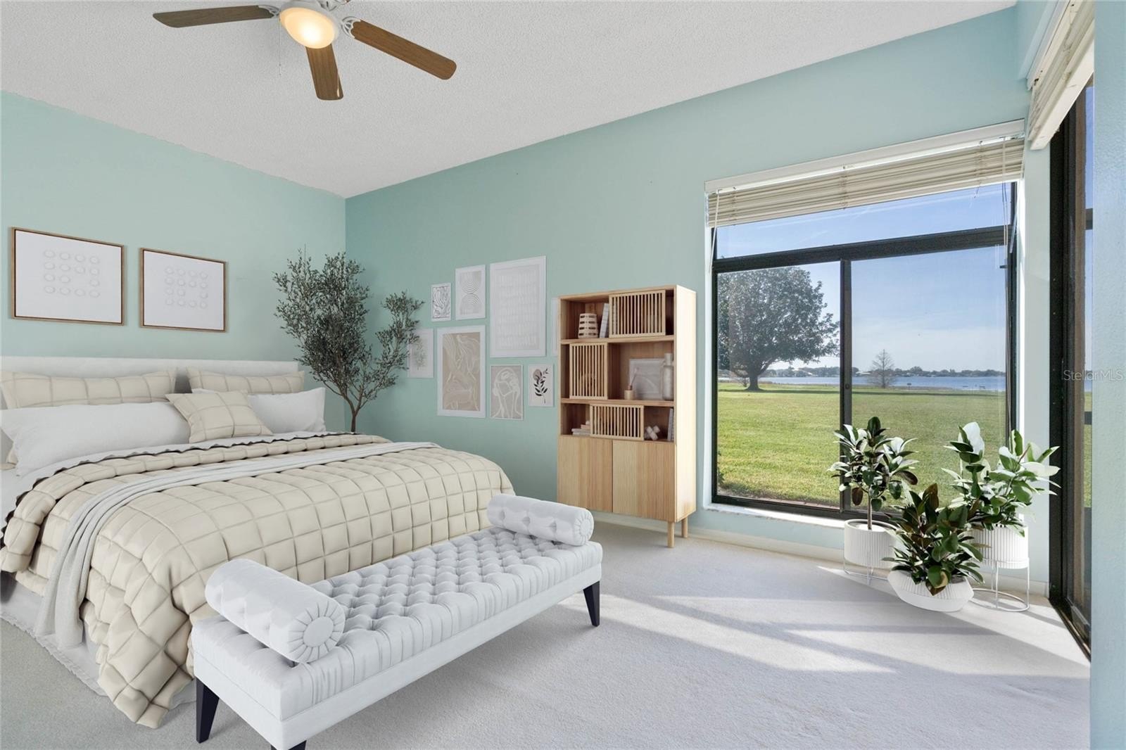 Inside, the open layout is filled with natural light and features a spacious living room with newer LVP flooring, neutral paint, and sliding glass doors framing serene water views. The dining area flows into a well-equipped eat-in kitchen complete with breakfast bar, dinette, walk-in pantry, closet laundry with washer/dryer, and all essential appliances including a gas range. The primary suite enjoys lake views, an expansive walk-in closet, ceiling fan, and en-suite bath with dual sinks, linen storage, and walk-in shower. A comfortable guest bedroom with ample closet space and adjacent full bath provides privacy for family or visitors. The screened patio is the ideal spot to start your day with coffee or unwind at sunset.