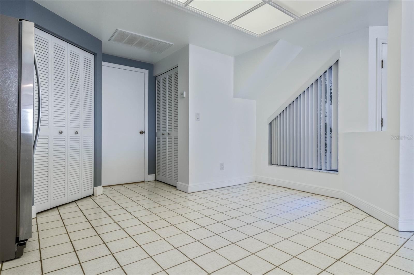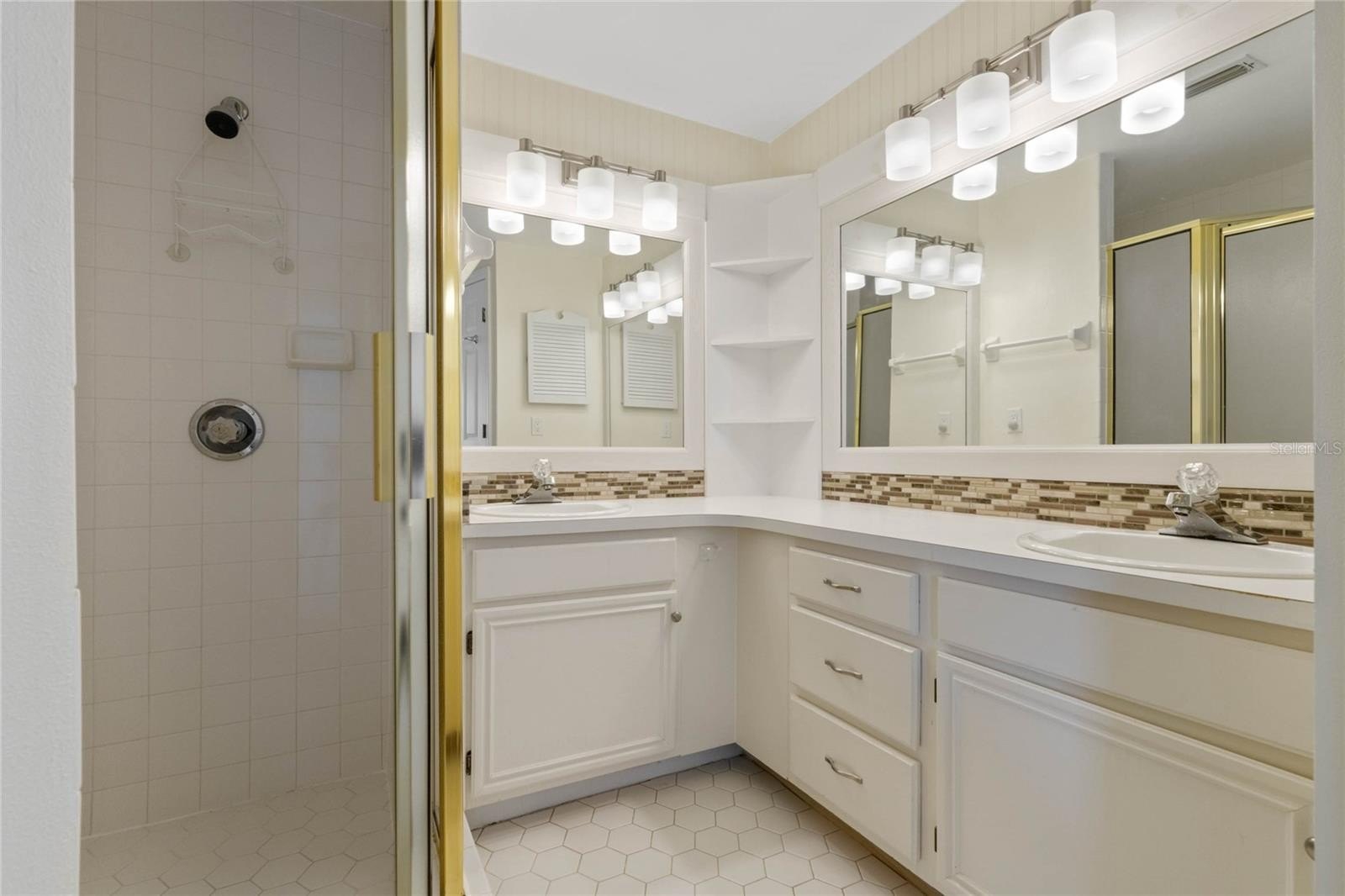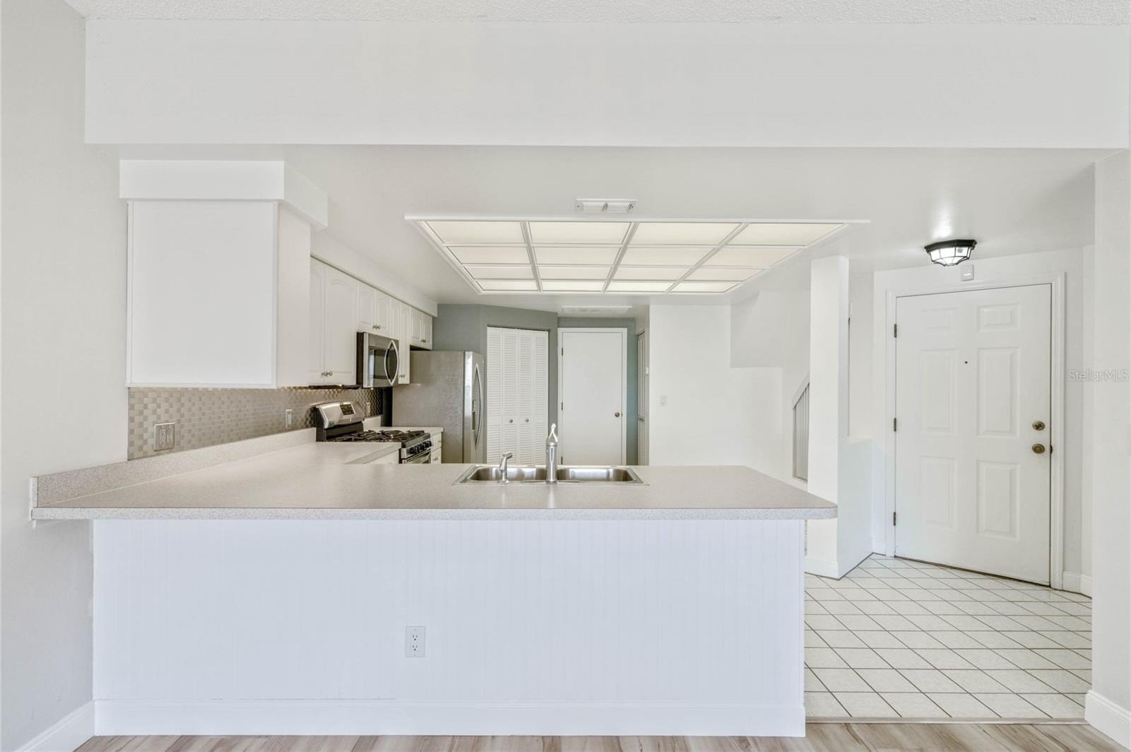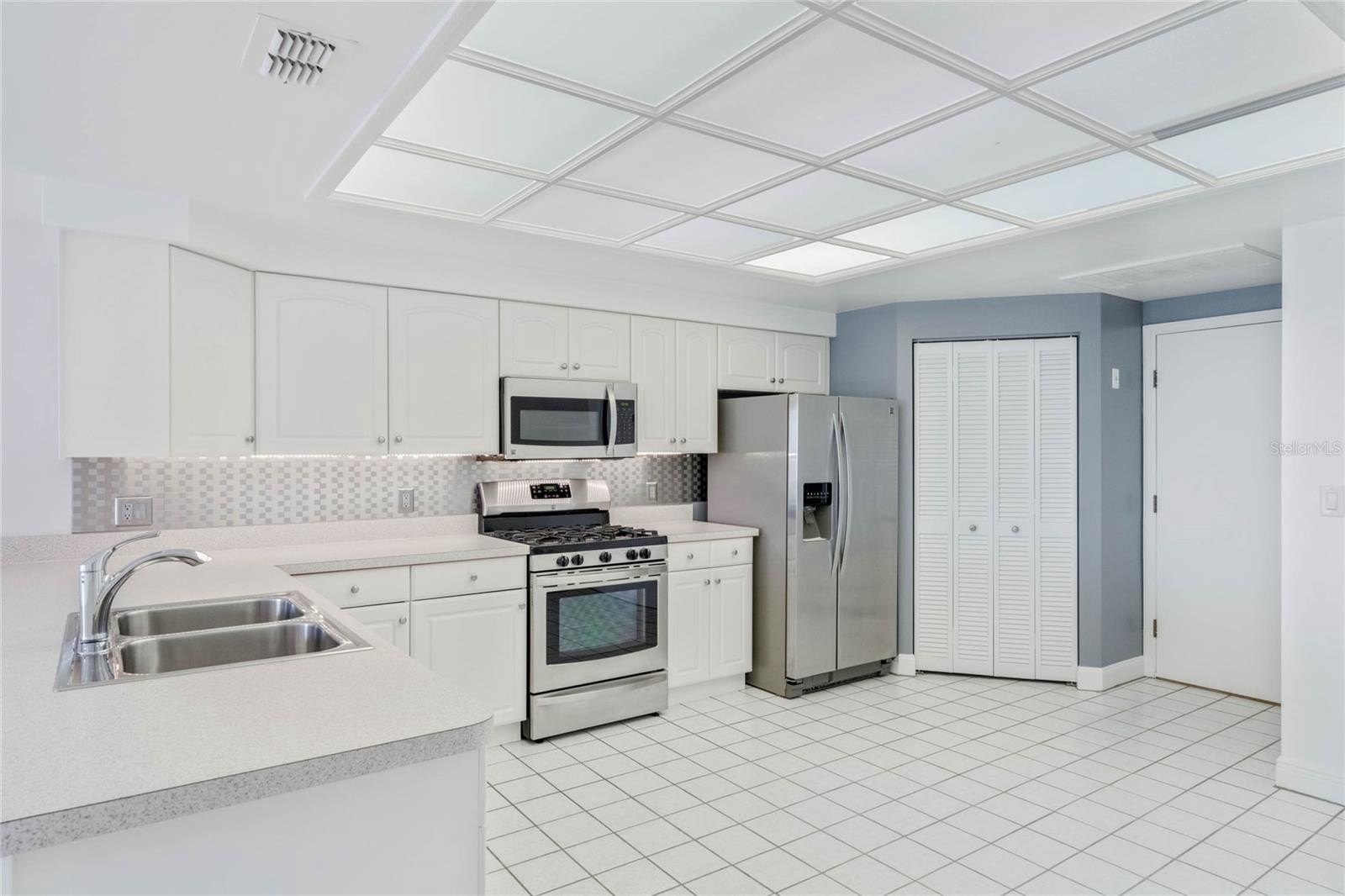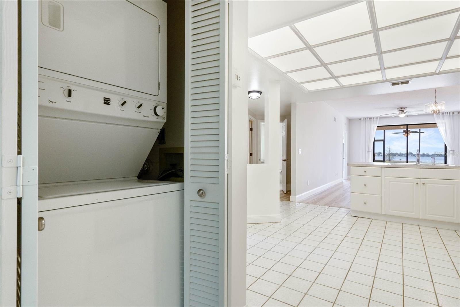 Inside, the open layout is filled with natural light and features a spacious living room with newer LVP flooring, neutral paint, and sliding glass doors framing serene water views. The dining area flows into a well-equipped eat-in kitchen complete with breakfast bar, dinette, walk-in pantry, closet laundry with washer/dryer, and all essential appliances including a gas range. The primary suite enjoys lake views, an expansive walk-in closet, ceiling fan, and en-suite bath with dual sinks, linen storage, and walk-in shower. A comfortable guest bedroom with ample closet space and adjacent full bath provides privacy for family or visitors. The screened patio is the ideal spot to start your day with coffee or unwind at sunset.