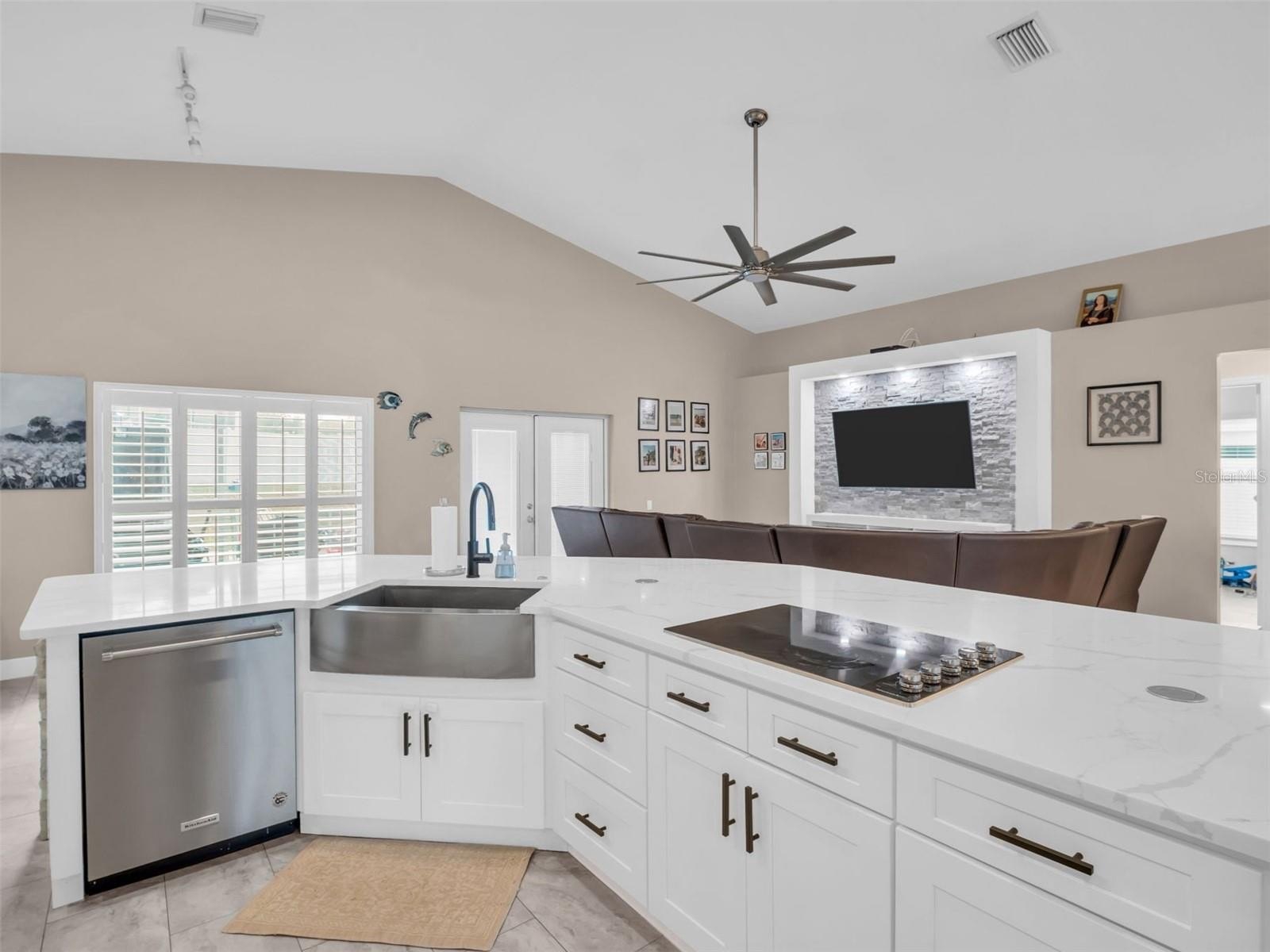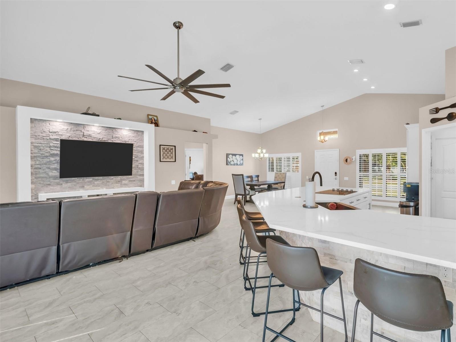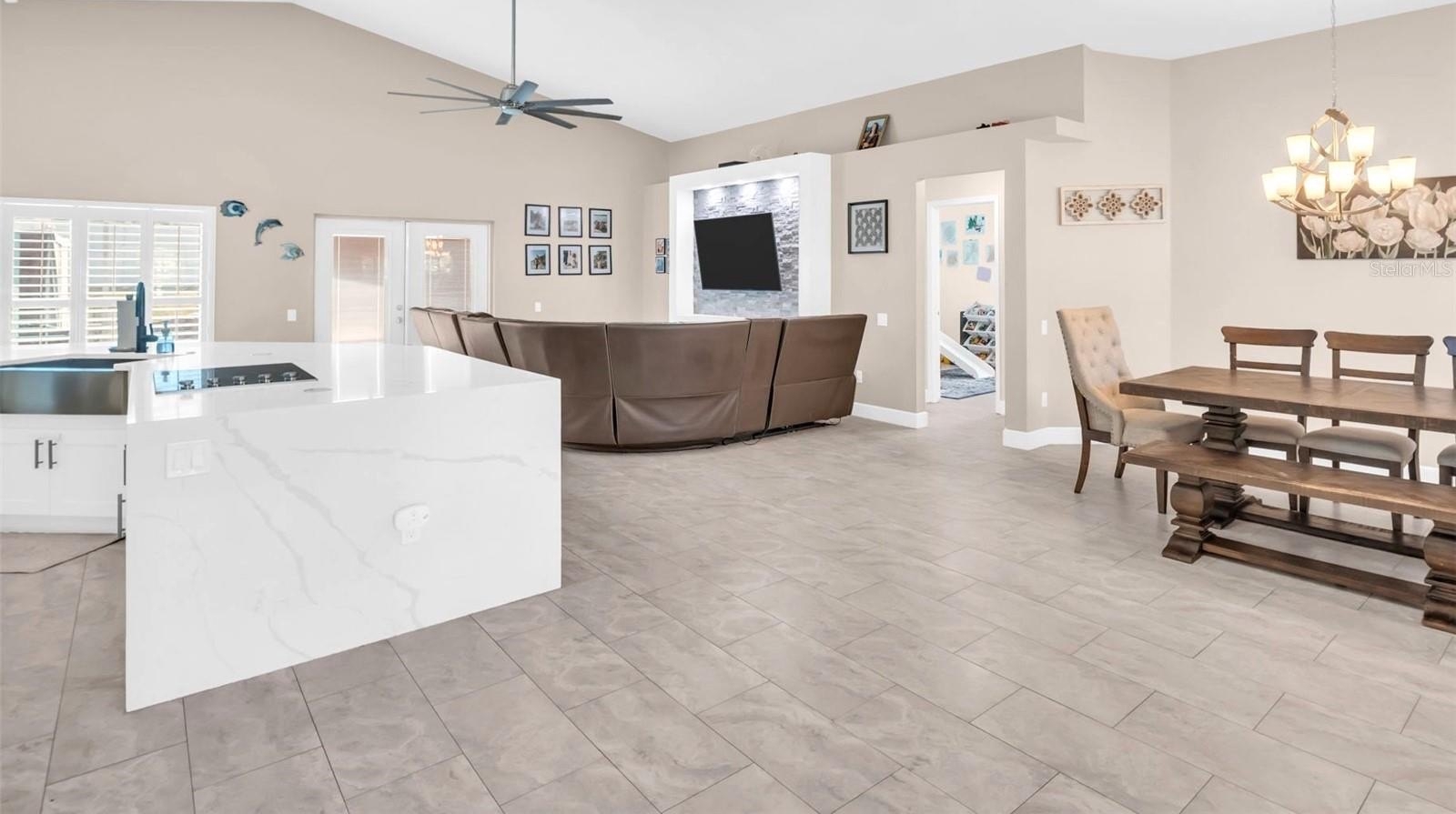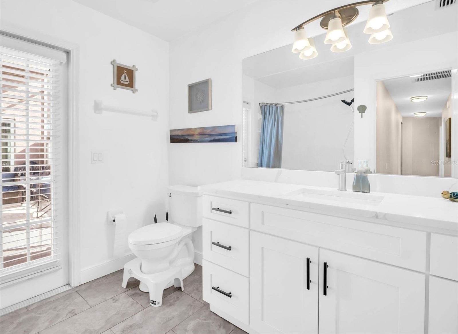 The heart of the home is the stunning new kitchen, designed with both style and functionality in mind. It features a center island with striking waterfall granite countertops, sleek cabinetry, and high-end finishes that make it the perfect gathering place for family and friends. Both bathrooms have been fully remodeled with a contemporary touch, while brand-new tile flooring flows seamlessly throughout the entire home, tying each space together.