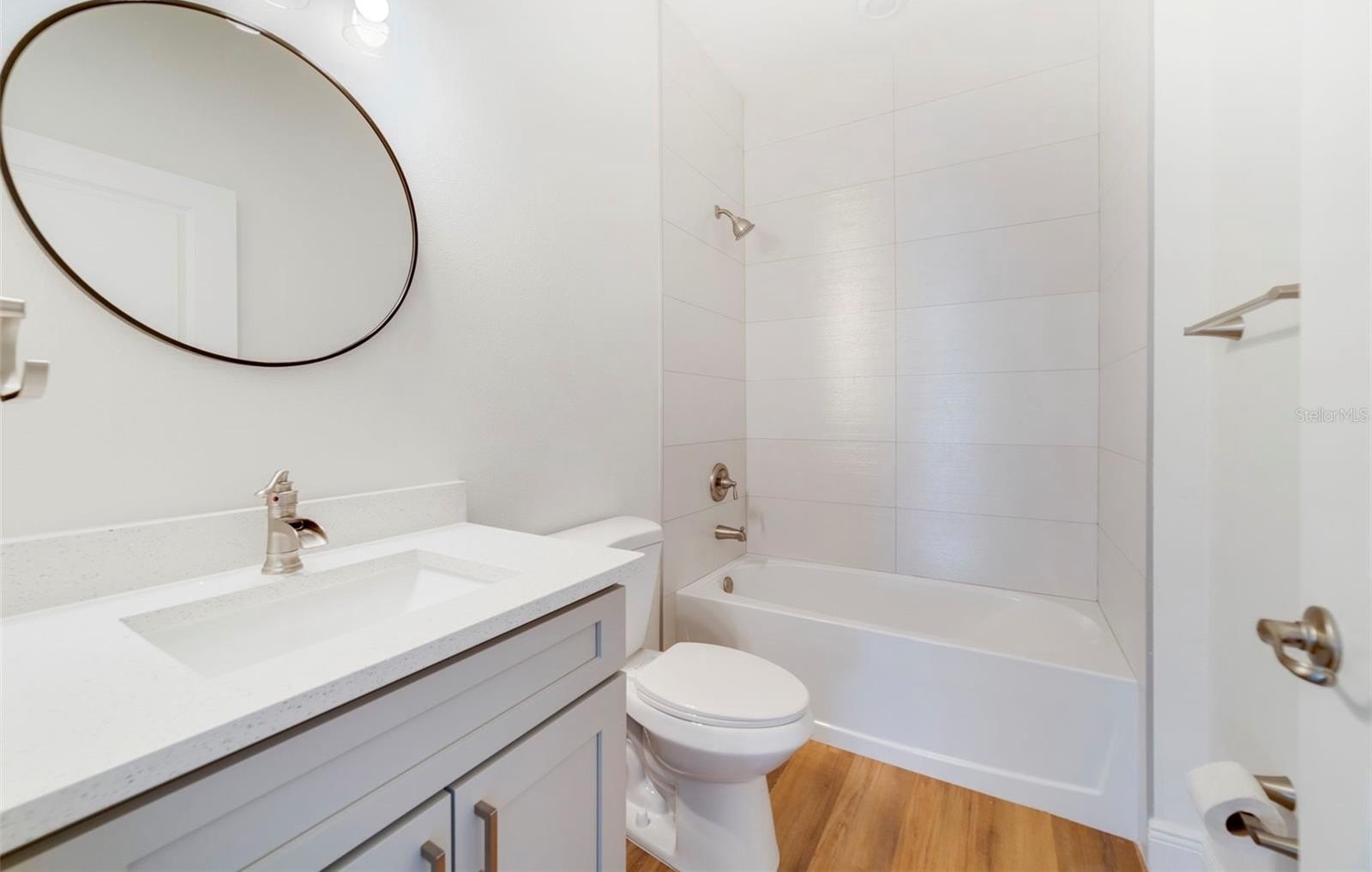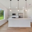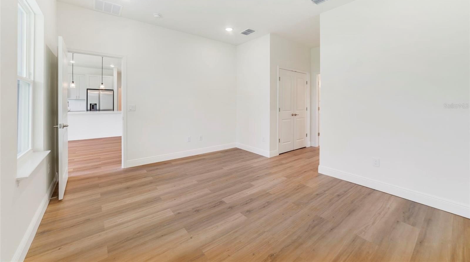 The gourmet kitchen is a chef’s delight, showcasing sleek modern cabinetry, beautiful countertops, high-quality brand-new stainless appliances, and a spacious pantry for extra storage.