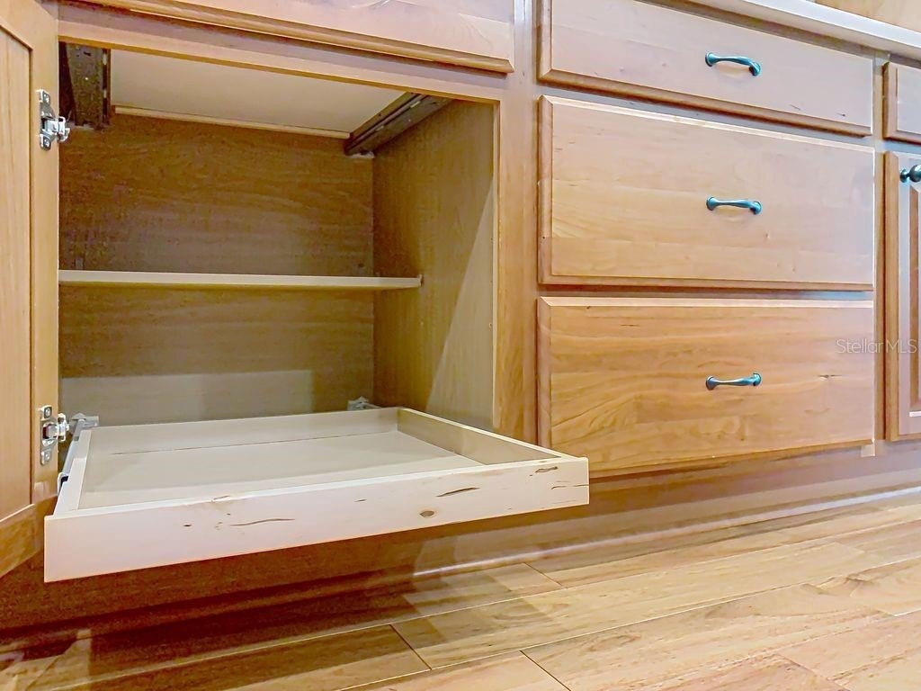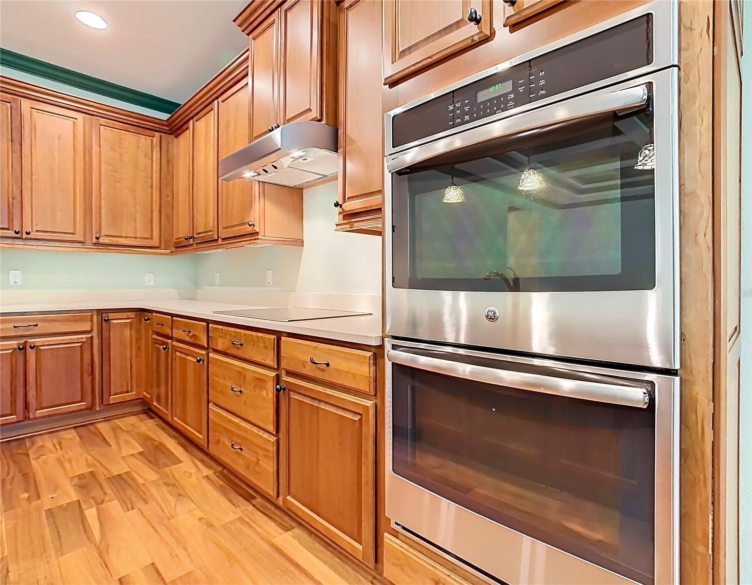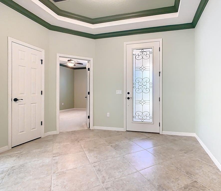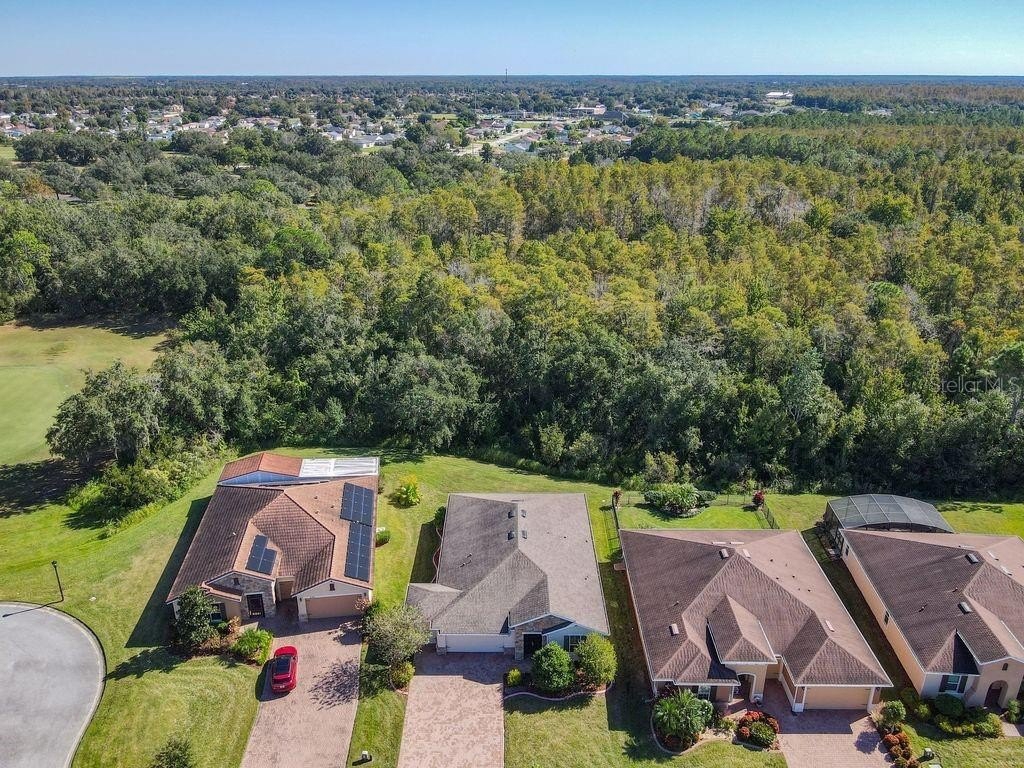 **See the FULL LENGTH VIDEO on Tour Link 1.** Meticulously cared for, one owner, Cambria 2 bedroom, 2 1/2 bath, with Den/Office, 2 car and golf cart garage model in sought after Treviso neighbor of Solivita. This home sits on a conservation lot on a peaceful cul-de-sac street. Loaded with upgrades from the stone exterior,whole house gutters, landscape curbing, screened entry porch, and long paved driveway. Inside you will enjoy the Gourmet kitchen that would delight any chef. Kitchen features quartz counters,36" Cherry wood cabinets with dental molding,under counter lighting, bottom cabinet pullouts, trash & recycle bin cabinet, baking tray storage, Lazy Susan and deep drawers for easy storage. Appliances feature GE double ovens with one Convection Bake and Roast and a conventional oven, GE Profile Cooktop, LG double door top and pull out drawer and freezer bottom. Water and ice maker in refrigerator door. Miele Futura Classic dishwasher. Exhaust fan that vents outdoors. Kohler porcelain double sink with push button insinkerator and single handle faucet. Breakfast bar with Pendant lighting. Double door Pantry. Wood flooring in Kitchen, dining, and Great Room. Dining room is prewired for your choice of lighting. Great Room has a Coffered ceiling with fan. Crown Molding is throughout this home. Shutters on most windows. Laundry room includes LG front load washer, and a Kenmore Elite dryer w/steam cycle drying. Stainless Steel Laundry sink with single handle faucet and sprayer, additional 11 handle cherry cabinets, and tile flooring. Home, also, features a glass and lead entry door, 20 x 20 tile flooring on diagonal in entry, half bath, and Office/Den. Office/Den has a solid double door entry with lighted closet and window so it can be used as an additional bedroom. Both bedrooms are ensuite and have upgraded tile showers, adult height toilets, upgraded cabinetry. Primary bathroom has 2 sinks, upgraded tile shower with glass door, dressing area at bath entrance with 2 walk-in closets, 2 linen closets and tray ceiling with lighted fan in bedroom.