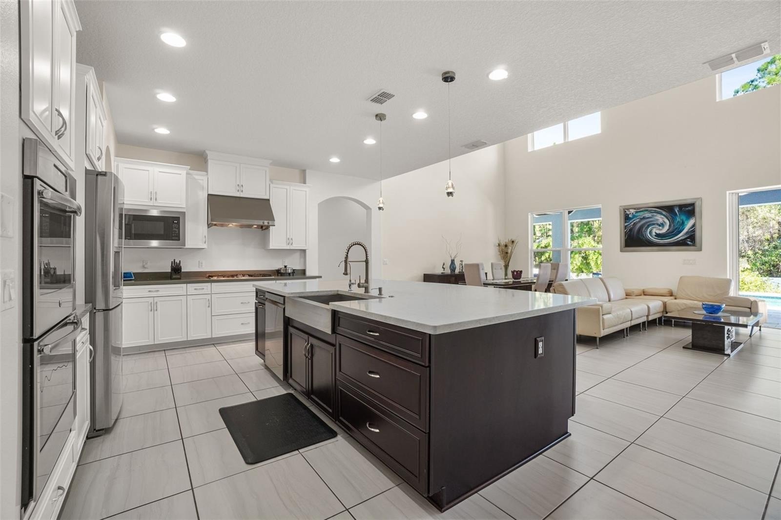 The chef’s kitchen, designed by a culinary professional, showcases premium appliances, a natural gas cooktop, dual ovens, quartz countertops, and a grand center island perfect for entertaining.