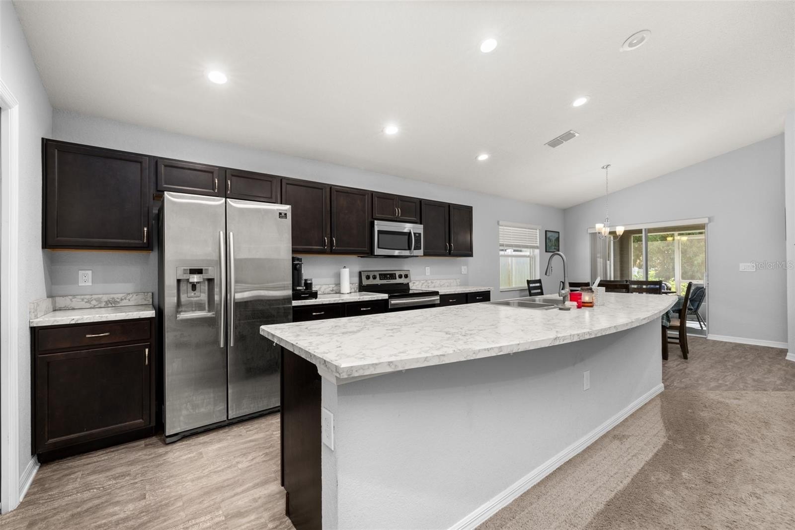 Enter one of the best-situated homes in this desirable community, featuring a stunning pond view and immediate curb appeal. This spacious 4-bedroom, 2-bathroom home is designed for seamless entertaining and comfortable living. Enter the front covered porch, where a grand foyer opens to an expansive living area and a bright, open-concept floor plan. The pass-through kitchen is a chef's delight, fully equipped with stainless steel appliances, ample storage, and rich walnut base cabinets. The Master Suite is a true retreat, offering a large walk-in closet and a spa-like ensuite featuring a dual vanity, private commode, and a separate soaking tub and shower. Secondary bedrooms are generously sized and share a well-appointed second bathroom with a bathtub. Relax in the screened back lanai, overlooking a gorgeous, private fenced in the backyard. The mature garden, complete with lemon bamboo, creates a secluded sanctuary perfect for unwinding.