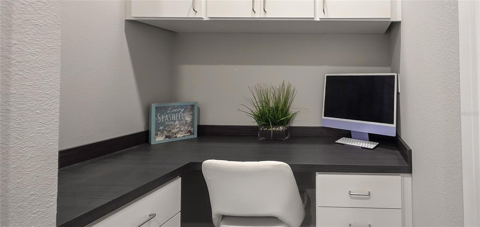 Additional highlights include a screened front entry for enjoying Florida’s breezes and three heavy-duty overhead storage racks in the garage for added convenience; while the built-in desk nook adds a touch of practicality and charm.