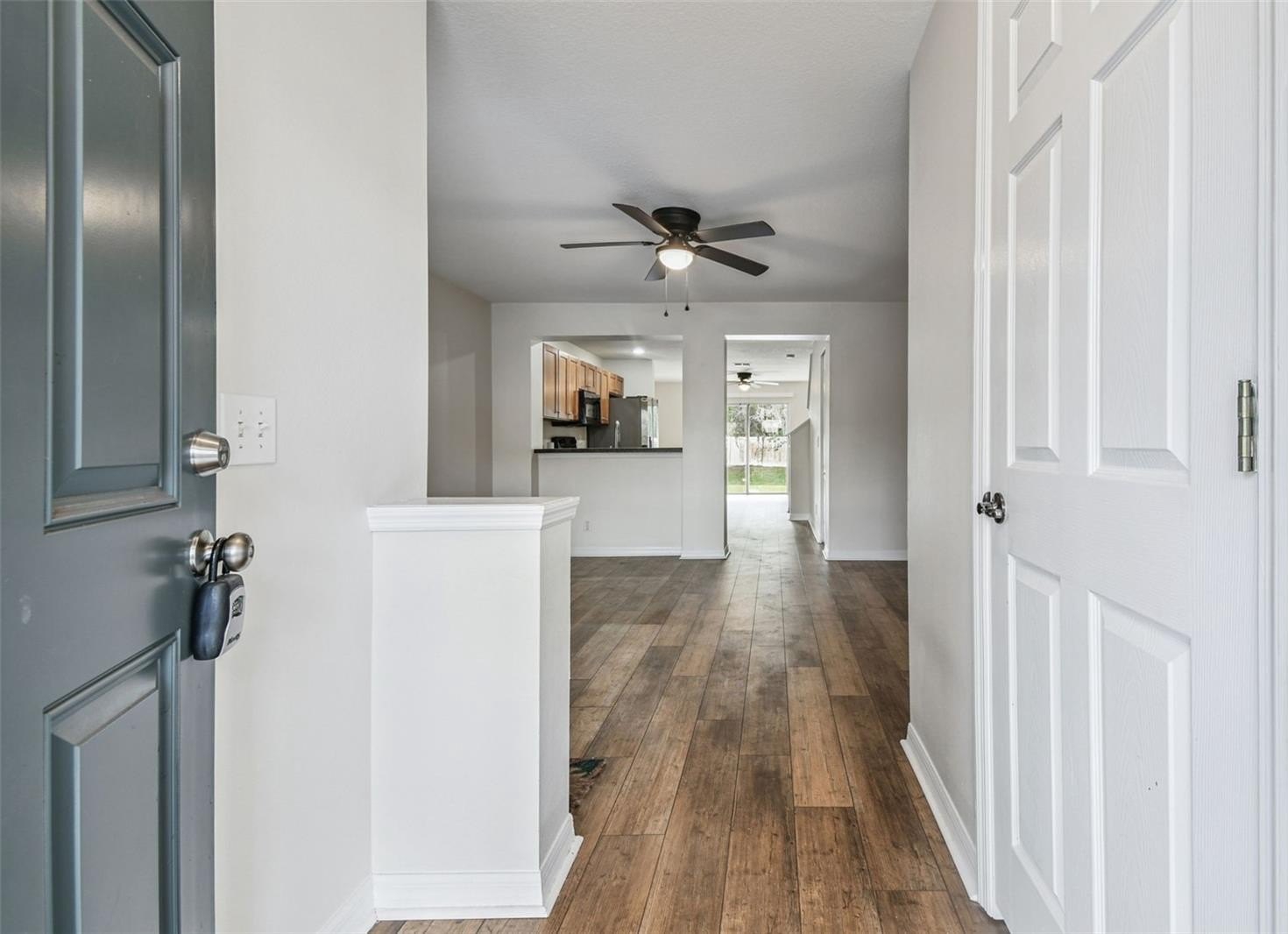 Premium Features Throughout: Elegant hardwood flooring spans both levels, solid surface countertops, primary suite features double closets for abundant storage, full bath in each bedroom with shower/tub combinations, convenient second-floor laundry room, and all appliances included—just bring your belongings!