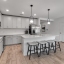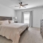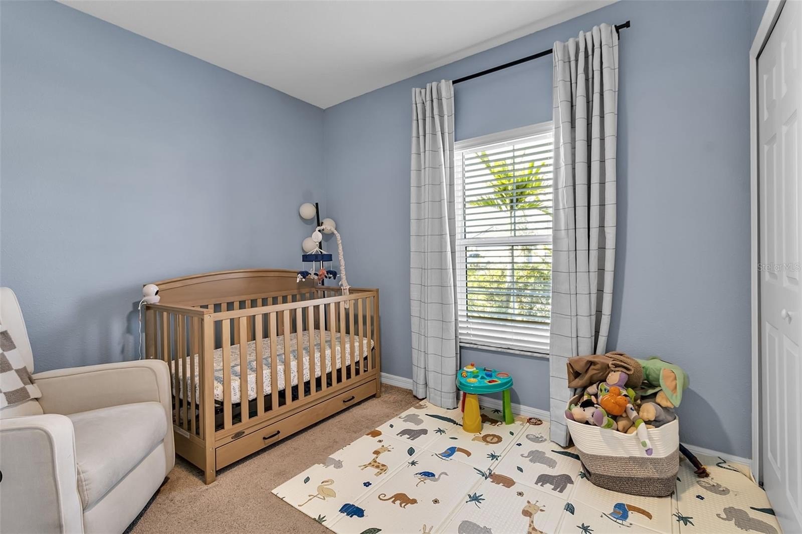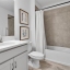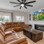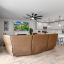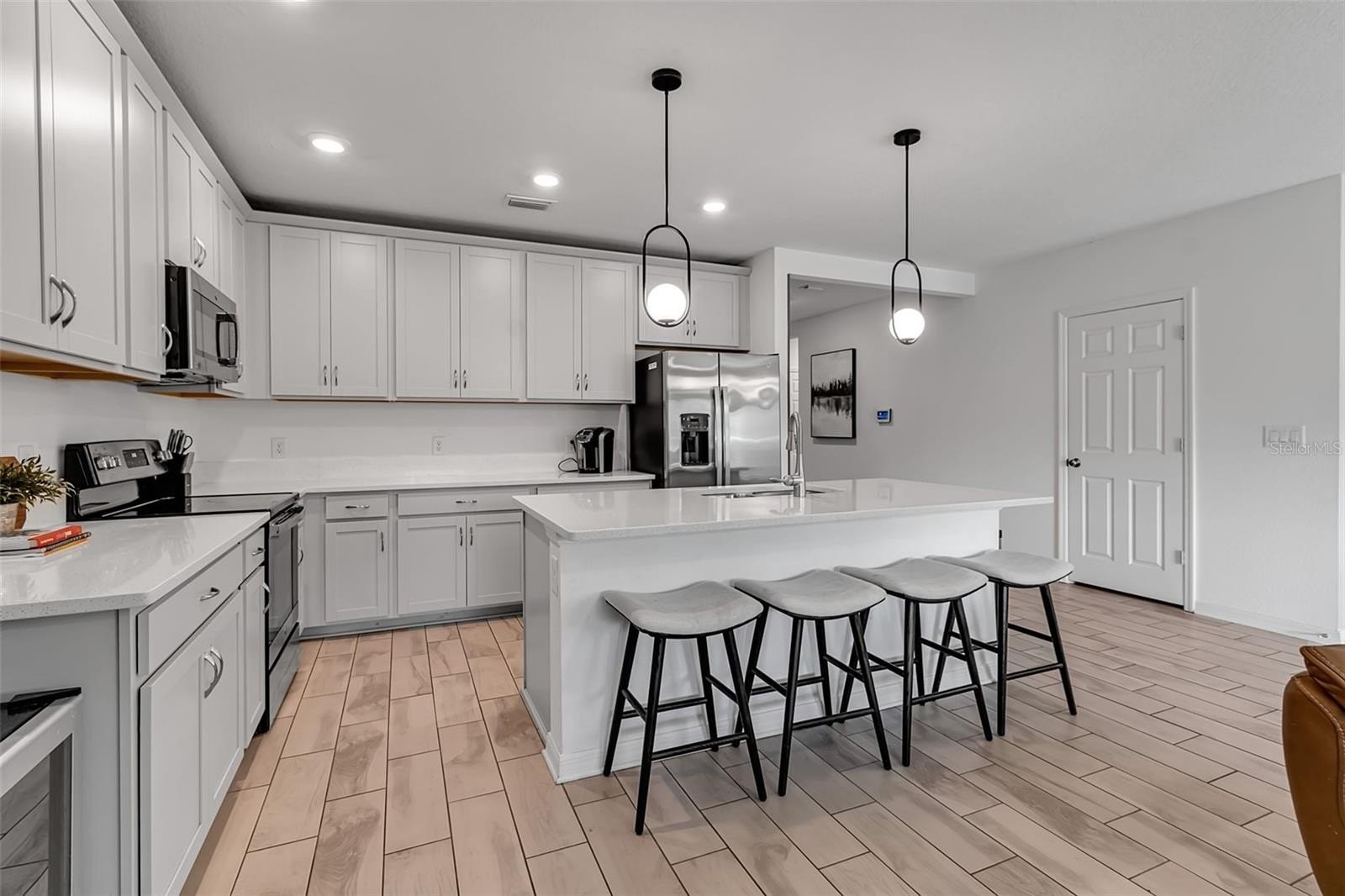 This open-concept floor plan features tile flooring throughout the main living areas, neutral finishes, and abundant natural light. The kitchen includes quartz countertops, a large center island, stainless steel appliances, and ample cabinet storage. The primary suite offers a private bath with dual sinks and a walk-in shower, along with a custom closet organizer system for enhanced storage. A guest bedroom also features a custom closet system, with additional bedrooms providing flexibility for guests, a home office, or multi-purpose needs.