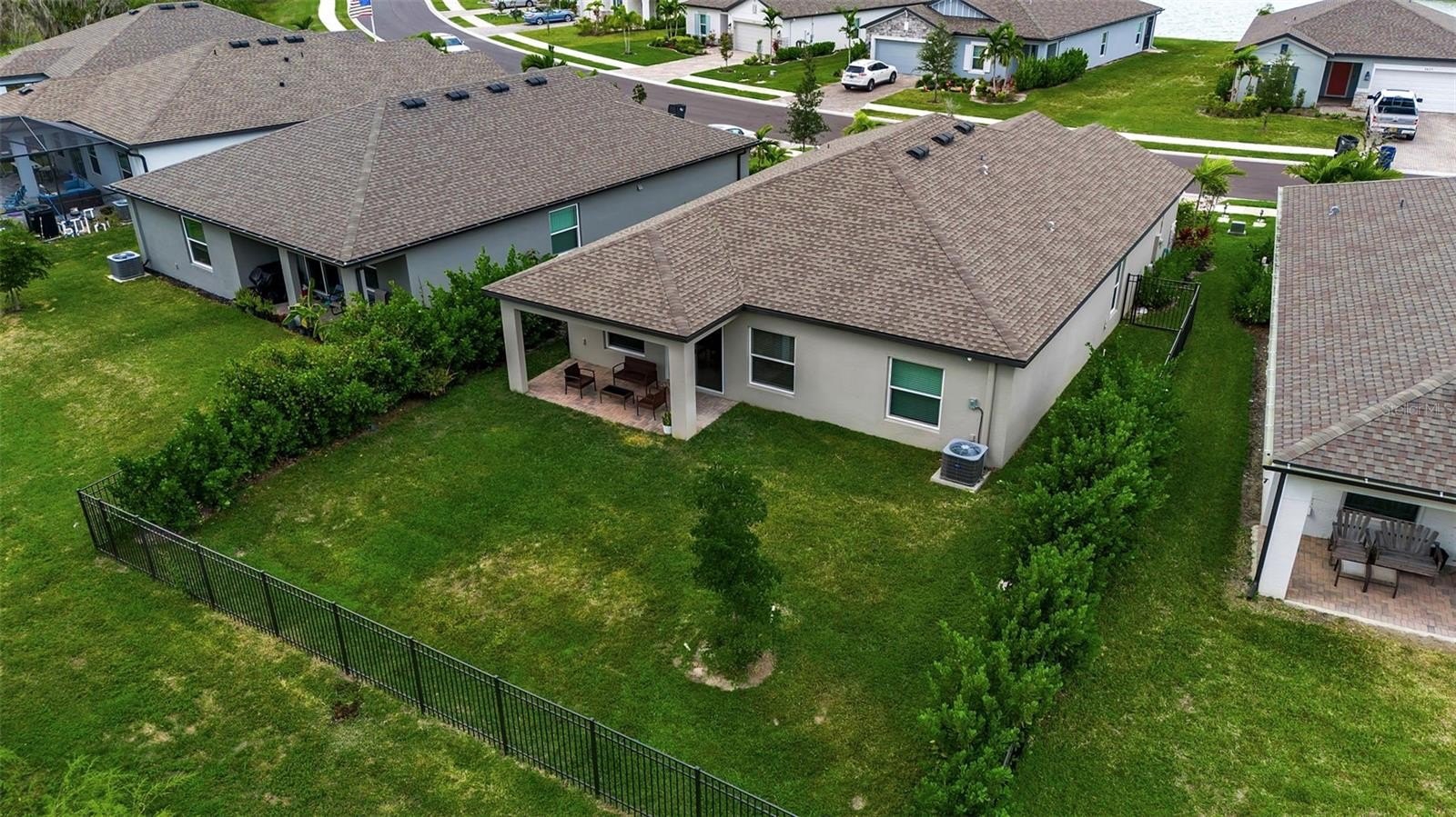 Sliding glass doors lead to a covered lanai and a fully fenced backyard backing to a natural preserve, offering increased privacy. Mature shrubs along both sides of the yard further enhance the private outdoor setting.