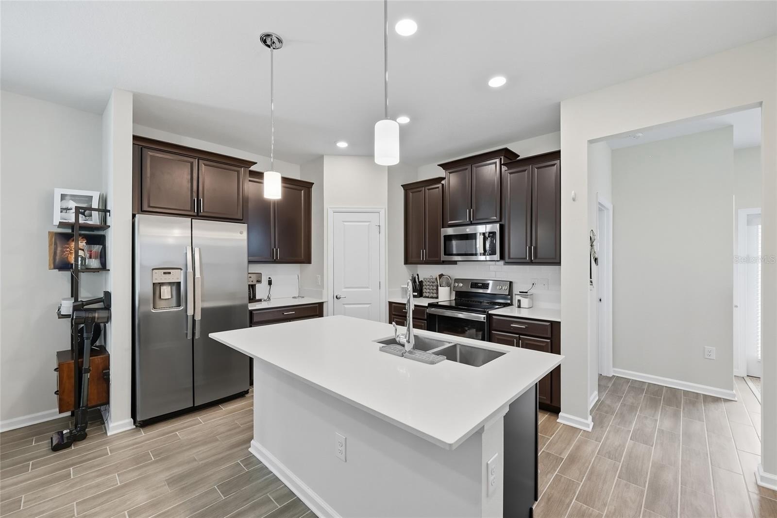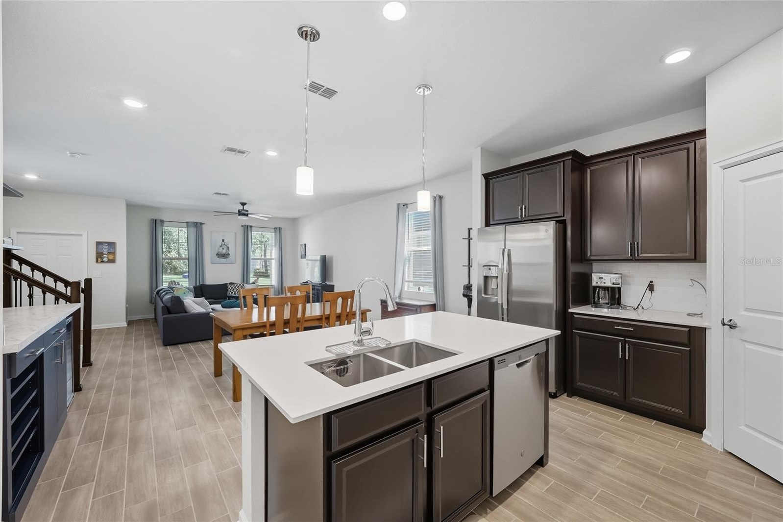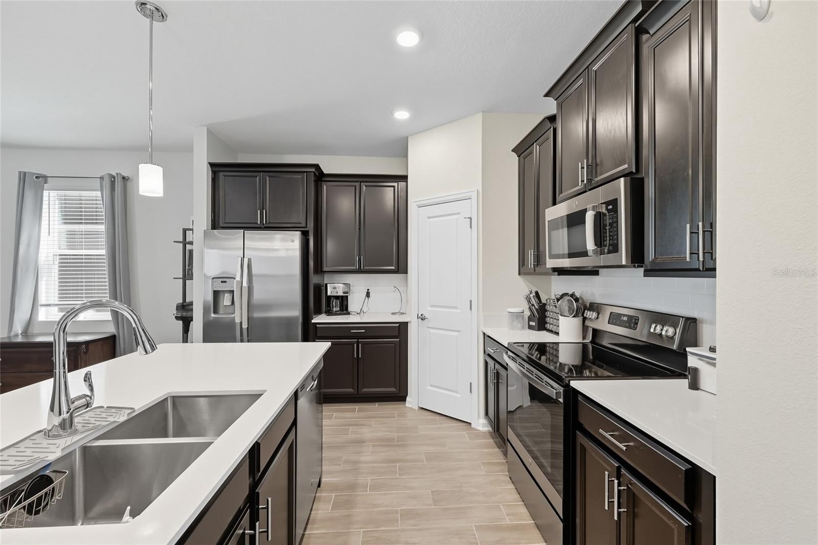 This stunning Waterside home sits on a premium lot with no rear neighbors and is loaded with thoughtful upgrades. The wide-open, beautifully designed kitchen features a closet pantry, quartz countertops, a large island, and stainless steel appliances. The main living areas are finished with tile flooring, leading into a bright and spacious great room filled with natural light.