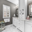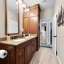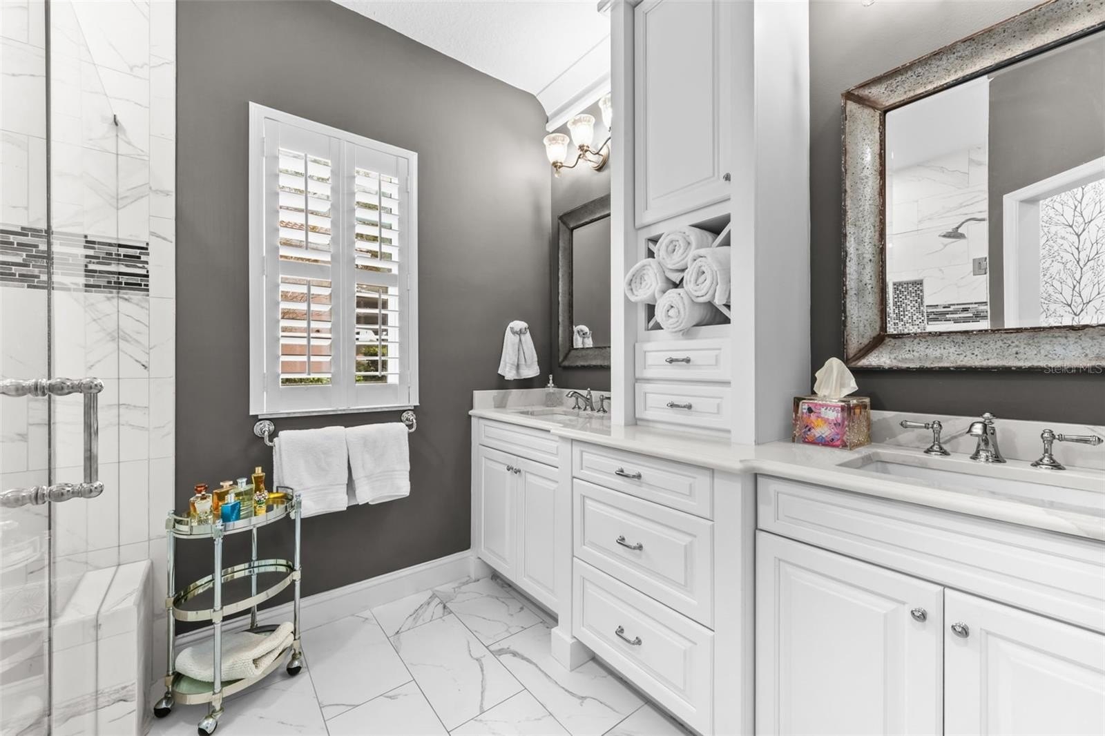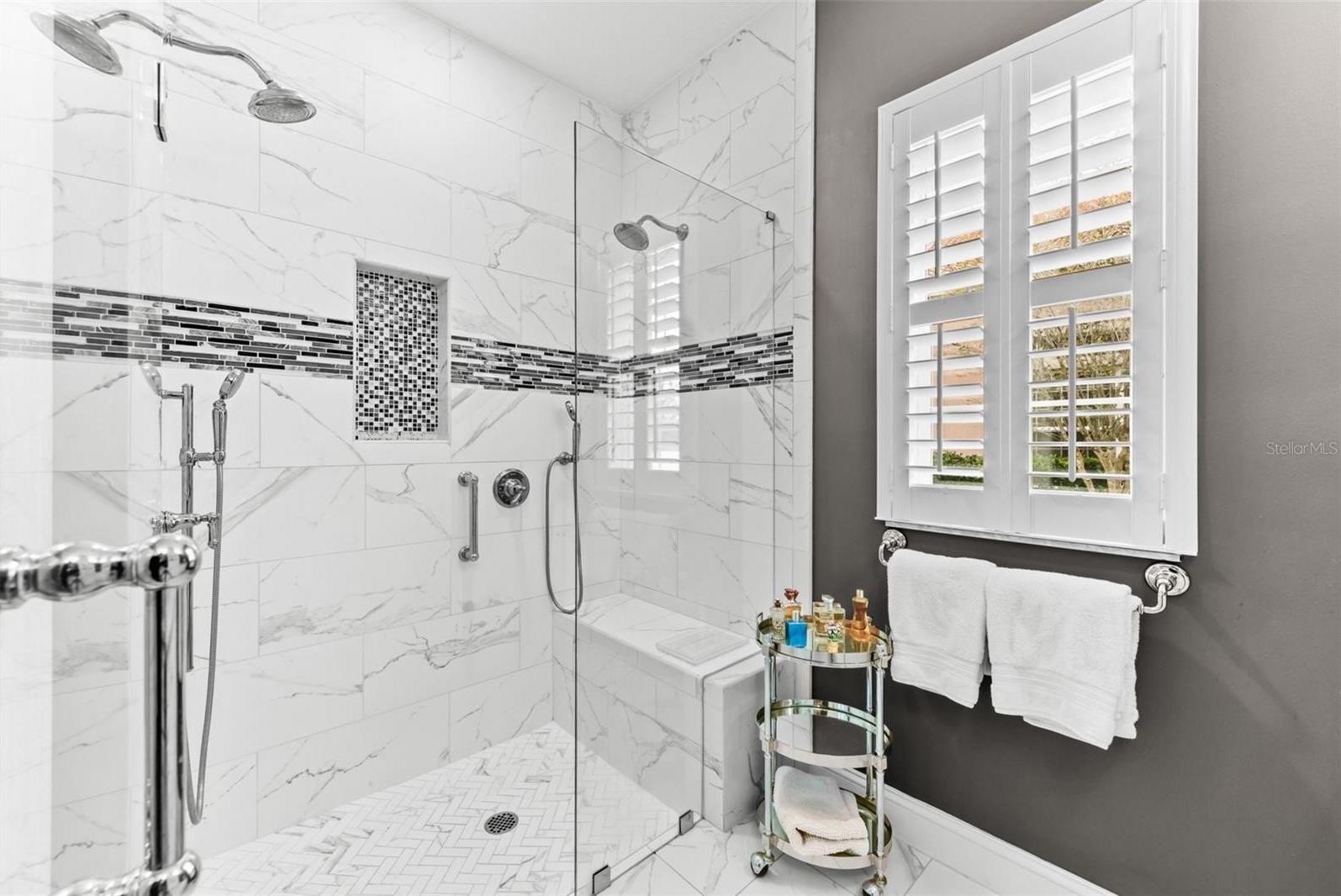 Retreat to an upgraded primary suite with a spa-quality bath: dual vanities, marble-look quartz, premium fixtures, a frameless glass shower with multiple heads/handheld and bench, and curated lighting. Secondary bedrooms are generously sized with real closets and easy access to a beautifully finished hall bath.