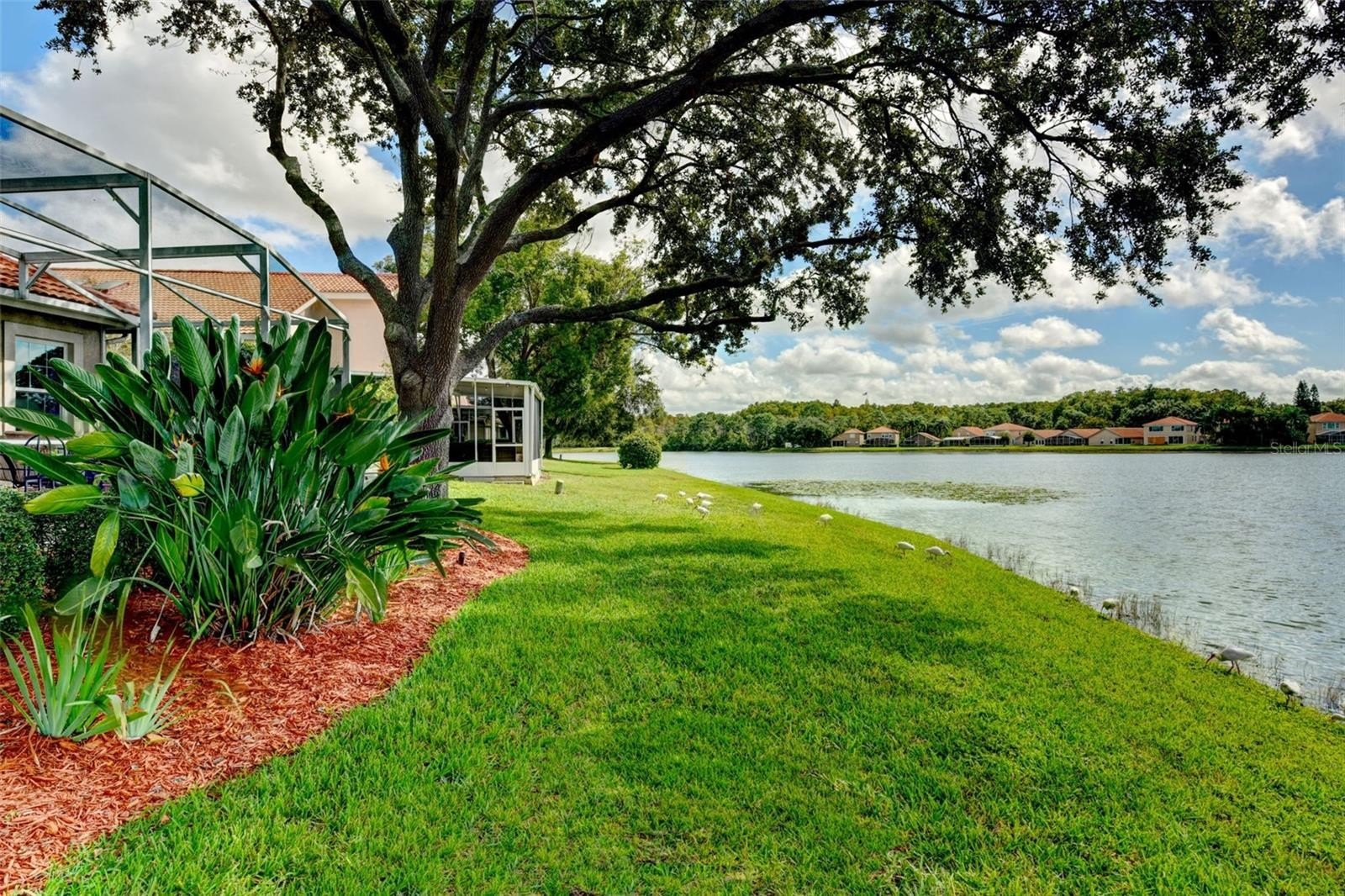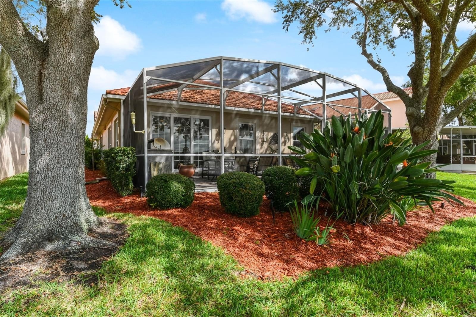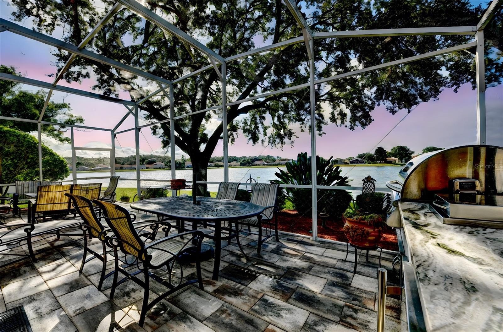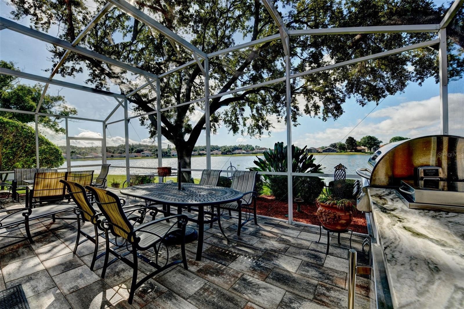Florida living shines outdoors: a 36’ × 16’ screened lanai finished in Italian-stone decking under a custom dome cage with nebula lighting creates a true second living room. The built-in Blaze grill station (grill, side burner, refrigerator) turns game day or sunset dinners into an easy habit, while mature oaks and water views add everyday serenity.