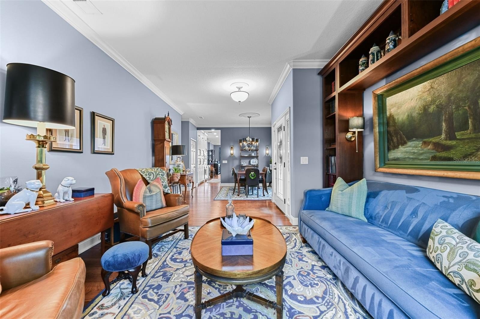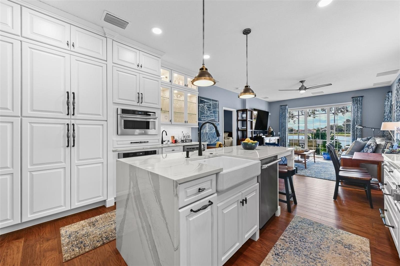 Step inside to refined, coastal-transitional styling where engineered American hickory hardwoods run through the main living spaces and natural light draws you toward the water. A welcoming front sitting room offers flexibility as an office, library, or formal conversation space, while the expanded rear family room frames tranquil pond views and adds an effortless entertaining zone complete with a wine bar and dual-zone cooler.
