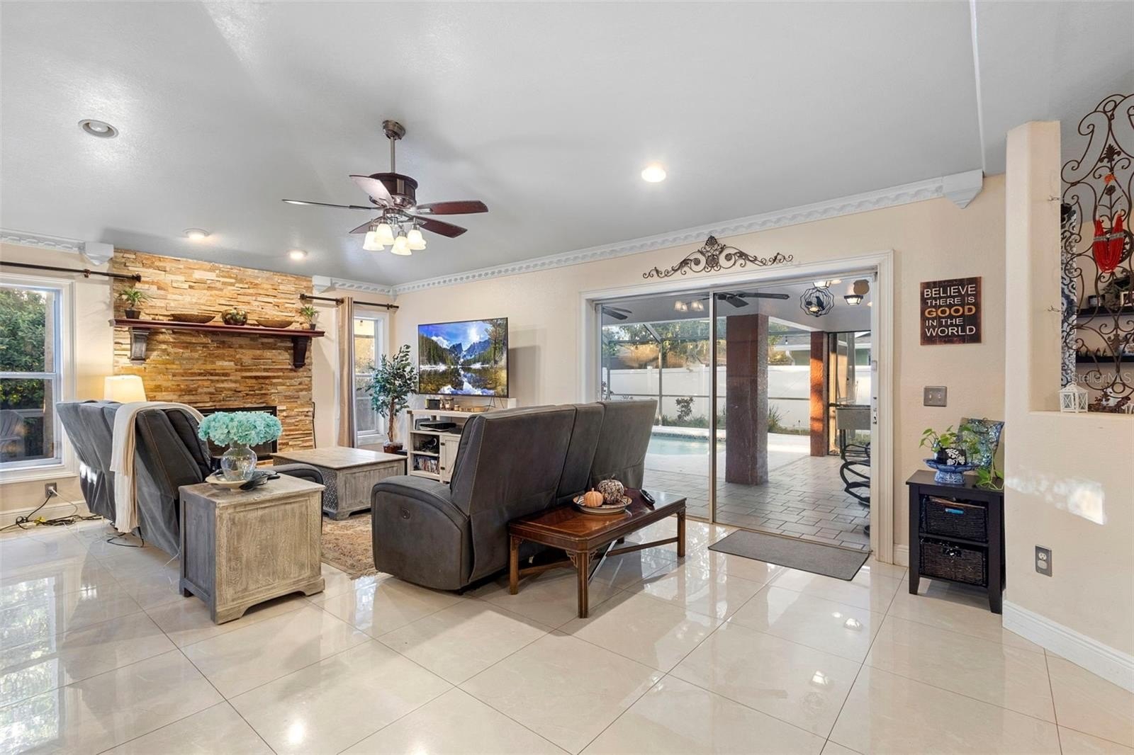 The open floor plan features generous living and dining spaces highlighted by elegant crown molding and a striking stone fireplace that creates a warm focal point for gatherings. Natural light fills the home, enhancing the spacious, connected layout.