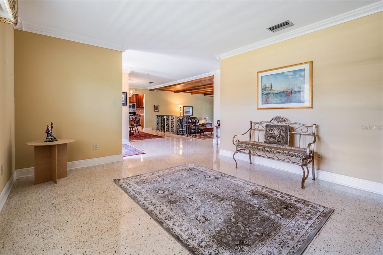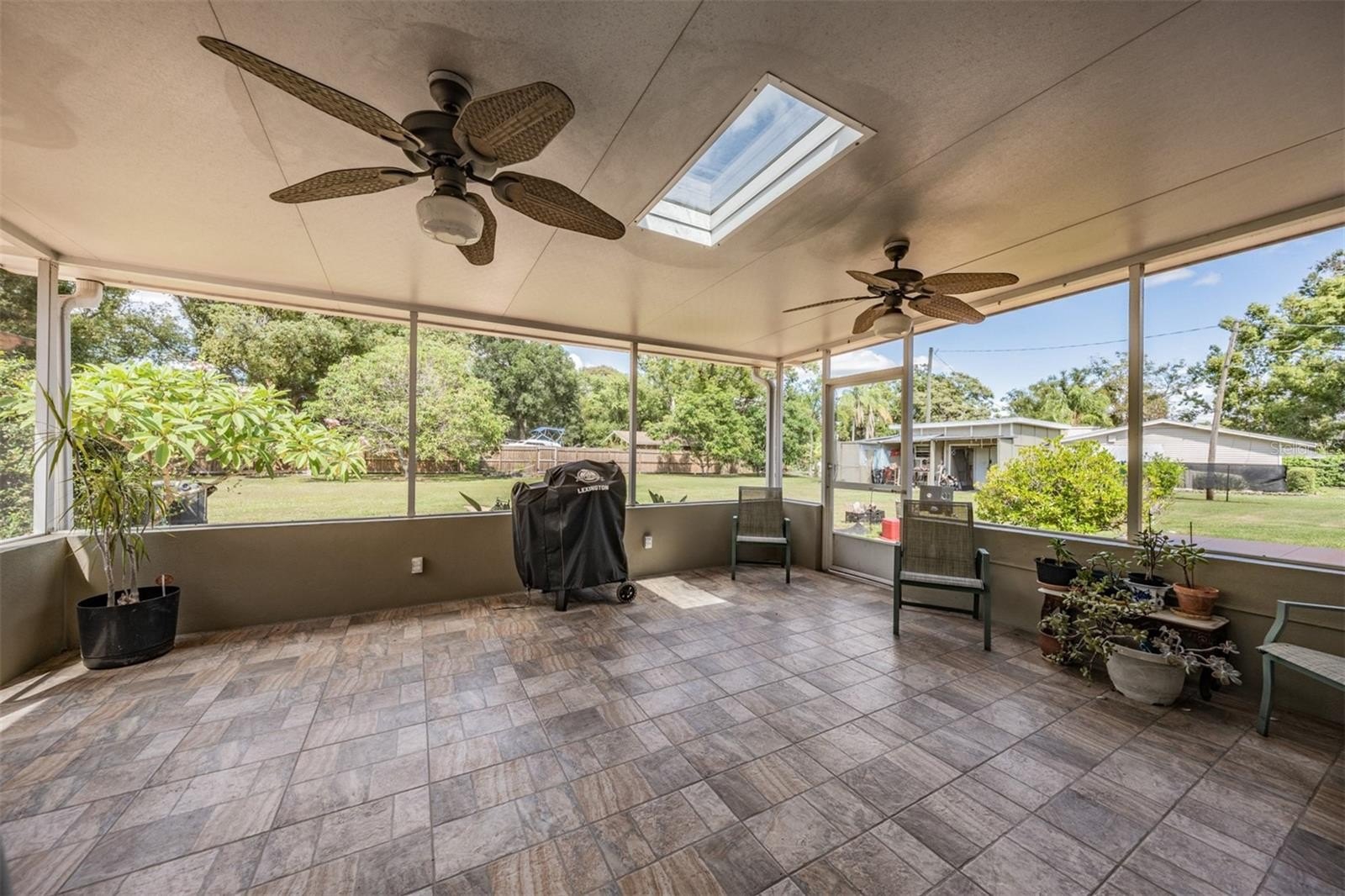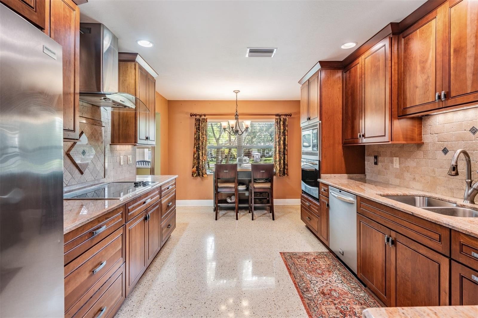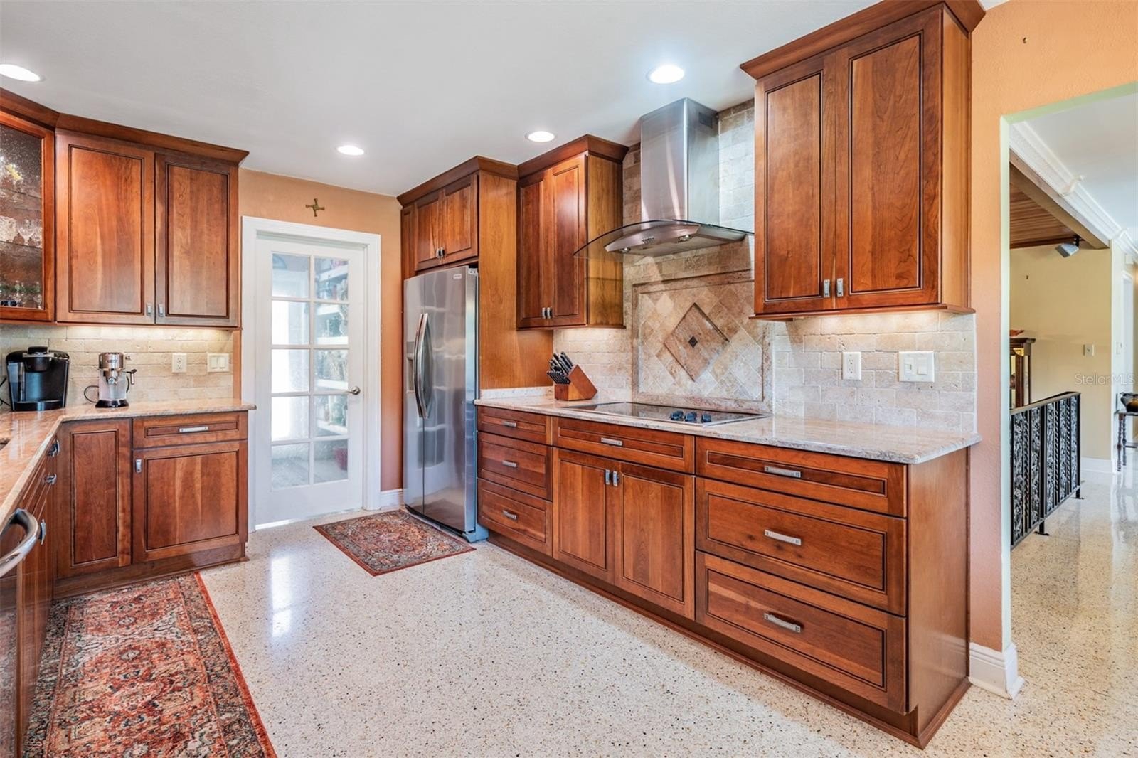 Large corner lot home in Carrollwood with No HOA! This 3 bedroom, 2 bath home sits on .70 of an acre with a large fenced yard with fruit trees and a workshop. The home features beautiful terrazzo floors, crown molding in the main living area and a well equipped kitchen designed with a home cook in mind. There is a sunken family room with wrought iron accents and a large brick wood burning fireplace with a mahogany mantel. The ceiling is beautifully finished with tongue in groove wood. The spacious kitchen features cherry wood KraftMaid cabinets with under cabinet lighting, granite countertops and a custom tumbled travertine backsplash. There is a 36” cooktop with a stainless steel and glass hood vent along with a GE profile microwave and wall oven. The laundry room has access to the garage and the backyard and has plenty of shelving and a pantry for storage. The front porch welcomes you into the foyer, formal dining room and living room which can be used as a flex space or home office. The primary bedroom has 3 closets along with sliders out to the large backyard. The secondary bedrooms are a good size and share a hall bath. There are double paned windows; hurricane shutters on all exterior sliders plus hurricane fabric for the windows and a whole house Generac generator. This home is convenient to all the Carrollwood and Tampa Bay area has to offer including restaurants, shopping and Tampa International Airport. Come see this home and make it yours today!