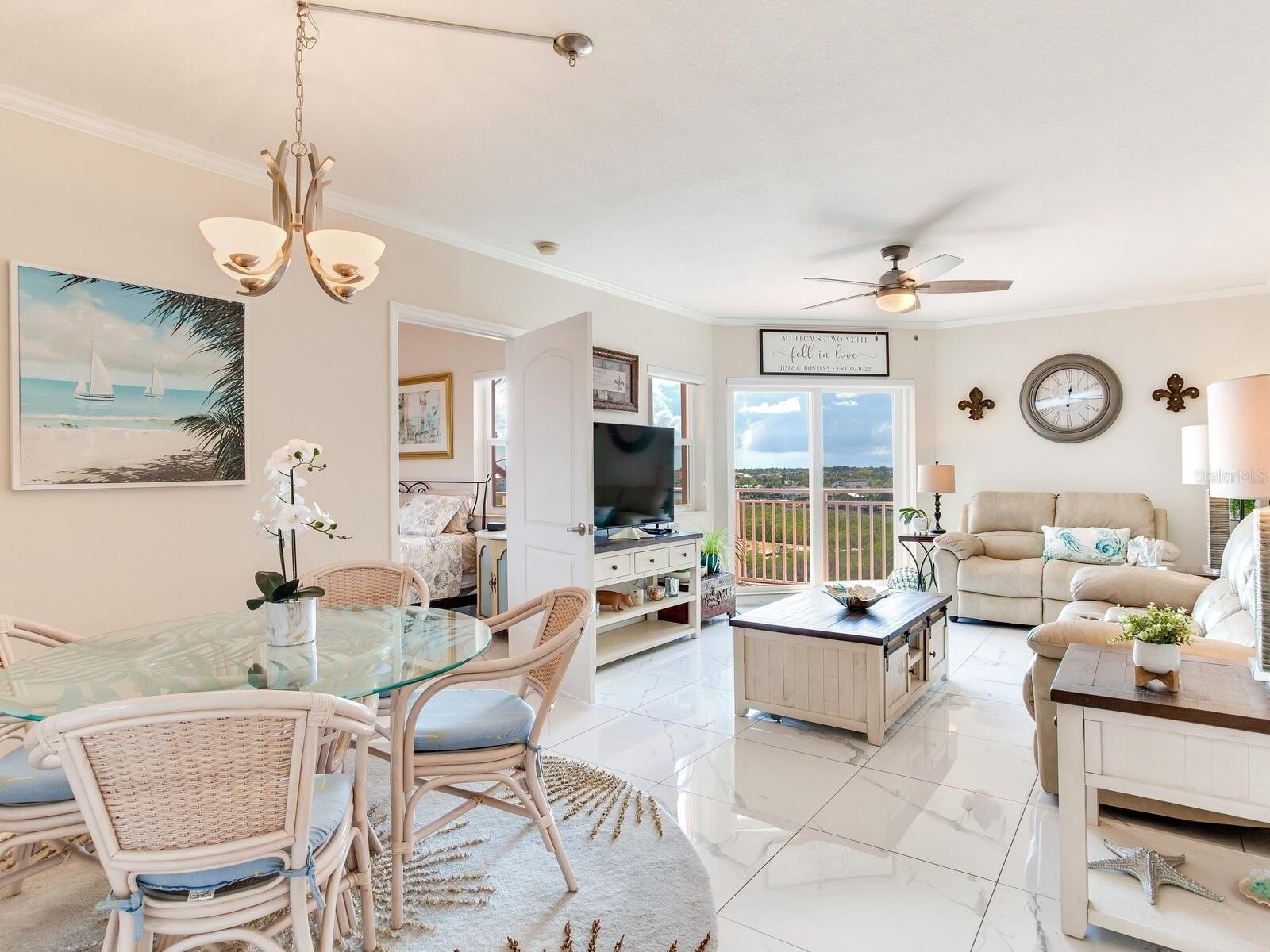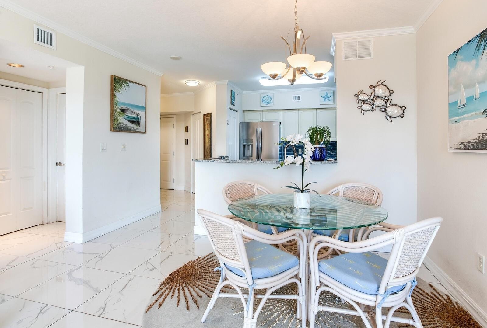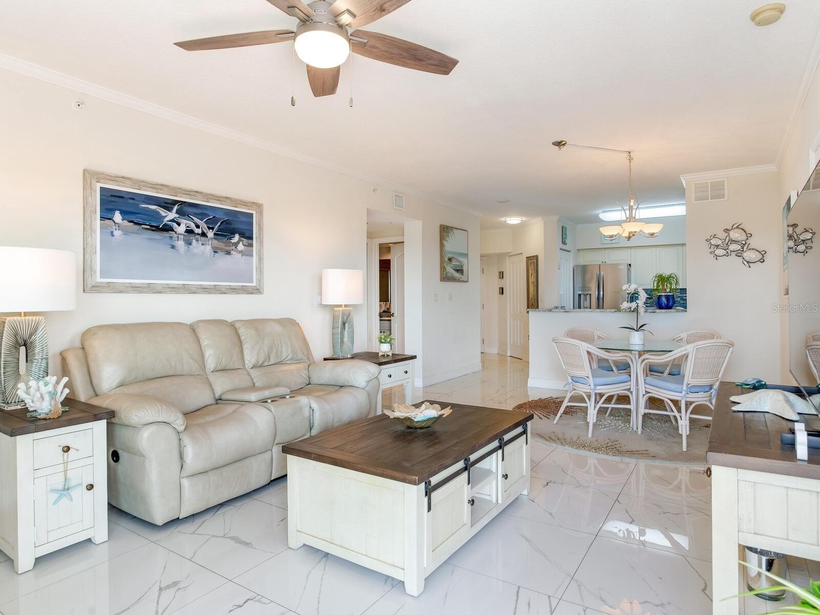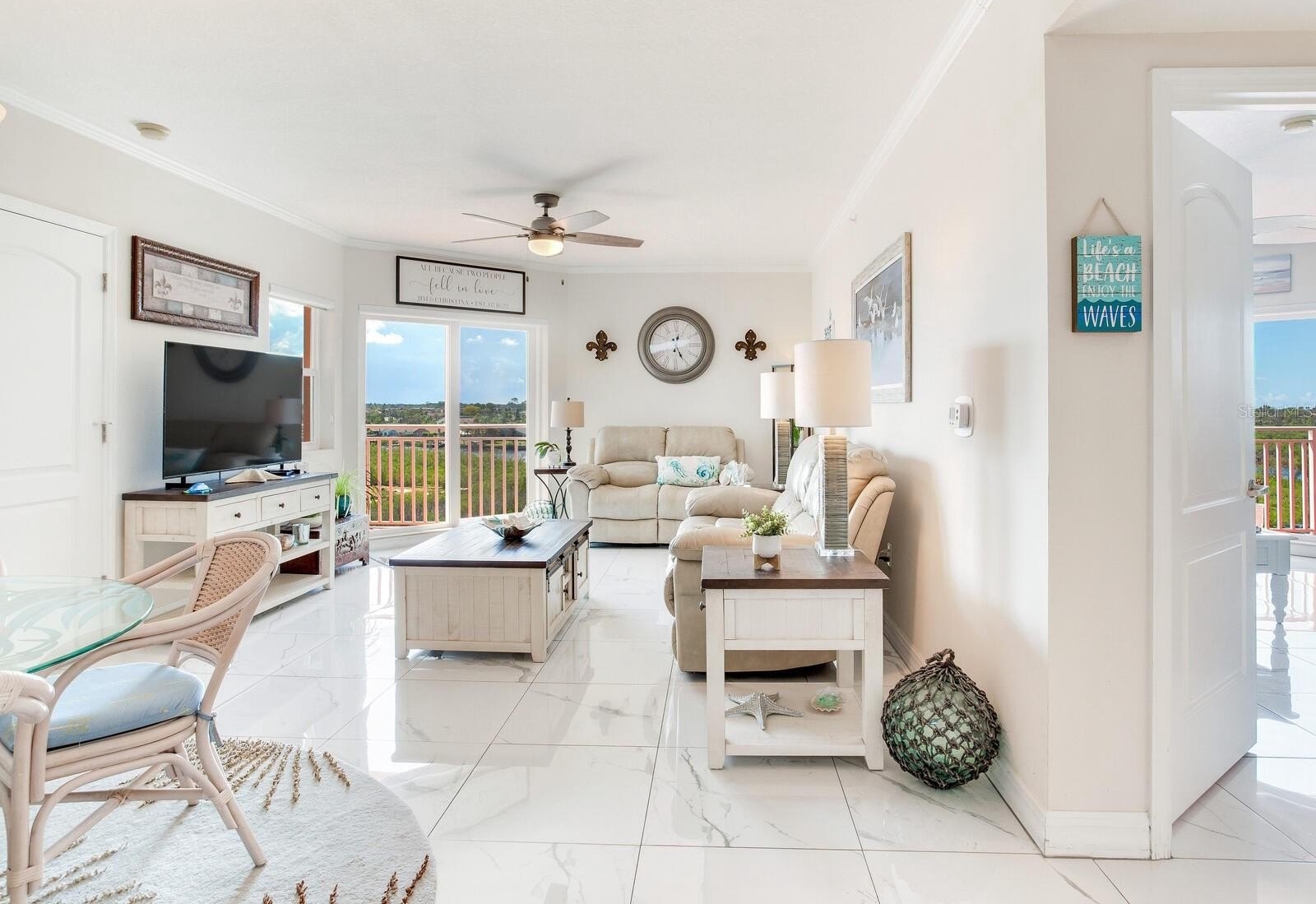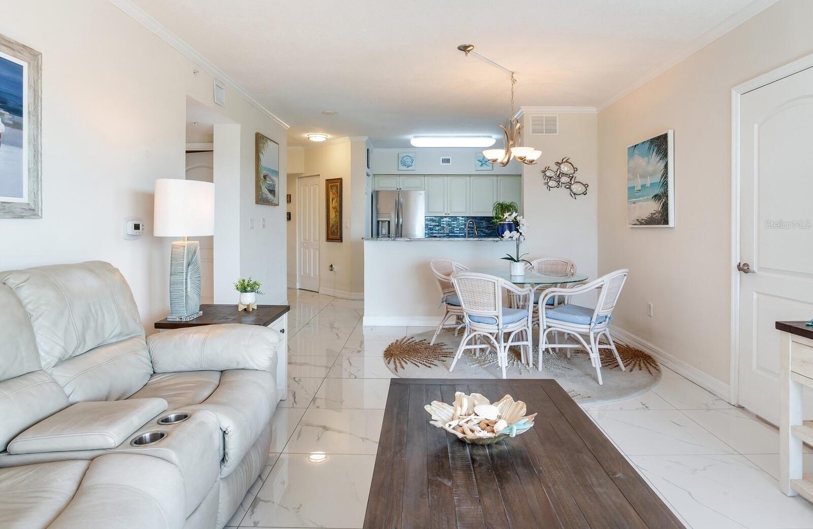 Step through grand double doors into an elegant foyer and discover a spacious, light-filled great room floor plan with beautiful new ceramic tile flooring throughout and crown molding in great room. The separate dining area and sliding glass doors lead out to one of three private balconies, creating a seamless indoor-outdoor living experience that’s perfect for entertaining or simply unwinding by the sea.