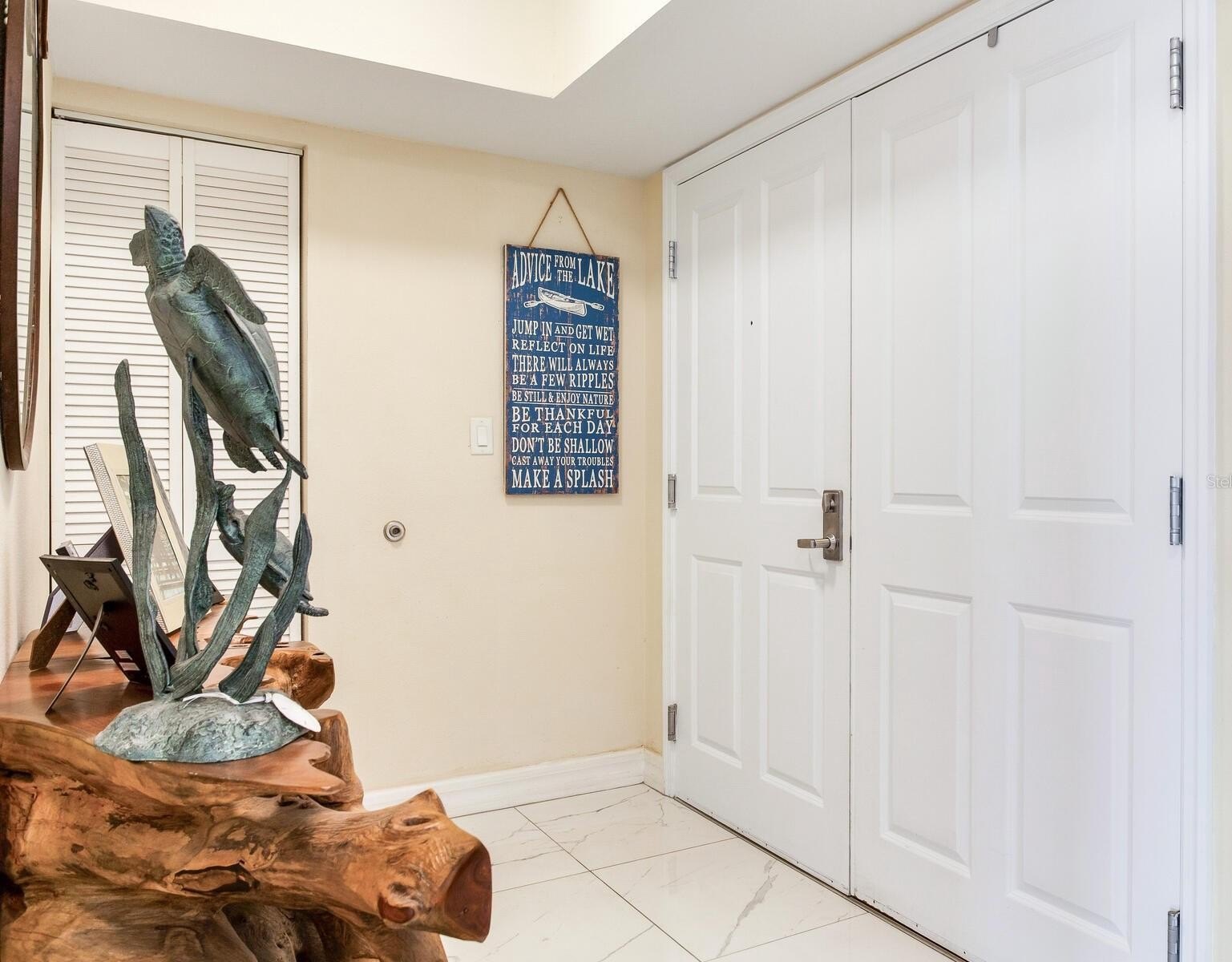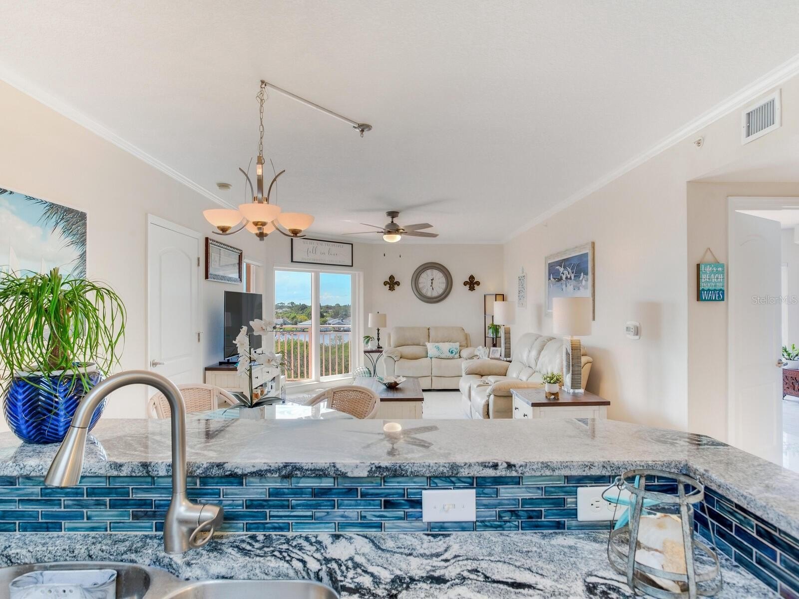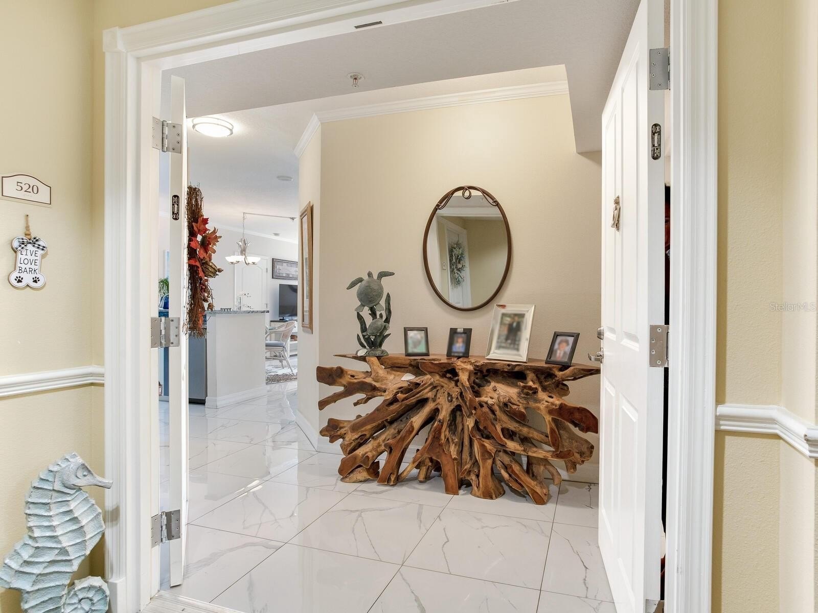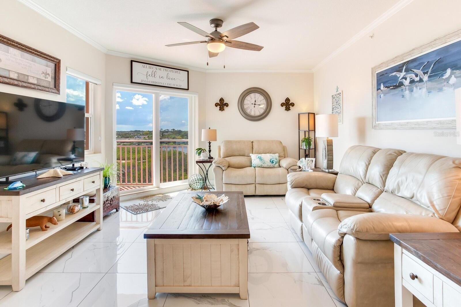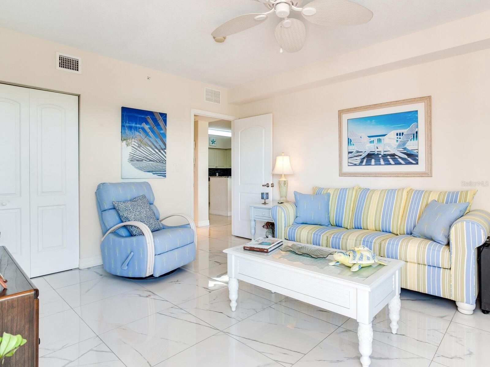 Step through grand double doors into an elegant foyer and discover a spacious, light-filled great room floor plan with beautiful new ceramic tile flooring throughout and crown molding in great room. The separate dining area and sliding glass doors lead out to one of three private balconies, creating a seamless indoor-outdoor living experience that’s perfect for entertaining or simply unwinding by the sea.