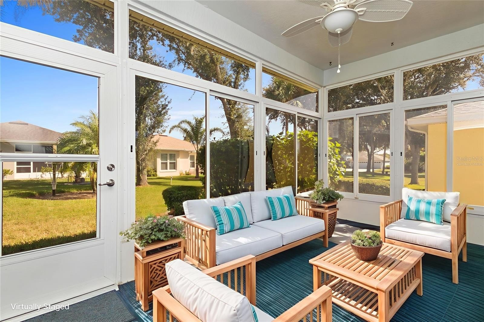 The spacious primary suite is a true retreat, complete with a walk-in closet, spa-like en-suite bath with dual vanities, soaking tub, and walk-in shower. A sliding glass door leads directly from the primary suite to the Florida room—an enclosed space with windows that provides year-round comfort and a relaxing spot to enjoy morning coffee or unwind at the end of the day.
