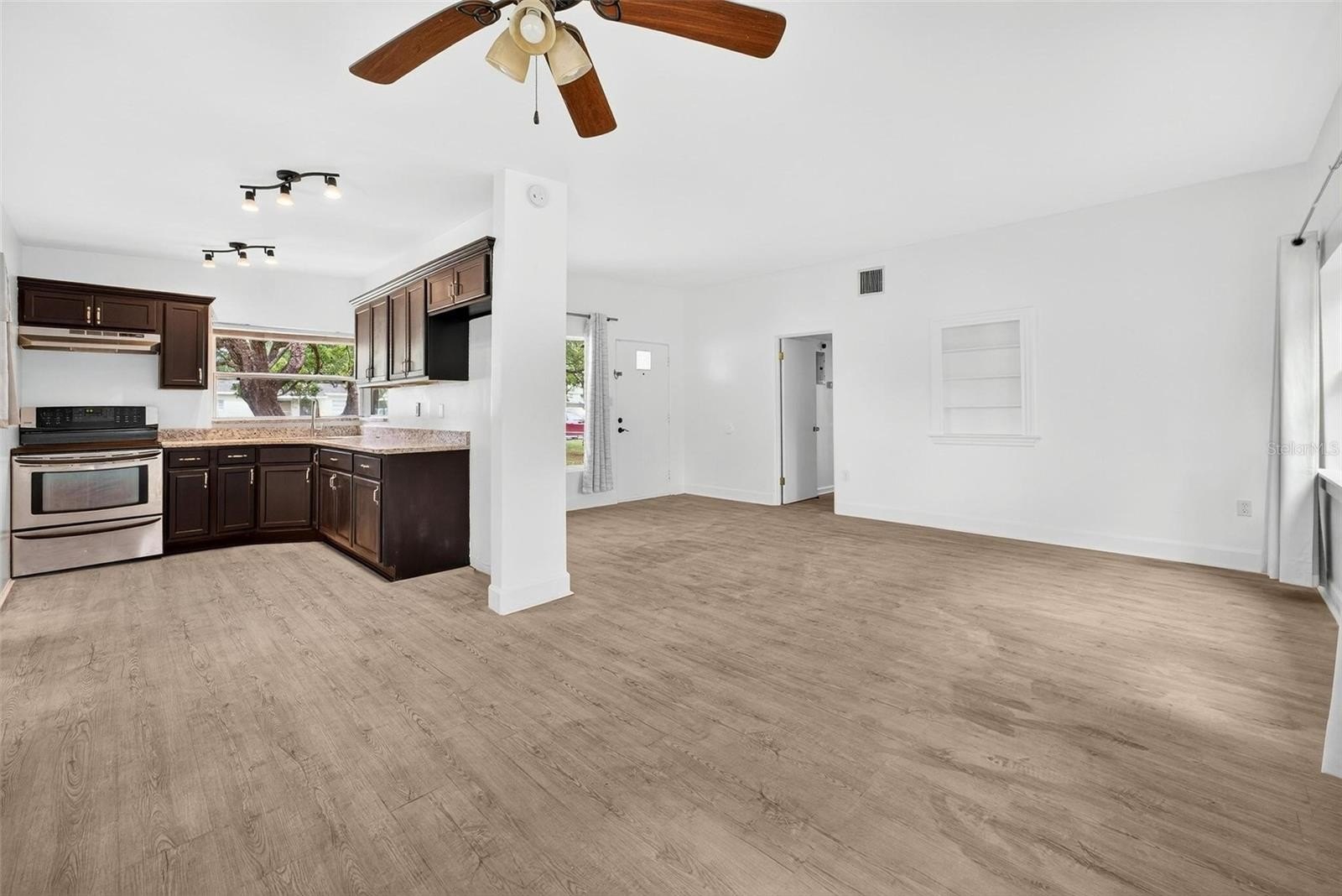 Mid-Century Modern Perfection Awaits at 613 Briarcliffe. This impeccably updated, move-in ready 3-bedroom, 1-bath residence seamlessly blends classic charm with contemporary luxury. The gourmet kitchen is a chef's delight, showcasing all-new cabinetry, elegant granite countertops, and new stainless-steel appliances. The designer-renovated bathroom offers sophisticated, modern amenities. Throughout the home, beautiful luxury vinyl flooring ensures both style and durability. The floor plan is bright and open, featuring a seamless flow from the spacious living room into the dining area and the stunning, open-concept kitchen—perfect for entertaining. Peace of mind is guaranteed with significant recent updates, including newer windows, updated electrical in 2020, a new roof in 2021, and a newer AC unit, making this home a truly complete package. Situated on a generous lot, the property boasts a fully fenced-in backyard, ideal for privacy and outdoor enjoyment. The large, covered patio provides a wonderful space for relaxation and alfresco dining, with easy access to the interior dining room and a superb view of the rear yard. Unbeatable location: 613 Briarcliffe is located just minutes from Historic Downtown Sanford's vibrant shops and acclaimed restaurants, offering easy access to both I-4 and the 417 for a convenient commute and quick access to all area amenities