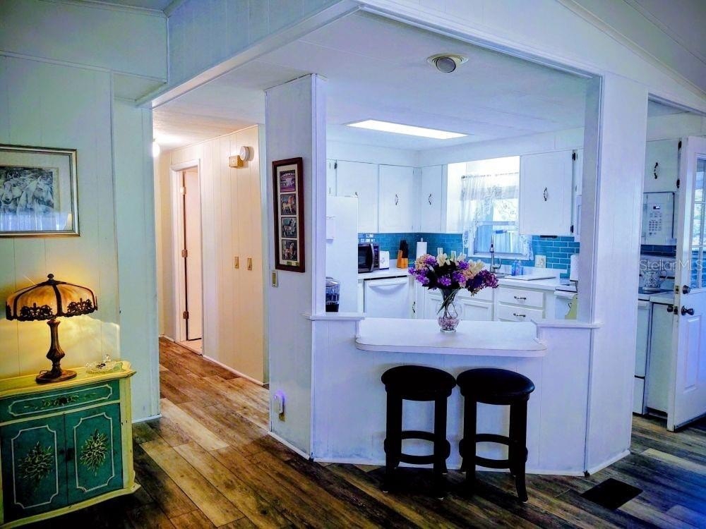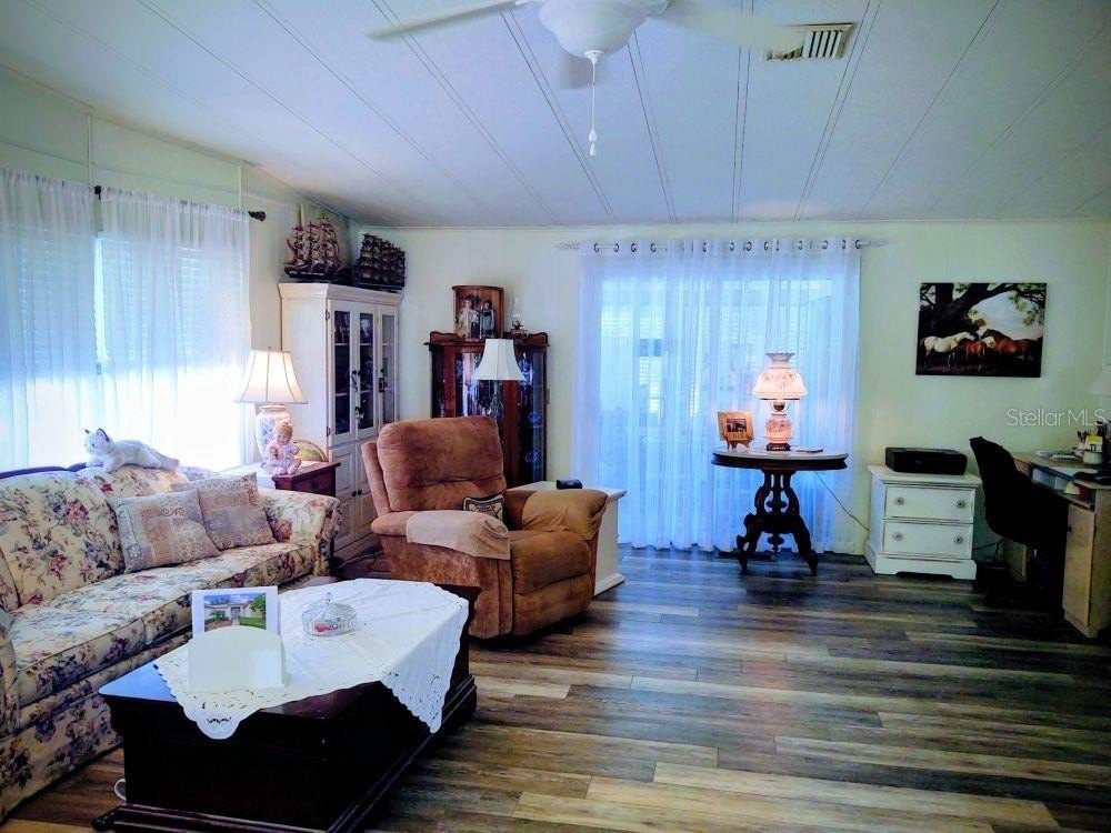NEW LISTING!! 2 Bedroom 2 Bath manufactured home in Zellwood Station. Lots of updates in the last year, Entrance has new storm/screen door, and sliding door to Bonus Room is new. Quartz countertops in kitchen with sea glass back splash. New GE Microwave over stove and newer dishwasher. Indoor laundry with new stackable washer dryer! Both baths have walk in showers. Primary bath has new vanity, sink and faucets, new flooring, linen closet, louvered doors. Vinyl plank flooring in kitchen, dining, living and sunroom. Metal roof. This home is MOVE IN READY, just waiting for YOU! Zellwood Station is a Resident Owned 55+ Golfing Community located between Apopka and Mt Dora. We have a 72 Par golf course, 4 pools, pickleball and tennis courts; water exercise and line dancing classes and our own Whistle Stop Restaurant and Lounge with banquet facilities. There is always something to do here. Close to the 429 for easy access to airports and attractions, we are close to shopping, restaurants, medical facilities and churches. Come and see what we have to offer!