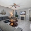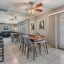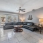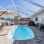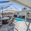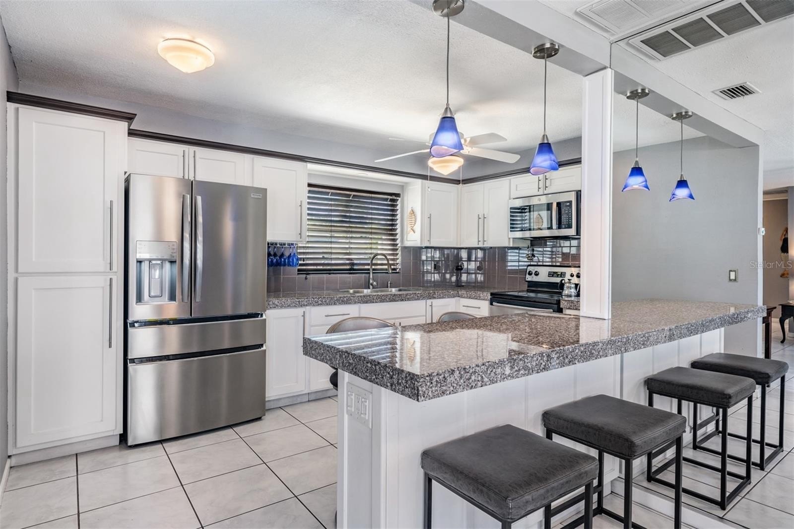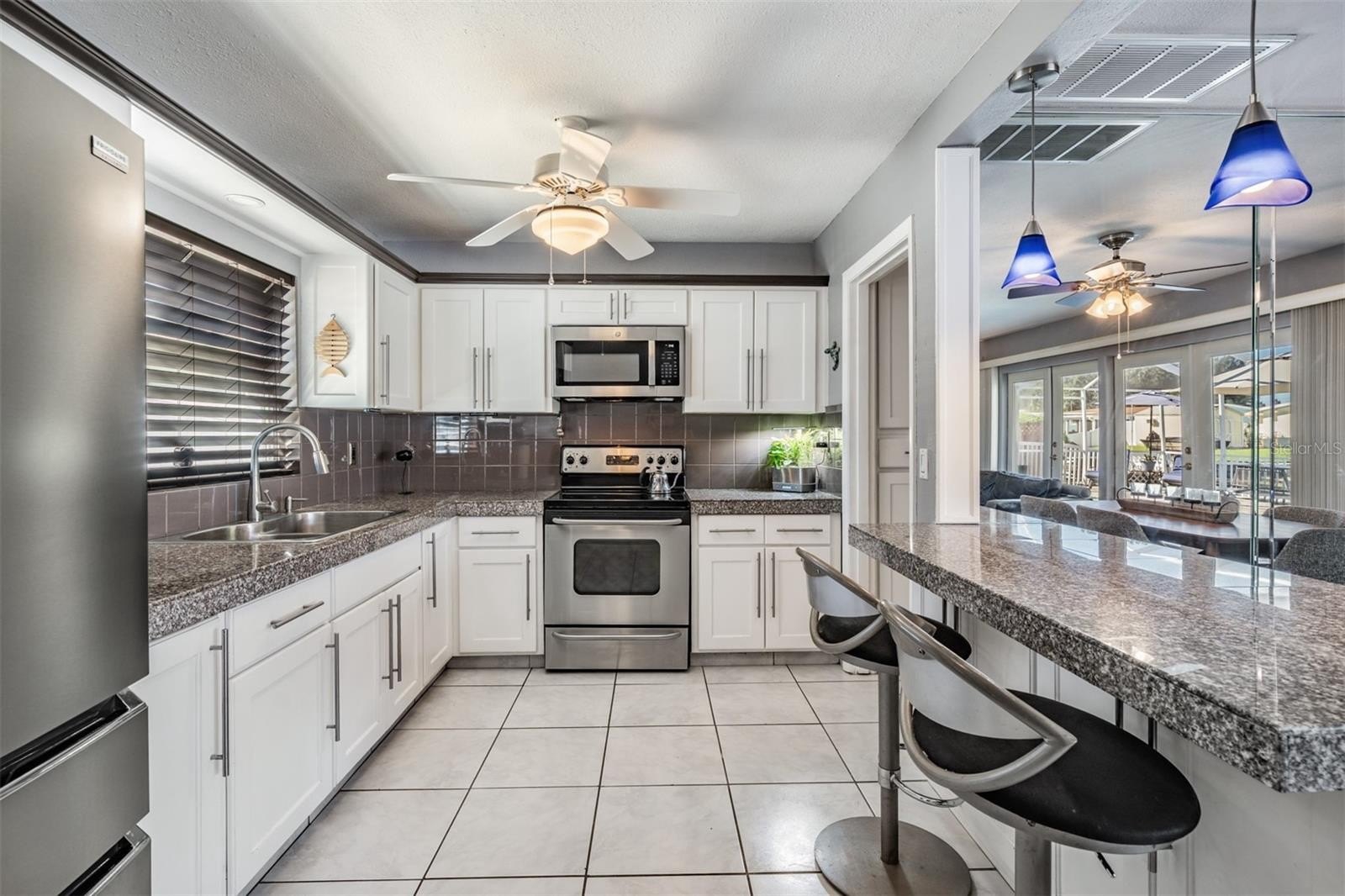 The updated kitchen features white raised-panel wood cabinetry, granite tile countertops, and stainless-steel appliances, with a breakfast bar opening to the dining and living areas—ideal for entertaining. A wall of French doors floods the living space with natural light and leads to the screened pool area, which includes a large covered lanai for shaded relaxation.