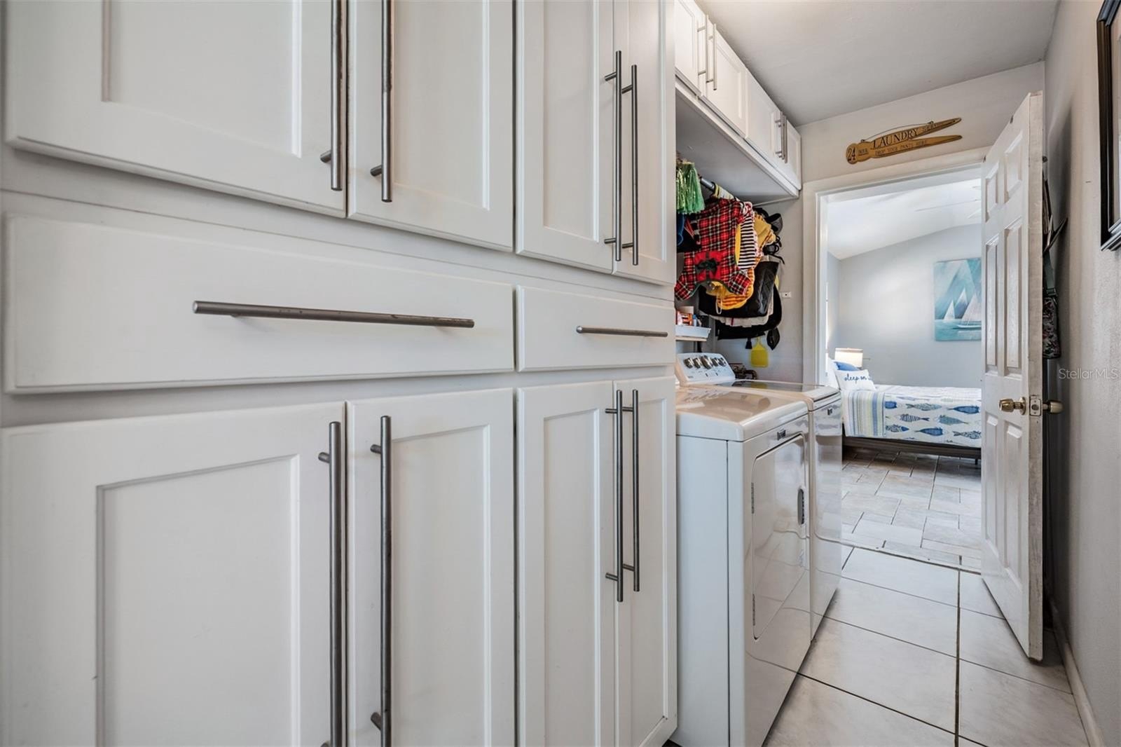 The split-bedroom layout offers privacy, with the primary suite featuring an ensuite bath and large double closet. The second bedroom also includes a double closet, while the hallway provides multiple storage options including two closets and a linen closet. Just off the kitchen is a convenient laundry room with additional cabinetry. A **versatile third room—perfect for an office, den, or bedroom—**has French doors to the pool area and its own side entry door.