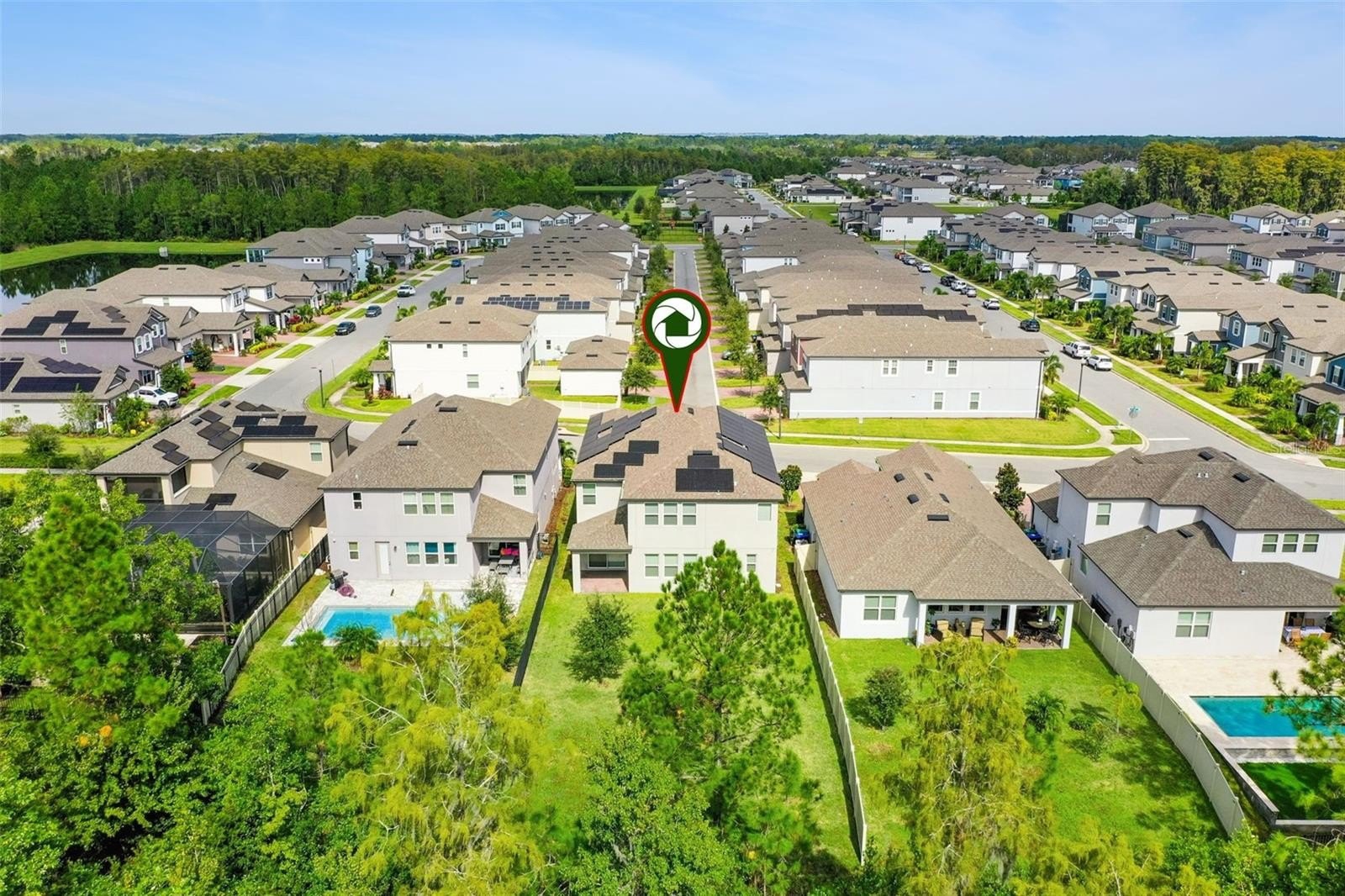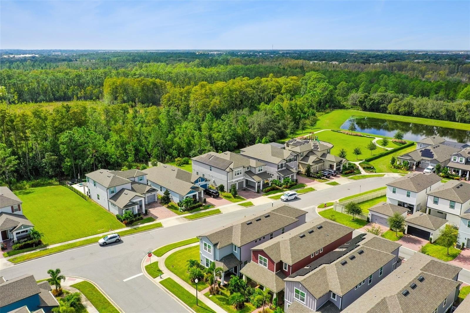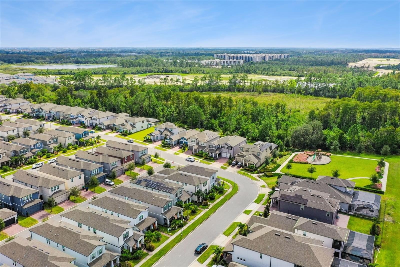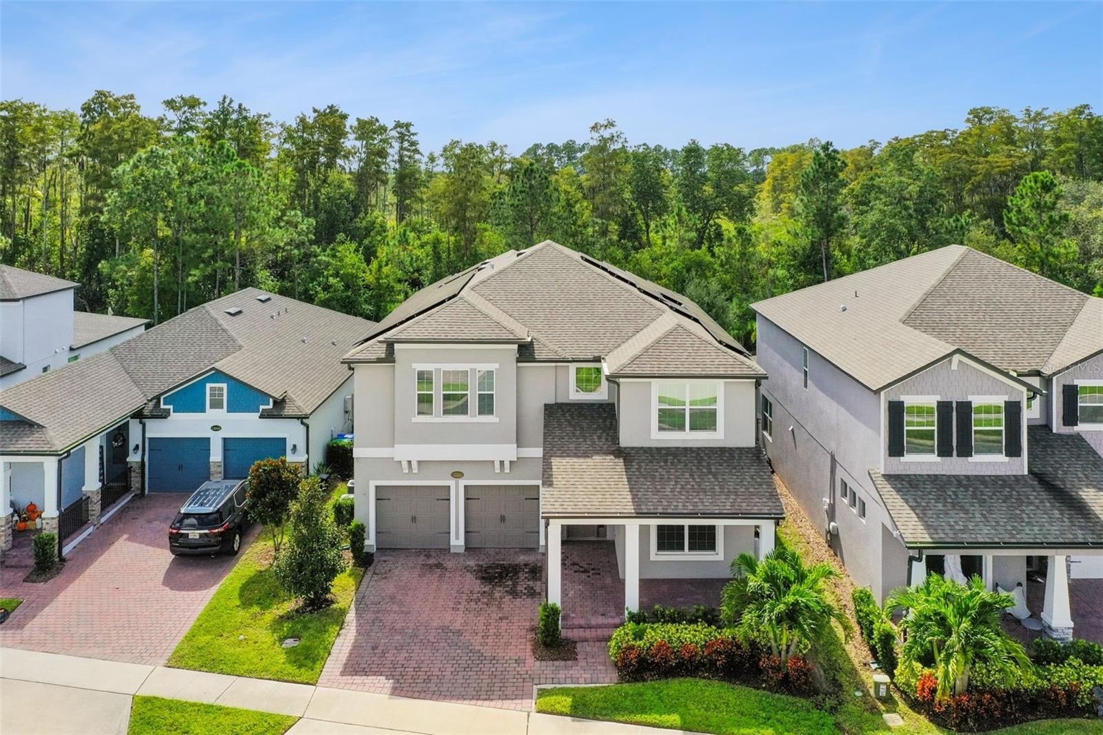 Welcome to this nearly new and lovely 5-bedroom, 4-bath home in the sought-after community of Encore at Ovation in the heart of Winter Garden/Horizon West. One of the neighborhood’s most popular floor plans, this home impresses with its smart layout and thoughtful design to suit any family. From the beautiful entryway and tall ceilings to the open, spacious kitchen, every detail feels elevated. The gourmet kitchen features dark-toned cabinetry, granite countertops, and a stunning textured backsplash that extends to the ceiling behind the stainless vent hood—adding both depth and flair. A cozy breakfast nook sits just off the kitchen, with additional seating at the oversized island, perfect for casual meals or entertaining. The large family room showcases expansive windows framing a private view—no rear neighbors and an exceptionally deep lot backing to serene natural scenery, a rare find in this area. Step outside to the covered lanai, perfect for relaxing or dining al fresco while enjoying the peaceful backdrop. This floorplan offers a first-floor bedroom (or office), a full bath and a separate exterior door offers ideal flexibility and easy outdoor access, great for a future pool or backyard oasis. Upstairs, enjoy a spacious bonus room with LVP flooring, additional guest or secondary bedrooms, and a huge primary suite with stylish, upgraded finishes throughout. The home is just a few houses away from a playground and green space, and residents also enjoy fantastic community amenities including a pool, fitness center, dog park, and more. Best of all, you’re only 3 miles from Flamingo Crossings—a vibrant retail and dining destination—and less than 5 minutes from the iconic Disney World arch. Experience modern living, beautiful design, and an unbeatable location all in one!