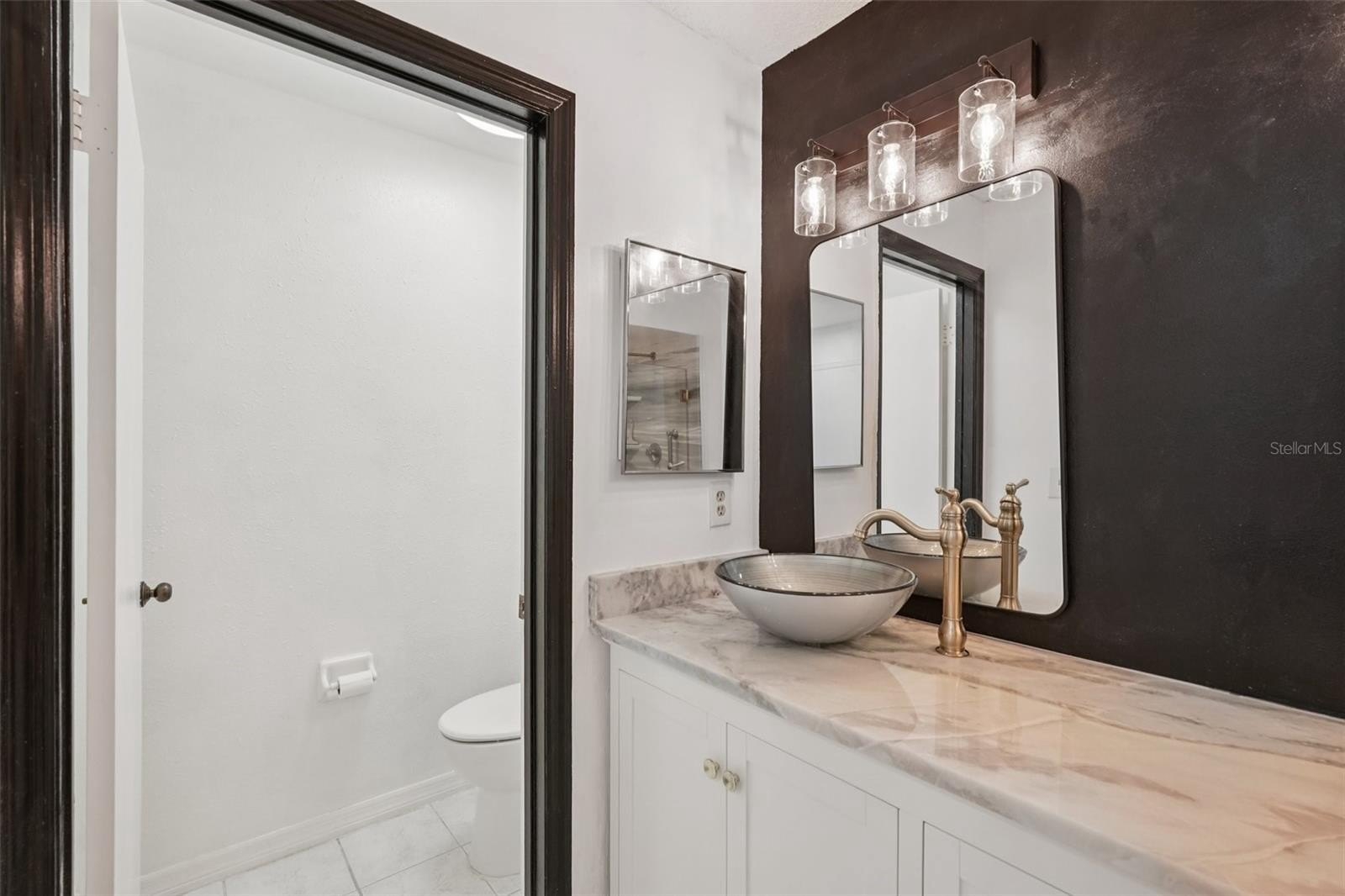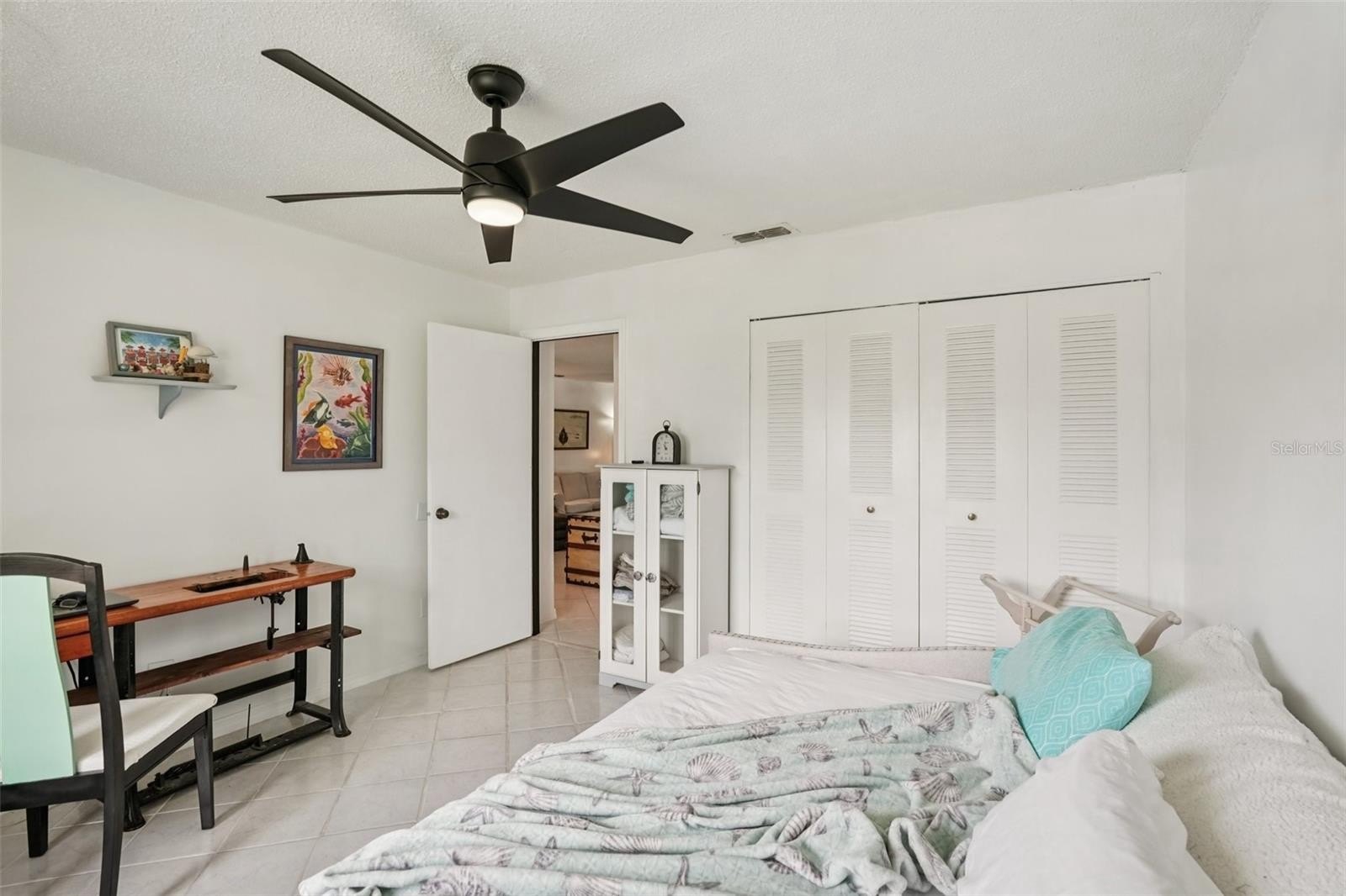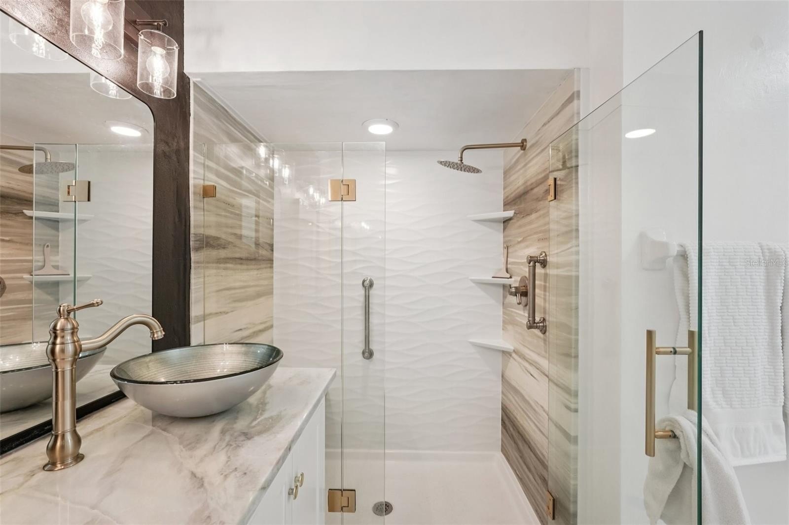 The kitchen offers stone countertops, plenty of cabinet space, and access to the bright Florida room—perfect for relaxing or hosting guests. The primary suite features laminate flooring, large windows, and a stunning 2025-renovated en suite with a walk-in glass shower, elegant tile, stone countertops, and double vessel sinks. The second bedroom is generously sized and located near the updated guest bath.