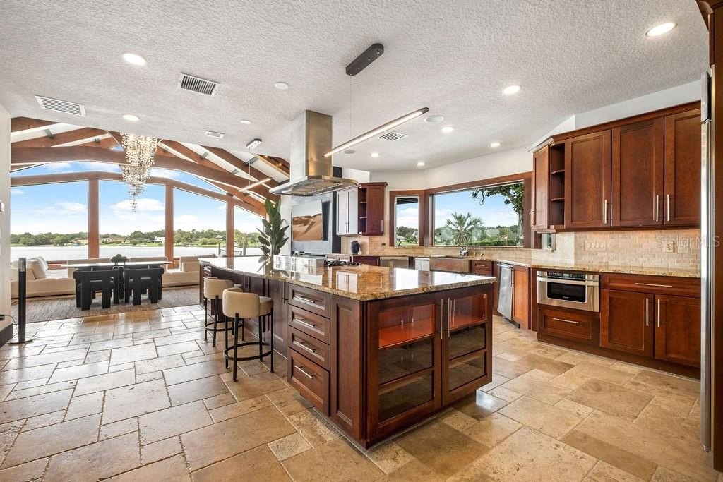 Step through custom metal doors with glass inlays into a grand entry crowned with a wood-barrel ceiling. The formal living room frames breathtaking views of the pool and lake, while high-end craftsmanship shines throughout—from the stone-arch kitchen with a 15-foot island and glass wine wall to the great room’s 33-foot glass wall, soaring 17-foot wood-beamed ceilings, and elegant gas fireplace.
