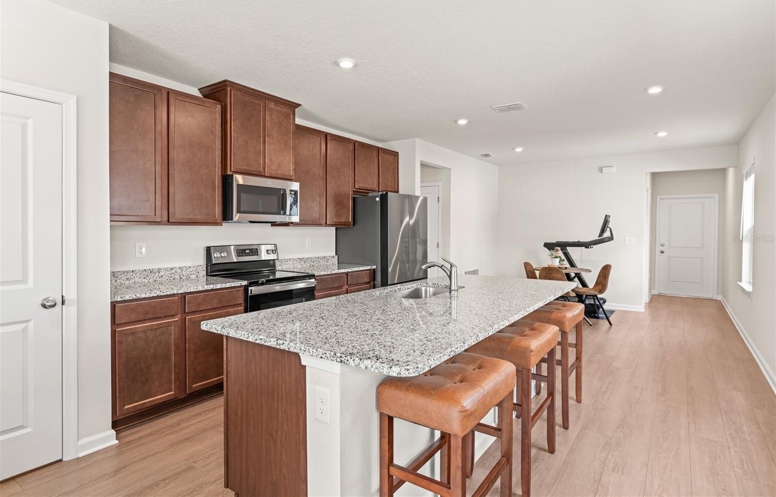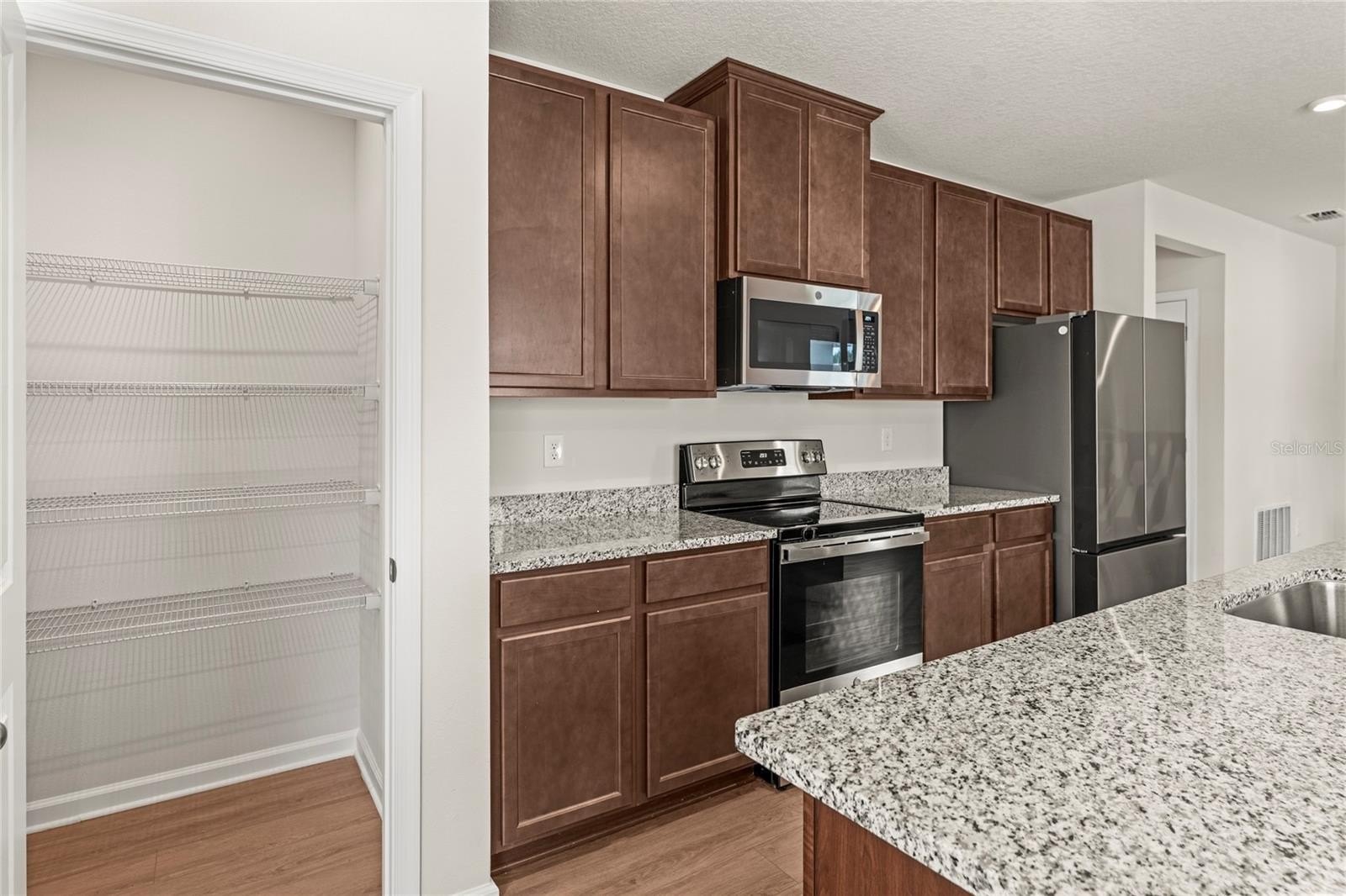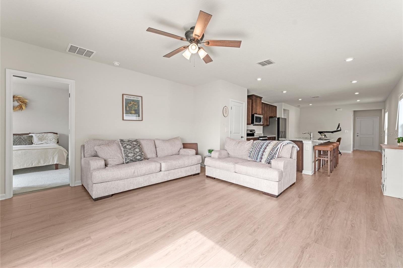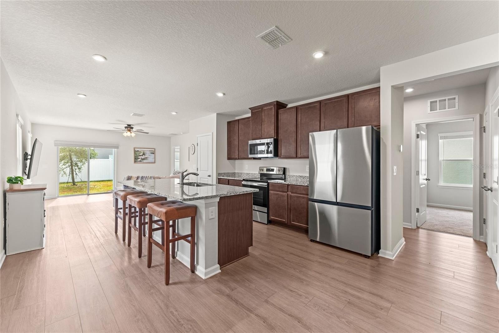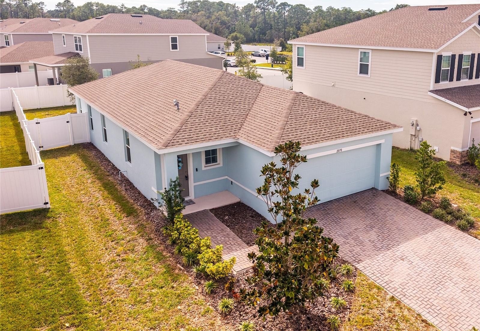 Stop waiting for new construction and secure your move-in ready dream home today! This beautiful, like-new 3-bedroom, 2-bath residence is perfectly designed for the modern first-time homeowner. The heart of the home is the spacious kitchen, which boasts abundant storage, elegant granite countertops, and a full suite of stainless steel appliances. It flows seamlessly into the large family room, creating an open and engaging living space perfect for relaxing or entertaining while overlooking the backyard. The home features a desirable split-bedroom floor plan for privacy. The generous primary bedroom is a true retreat, complete with a large walk-in closet and a private en-suite bathroom featuring a convenient double-sink vanity and comfort-height counters. Luxury vinyl plank flooring extends throughout all the main living areas, offering durability and style, while plush carpet provides comfort in the bedrooms. Practicality is key with secondary bedrooms that offer great size, and an indoor laundry room with easy access to the garage. Outside, the backyard is secured with a beautiful, brand-new vinyl fence and gates on both sides, making it ideal for pets, or future landscaping plans. Beyond your front door, the community offers resort-style amenities, including a refreshing pool and cabana, a fun playground, and miles of scenic walking trails. Location is everything: you'll enjoy fantastic proximity to the charm of Historic Downtown DeLand and the sun-kissed sands of New Smyrna Beach.